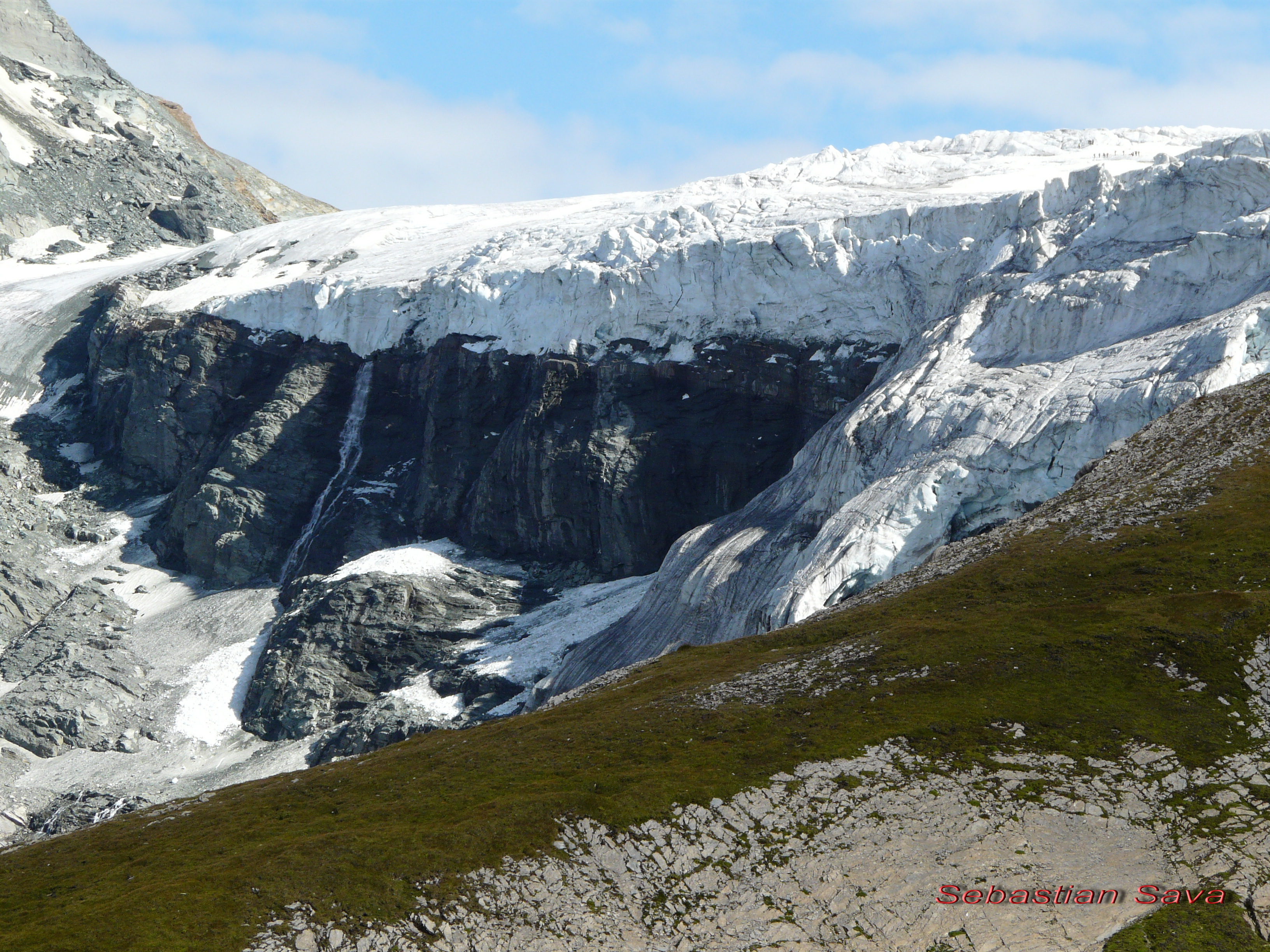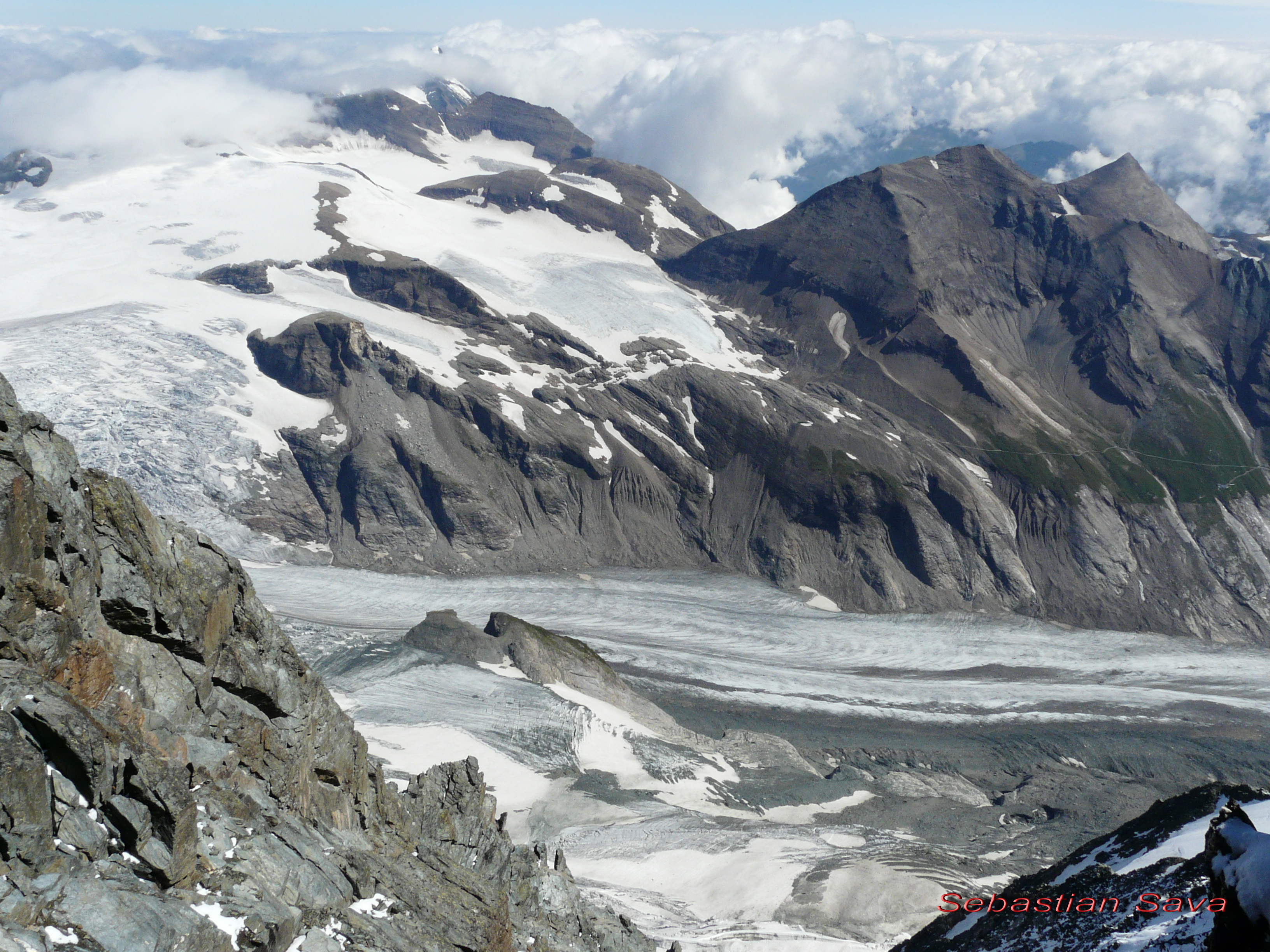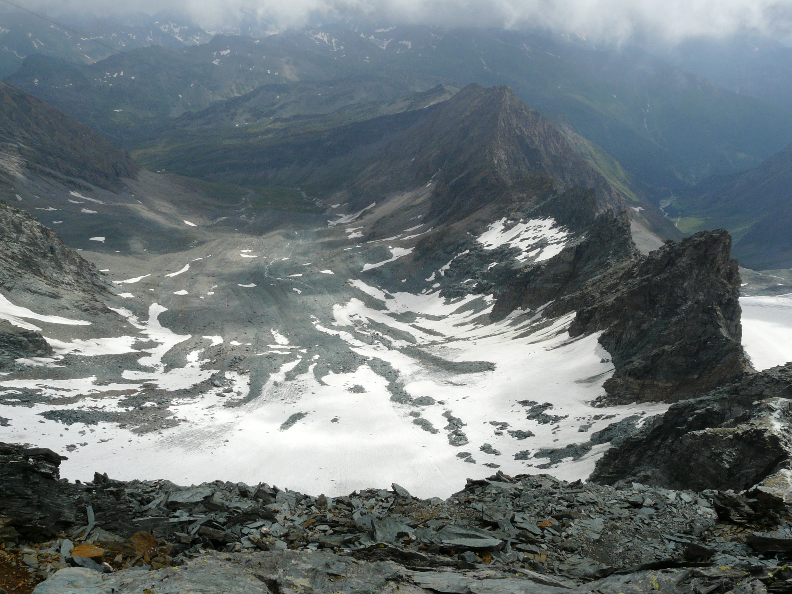 The tongue of Pasterze Glacier seen from Kleinglockner( 3770 m )Looking down at the bottom of the valley where Pasterze glacier moves slowly, on the north-east face of Grossglockner. Pasterze is the longest glacier in the Eastern Alps, approximately 8 km legth.