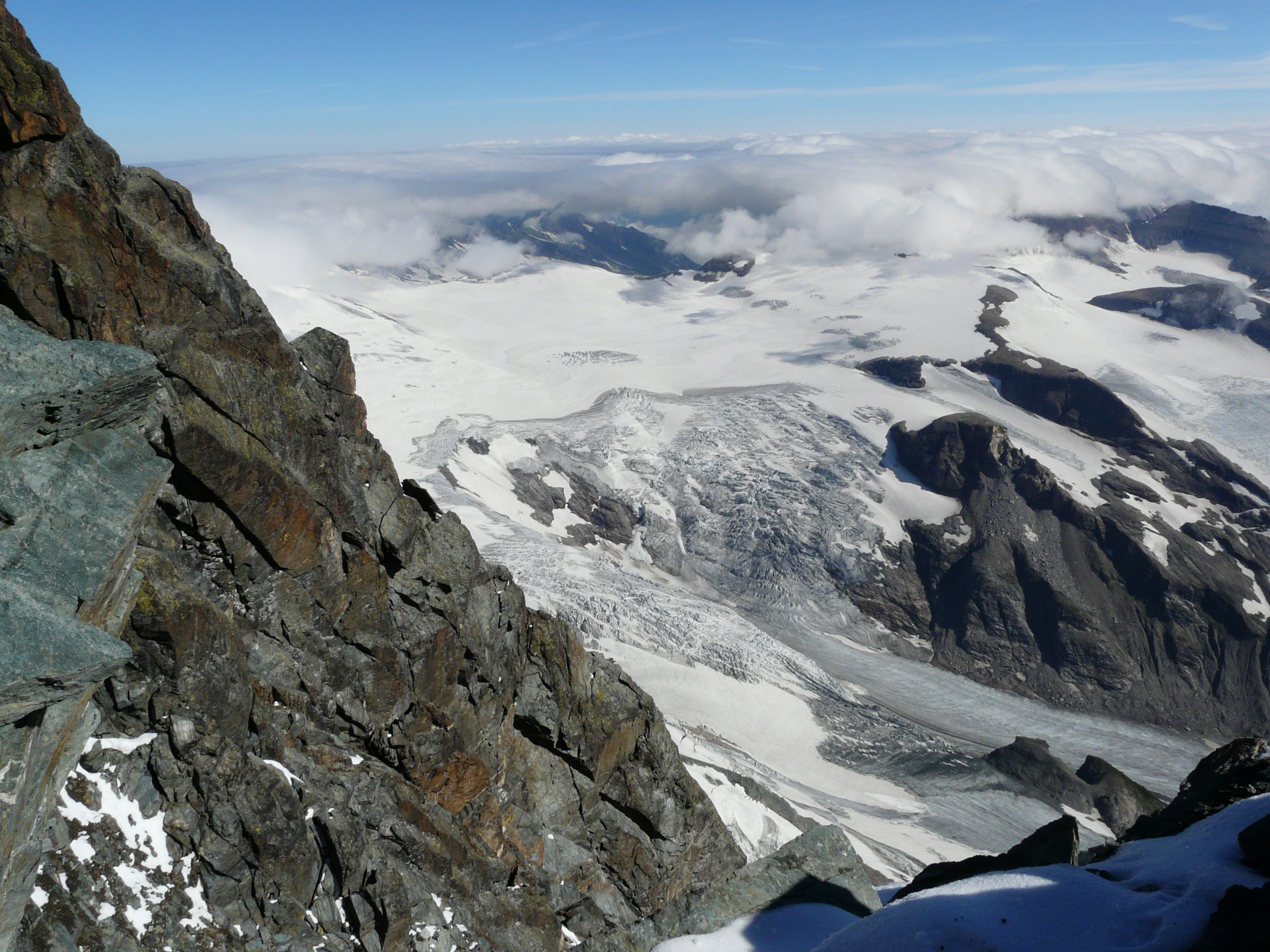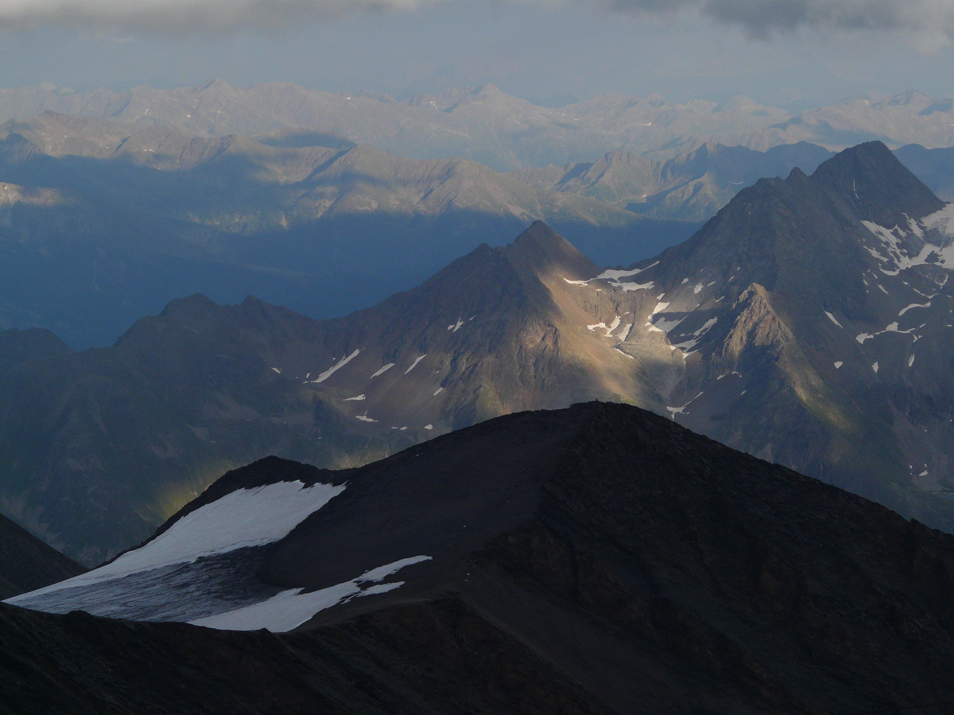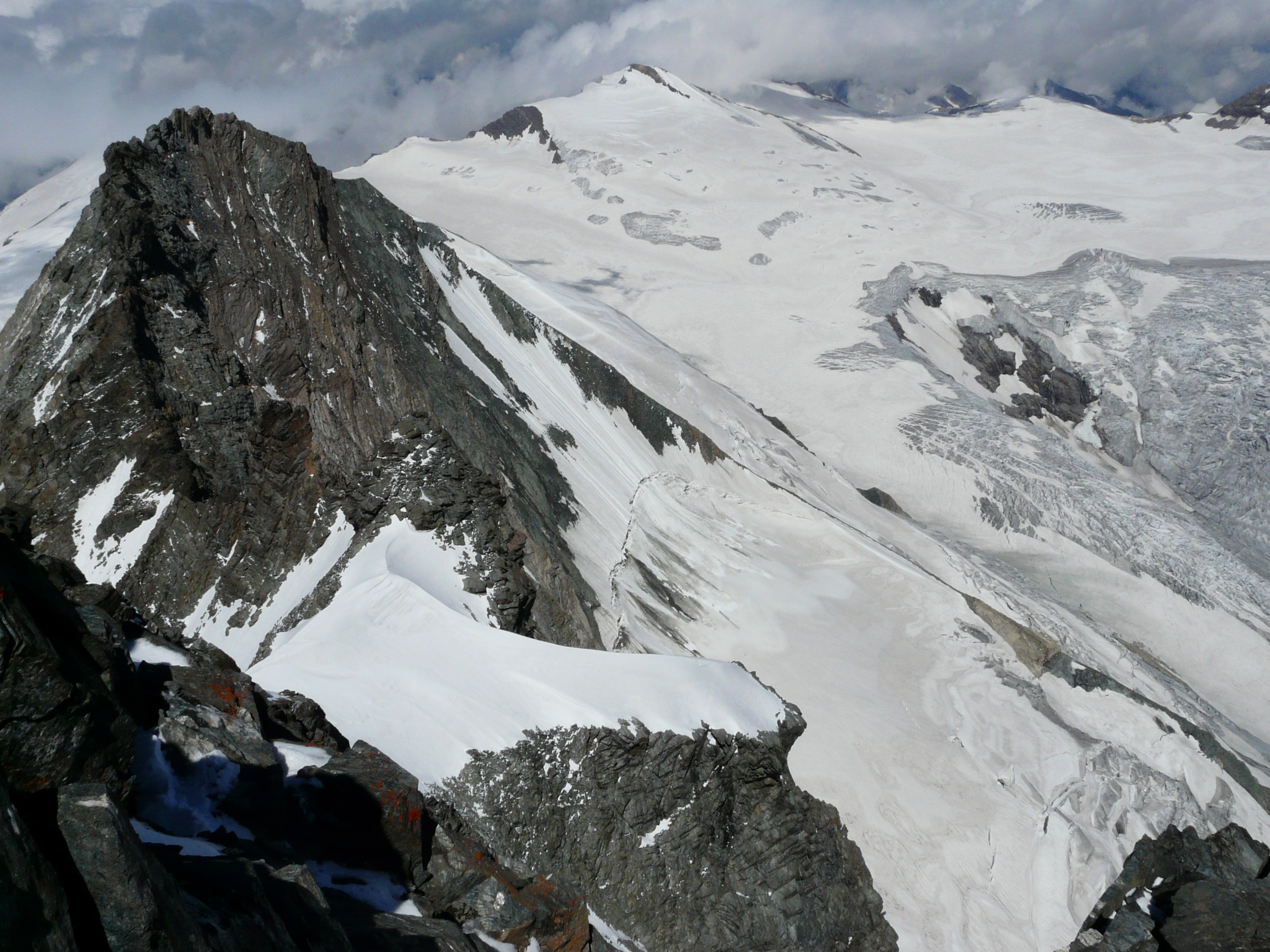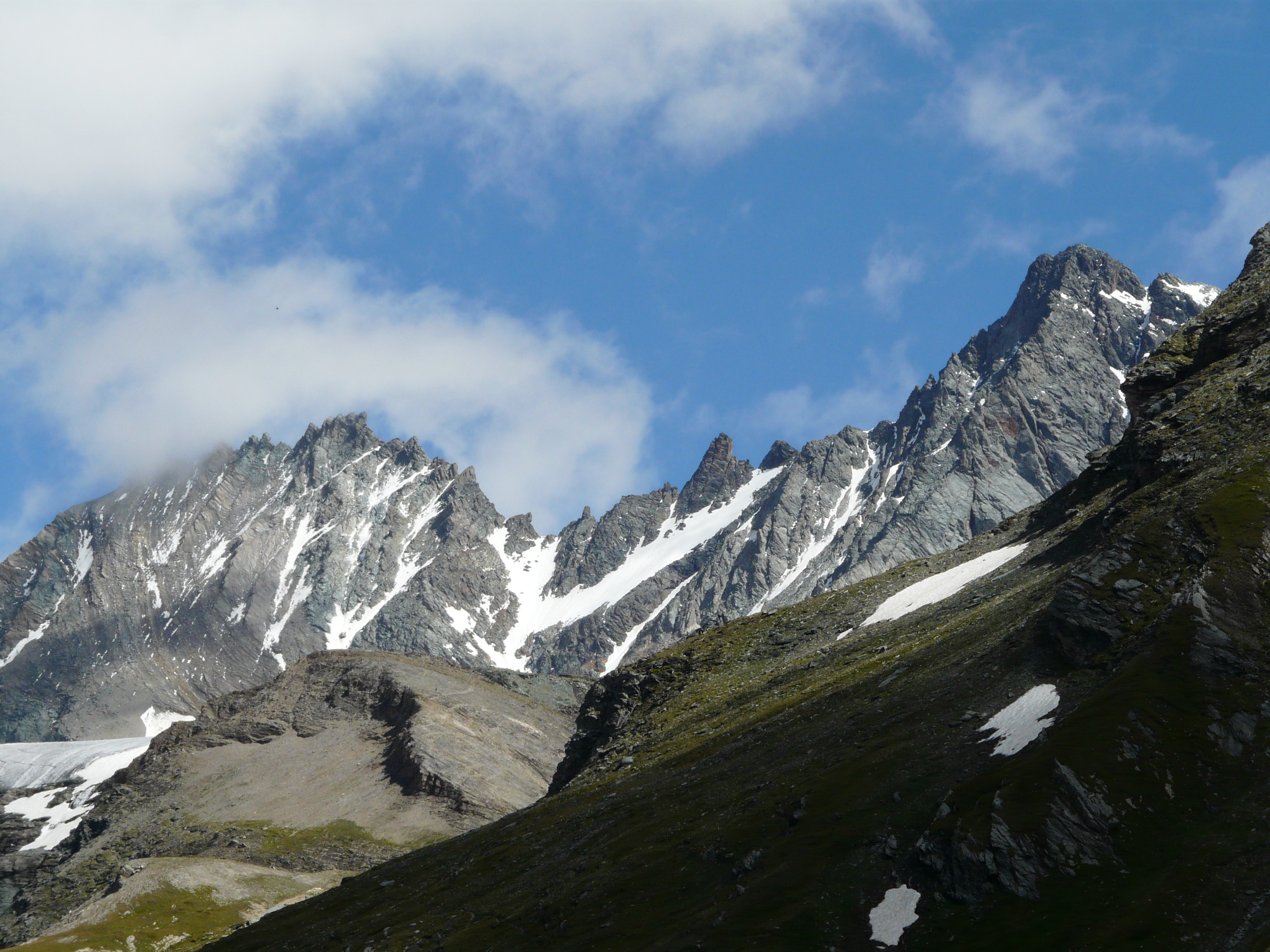 The view towards Glocknerwand (3721 m alt.) is amazing – so wild and remote. Its east face is marked by the long line of a bergschrund – a crevasse at the upper end of a mountain glacier that separates the moving ice of the glacier from the stagnant ice above.