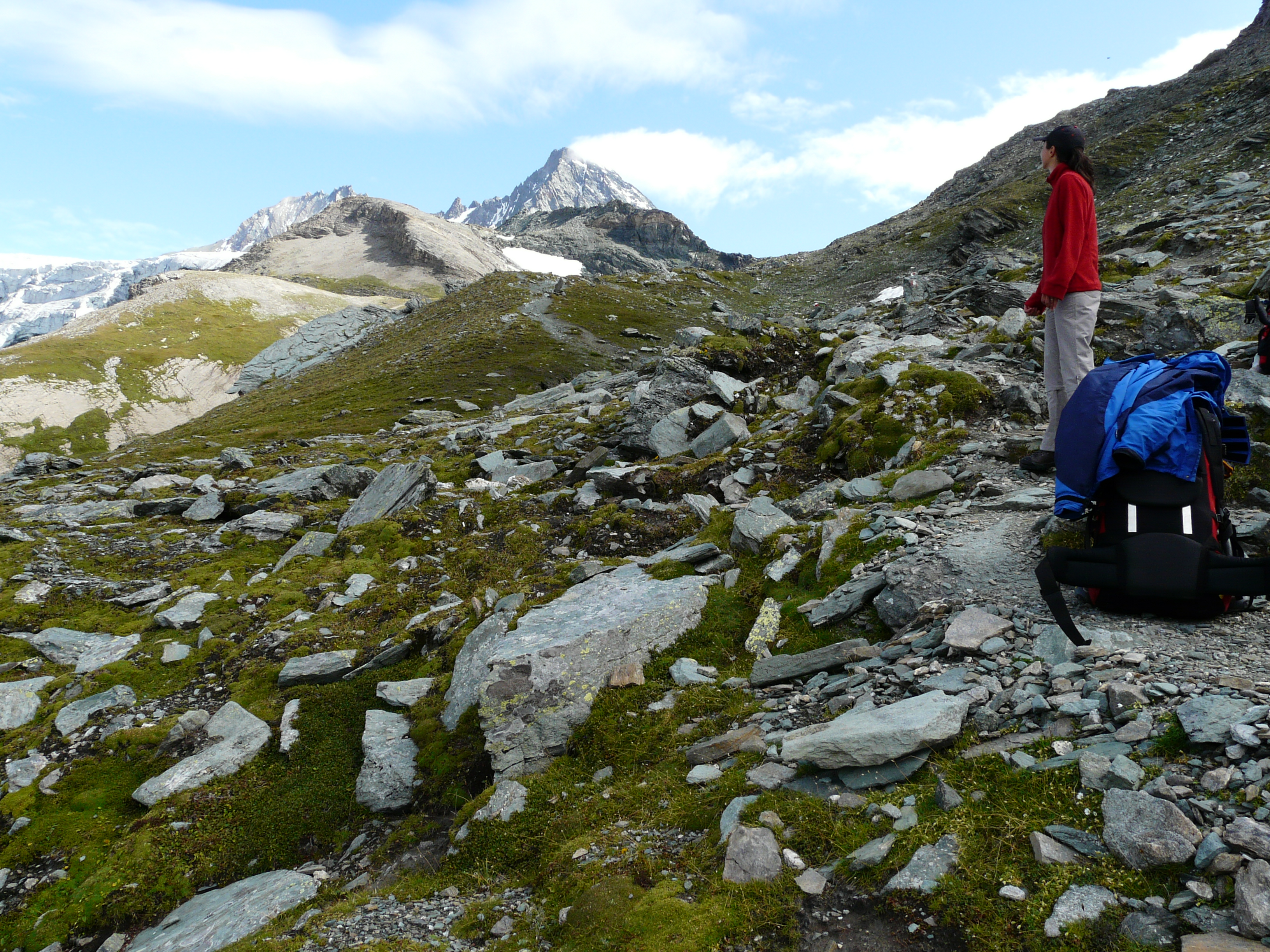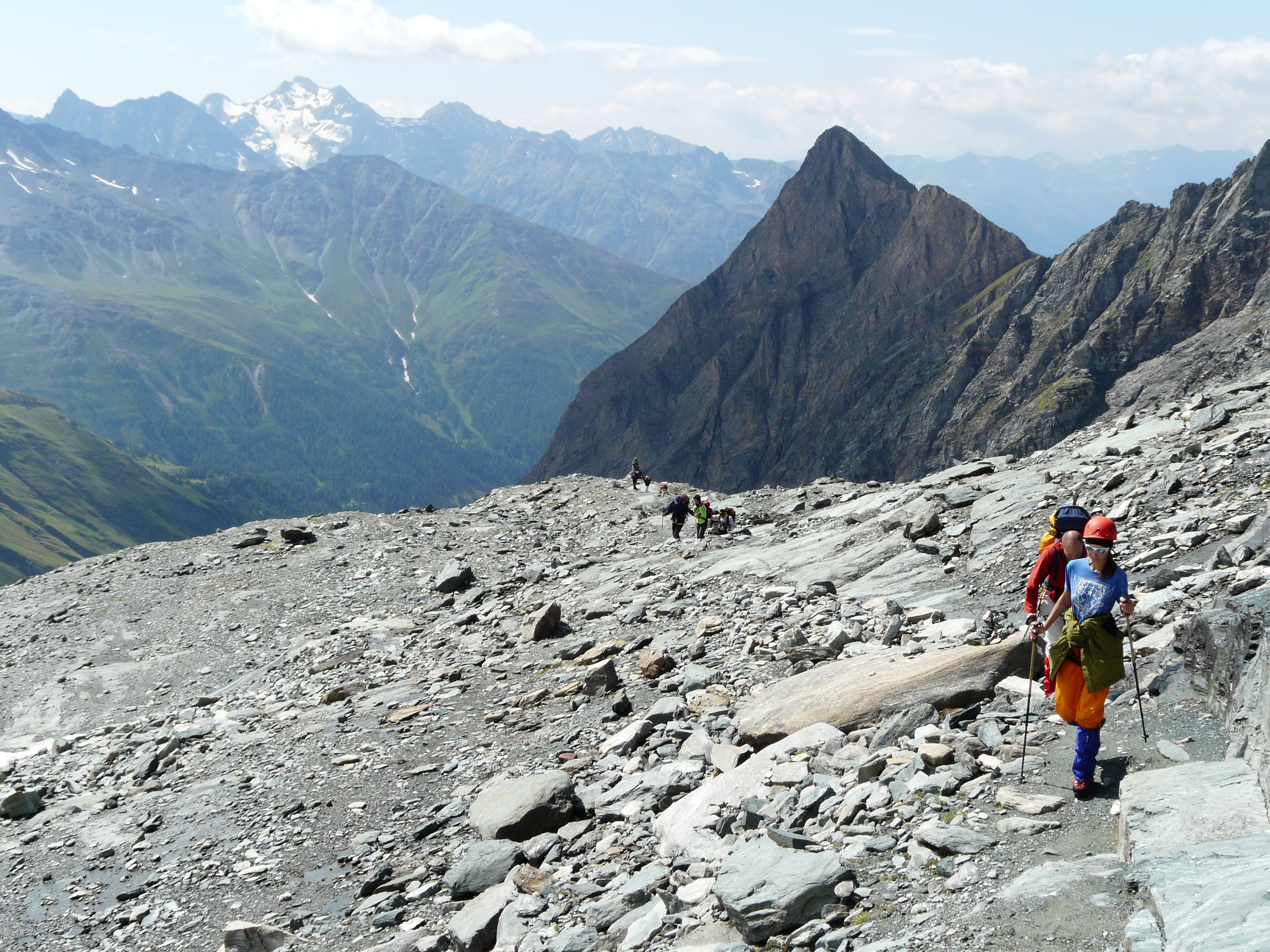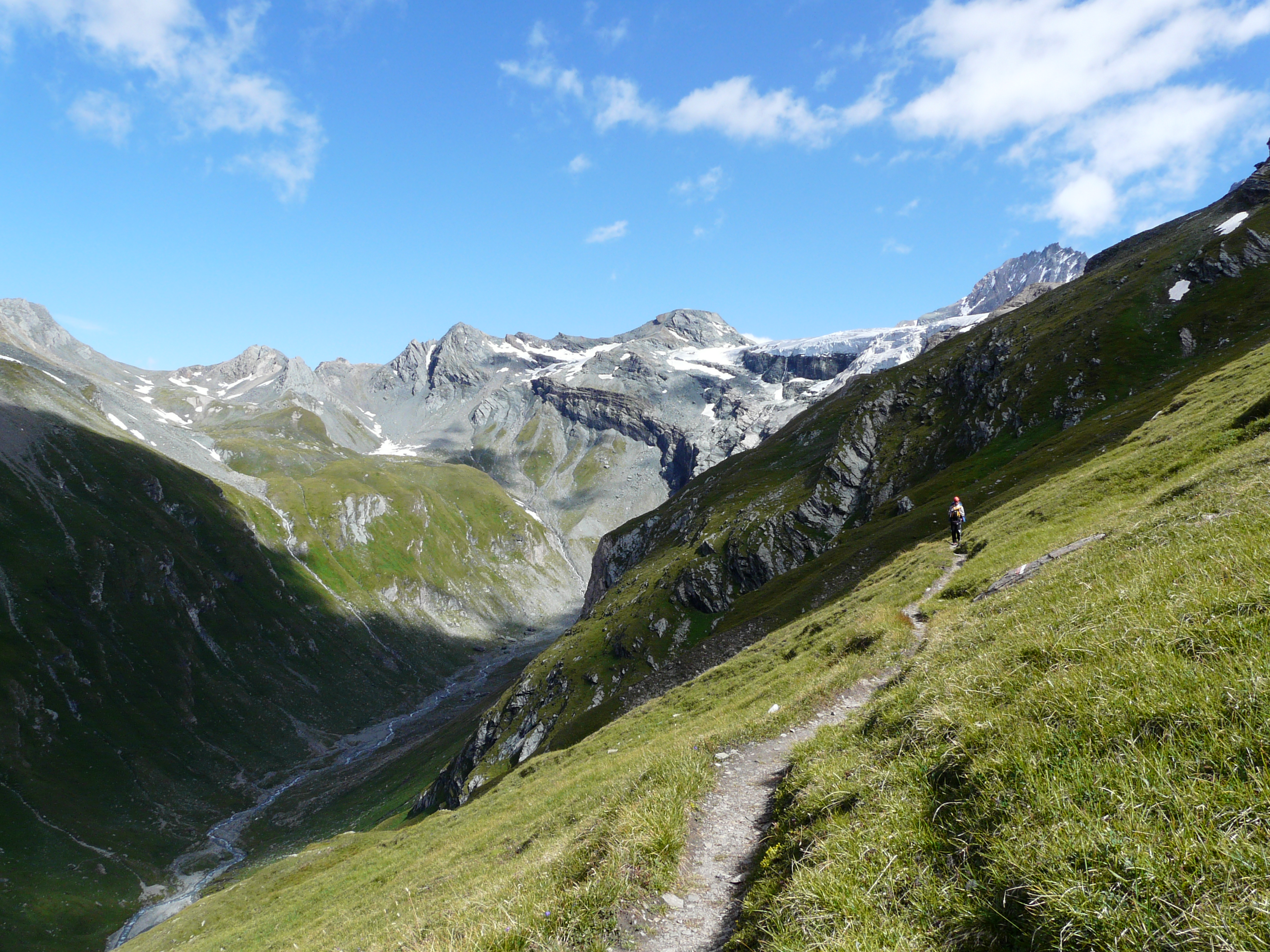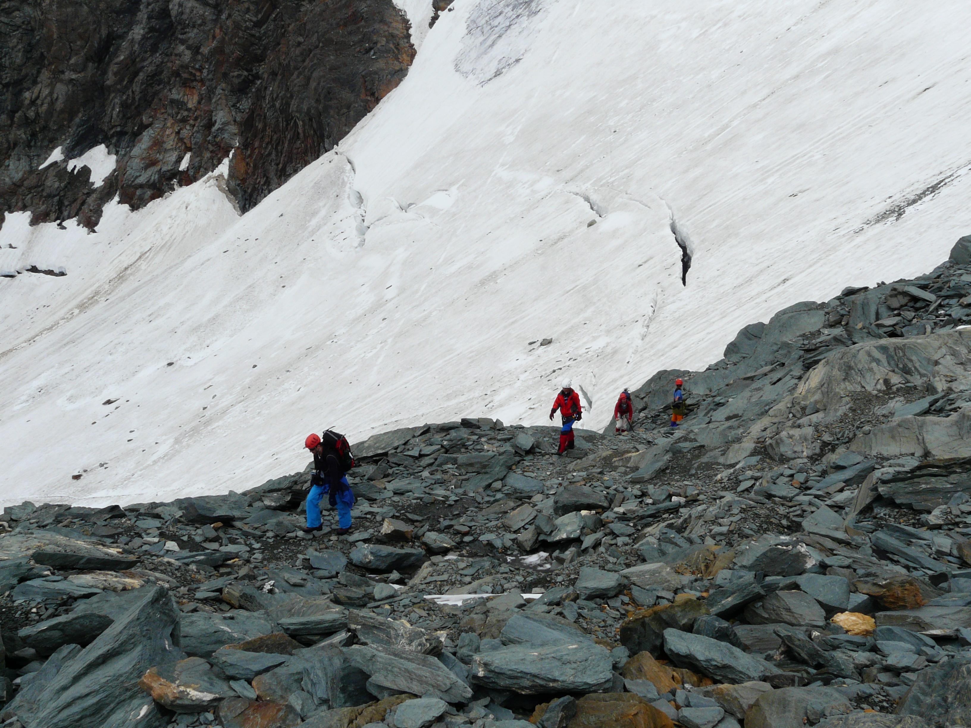 The view towards Glocknerwand (3721 m alt.) is amazing – so wild and remote. Its east face is marked by the long line of a bergschrund – a crevasse at the upper end of a mountain glacier that separates the moving ice of the glacier from the stagnant ice above.