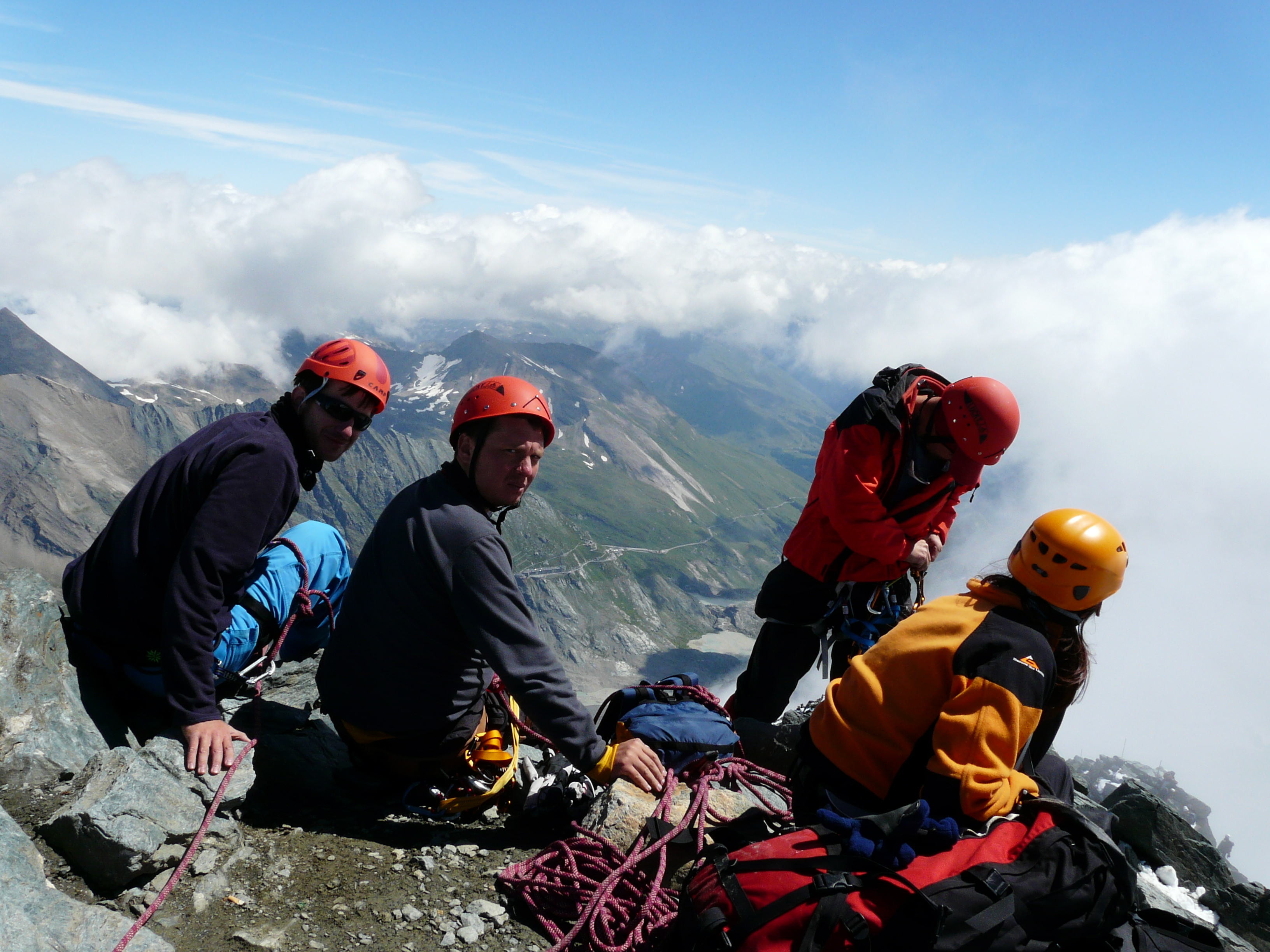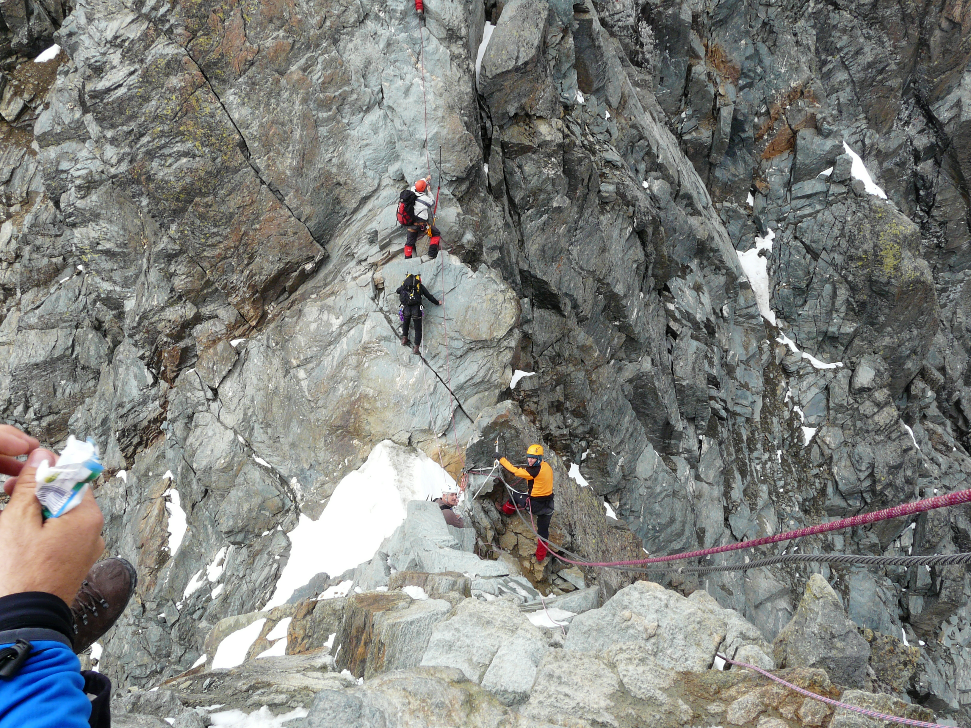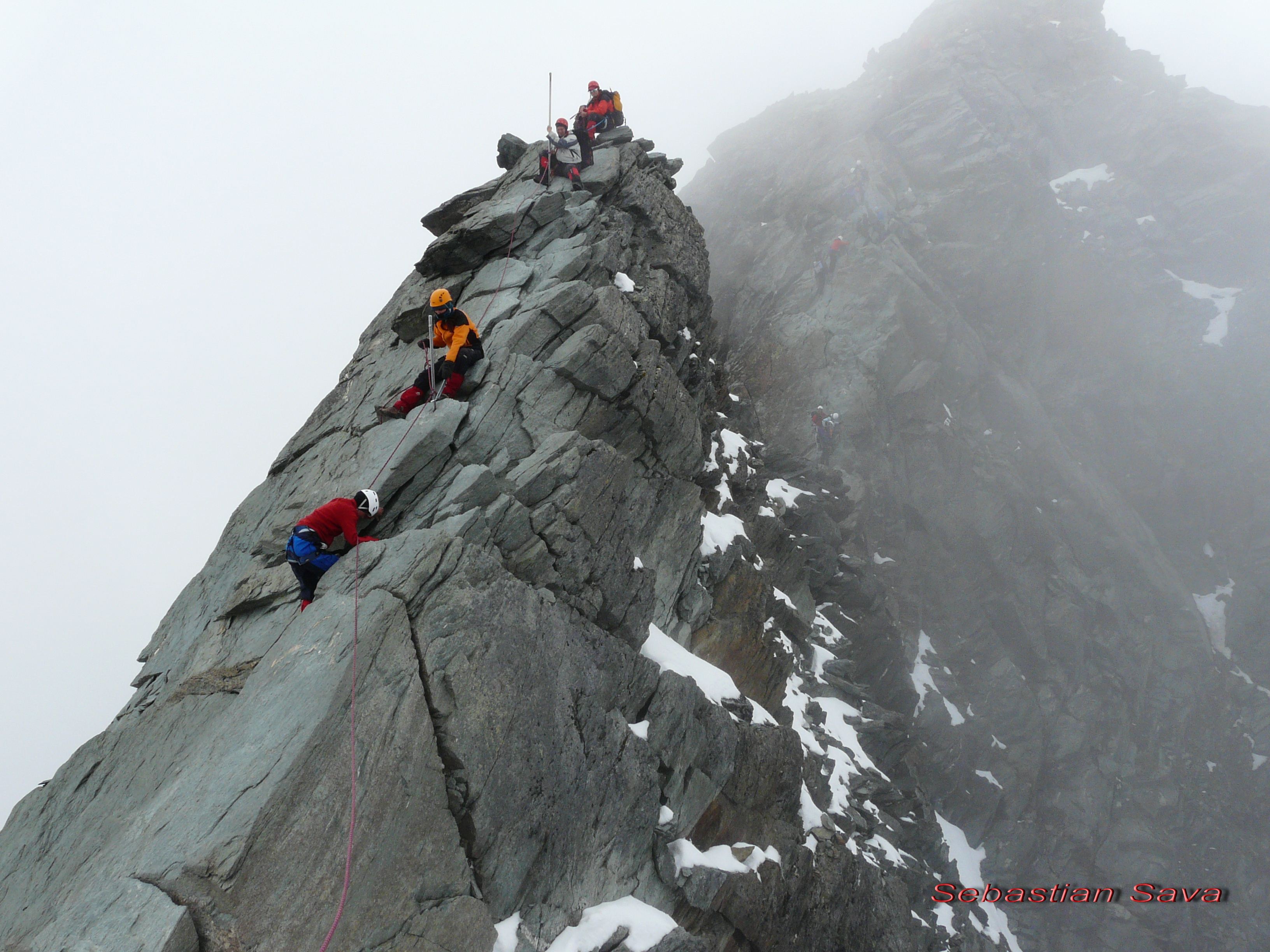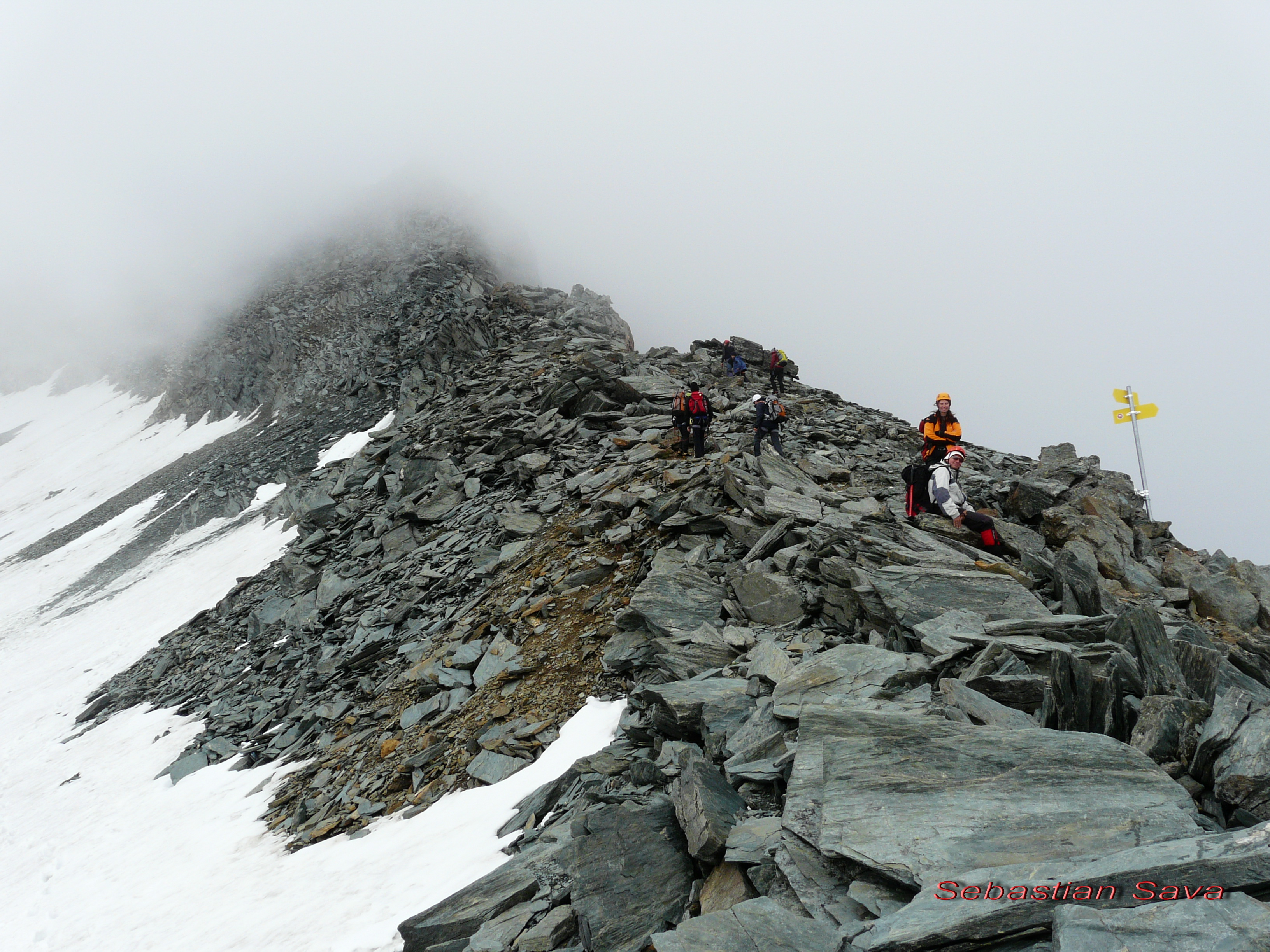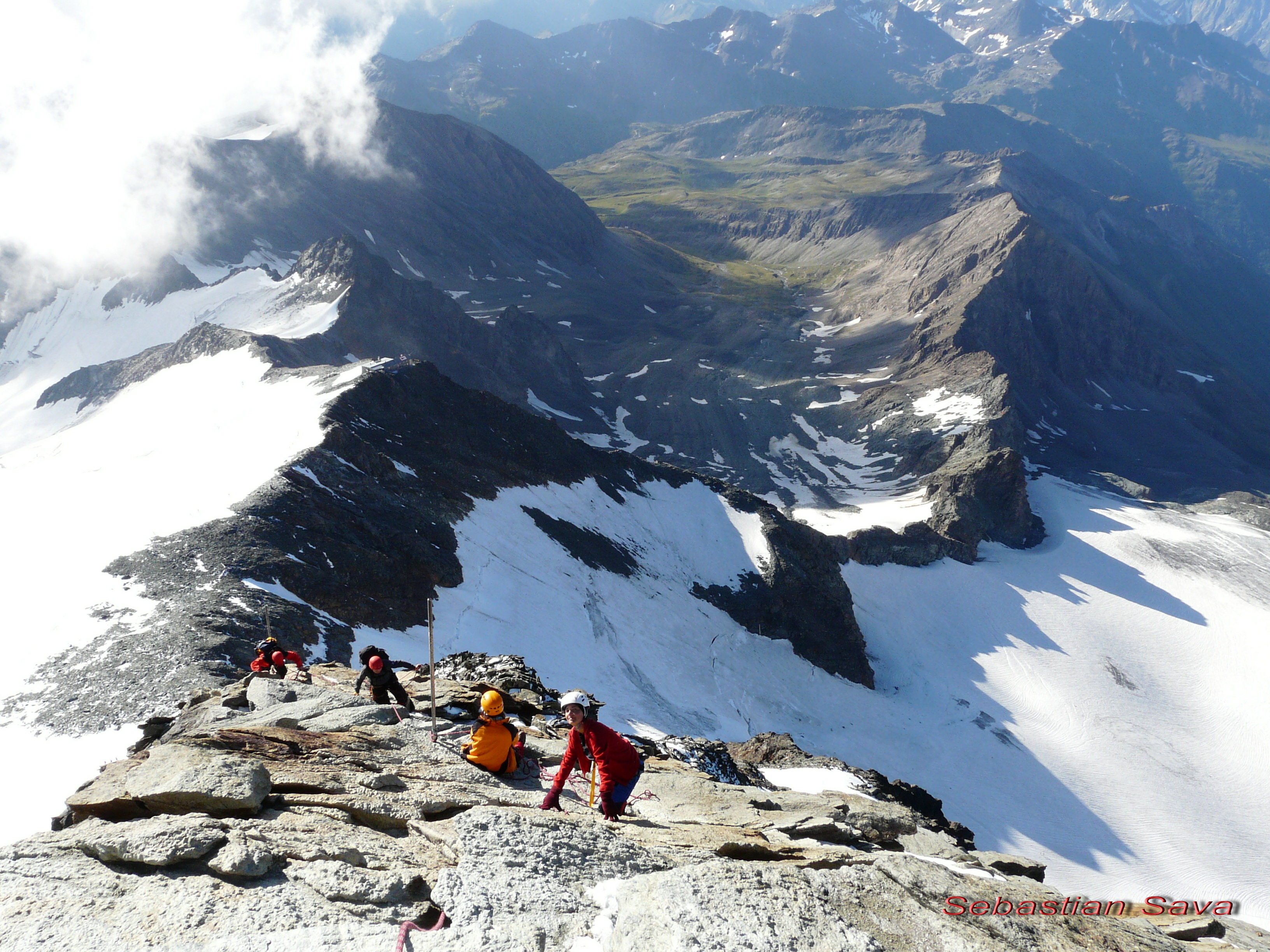 After crossing the entire ridge of Kleinglockner, we had to go down a bit to the small saddle that divides the Grossglockner from the Kleinglockner, called Obere Glocknerscharte. This short descent is a a drop of about 15 meters very well equiped with iron chain. The saddle is actualy a snow ridge with a length of about 8 meters and very narrow, just a few inches. This is the point where everybody loses a lot of time because the traverse must be done one by one.We’ve been obstructed almost 2 hours near that small and narrow saddle between Klein and Grossglockner, the highest col in Austria, at 3766 m altitude. This is the col as you look from above the drop.A total mess on that saddle, a traffic jam in its purest form. Parties going up, parties going down, some of them messing with the ropes of the others. As Cecil Davies said in his book Mountain Walking in Austria, the queue on Kleinglockner is an image of a supermarket check-out.