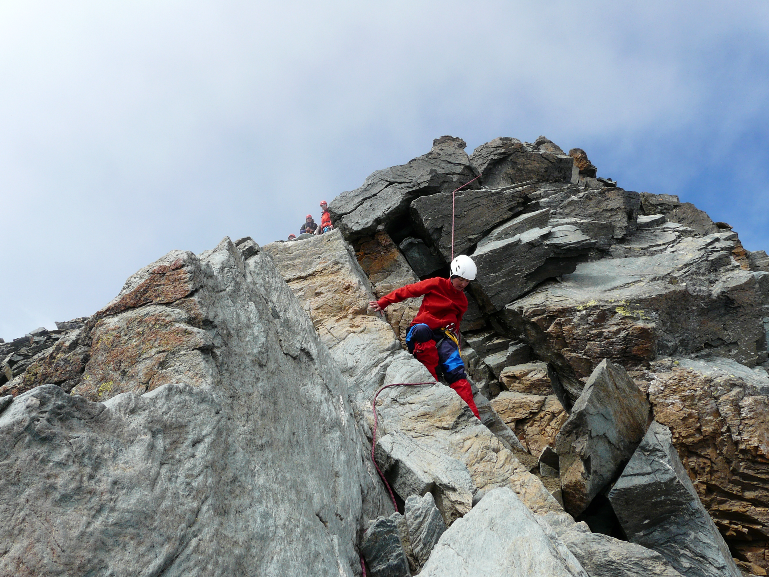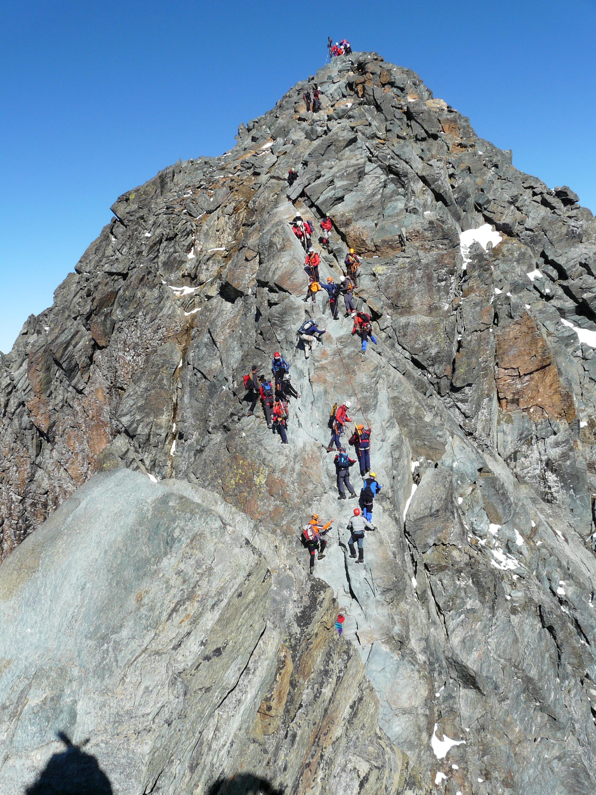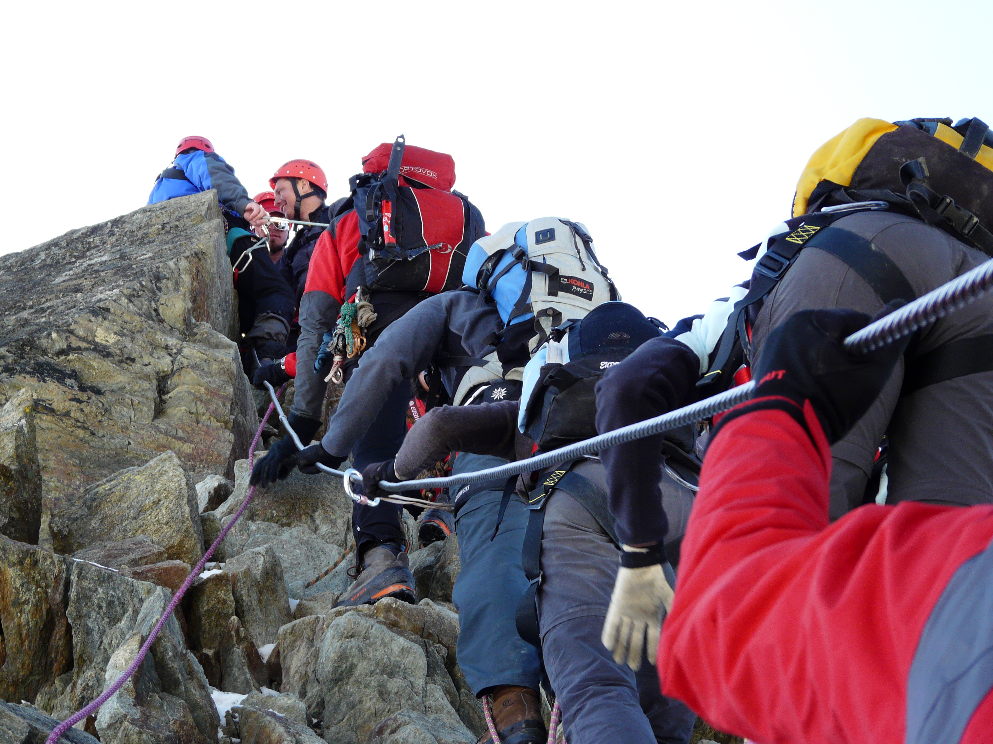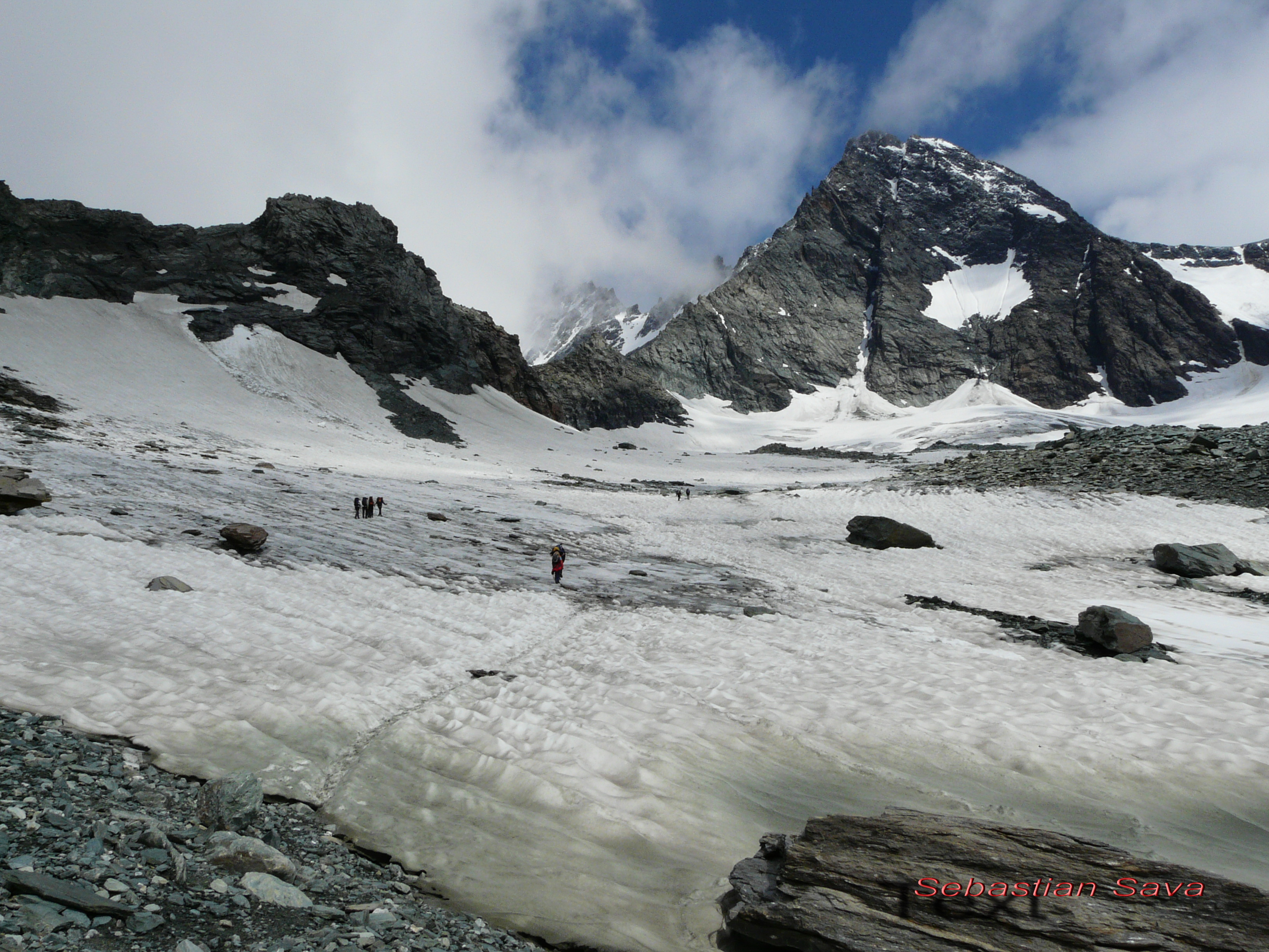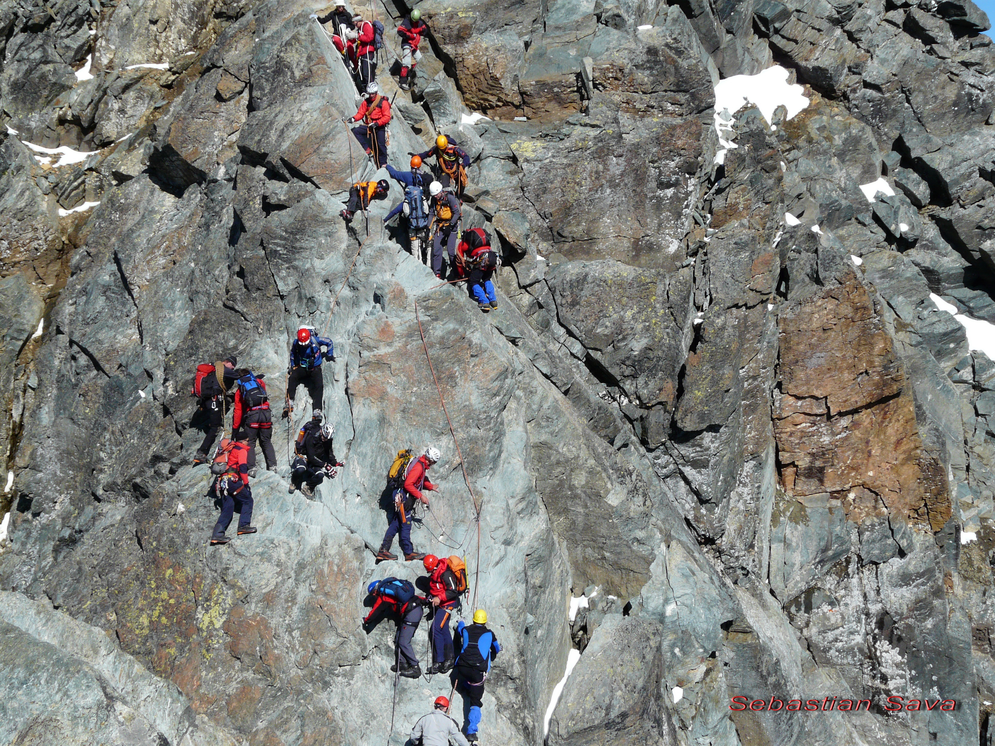After crossing the entire ridge of Kleinglockner, we had to go down a bit to the small saddle that divides the Grossglockner from the Kleinglockner, called Obere Glocknerscharte. This short descent is a a drop of about 15 meters very well equiped with iron chain. The saddle is actualy a snow ridge with a length of about 8 meters and very narrow, just a few inches. This is the point where everybody loses a lot of time because the traverse must be done one by one.We’ve been obstructed almost 2 hours near that small and narrow saddle between Klein and Grossglockner, the highest col in Austria, at 3766 m altitude. This is the col as you look from above the drop.A total mess on that saddle, a traffic jam in its purest form. Parties going up, parties going down, some of them messing with the ropes of the others. As Cecil Davies said in his book Mountain Walking in Austria, the queue on Kleinglockner is an image of a supermarket check-out.