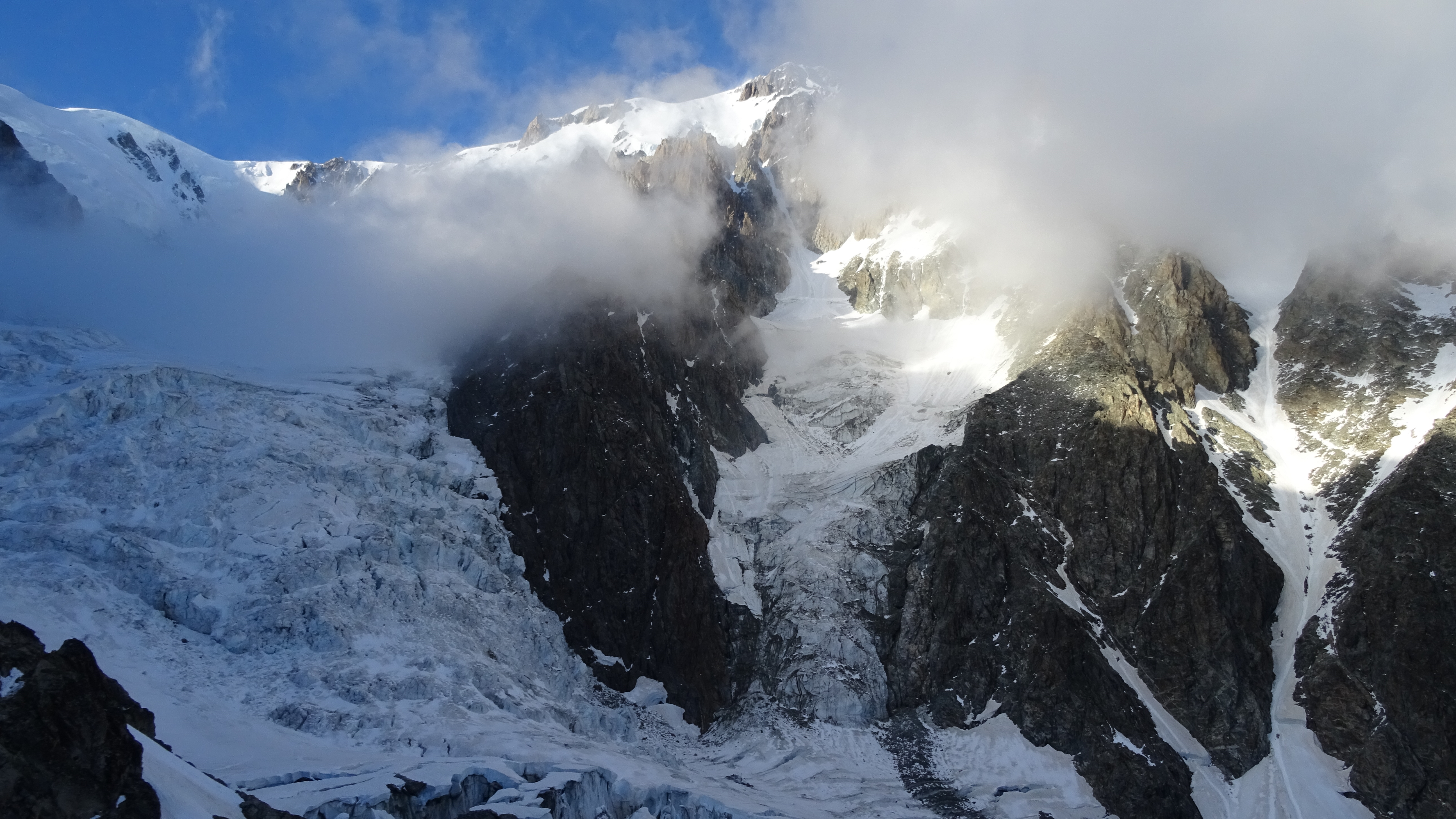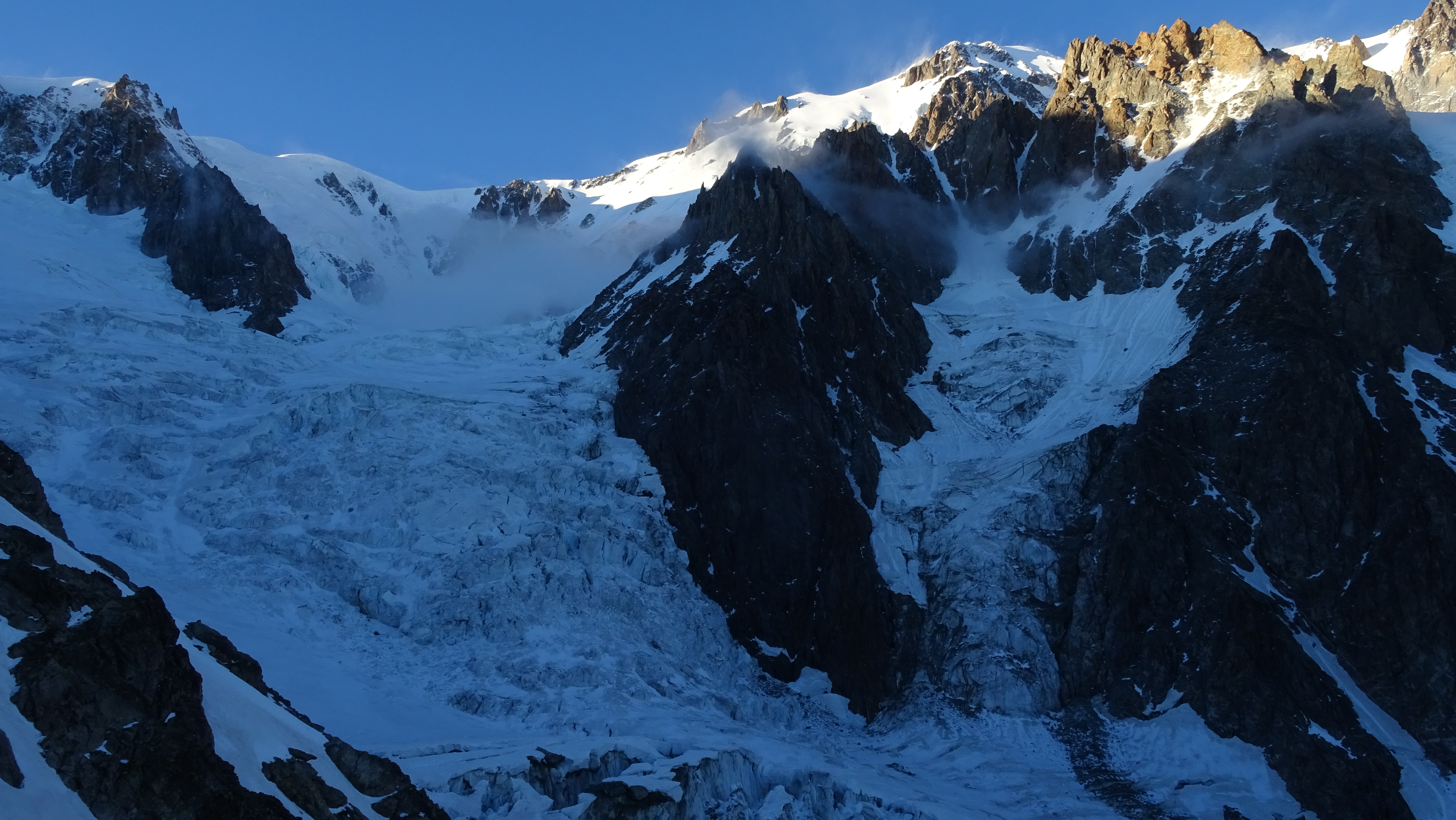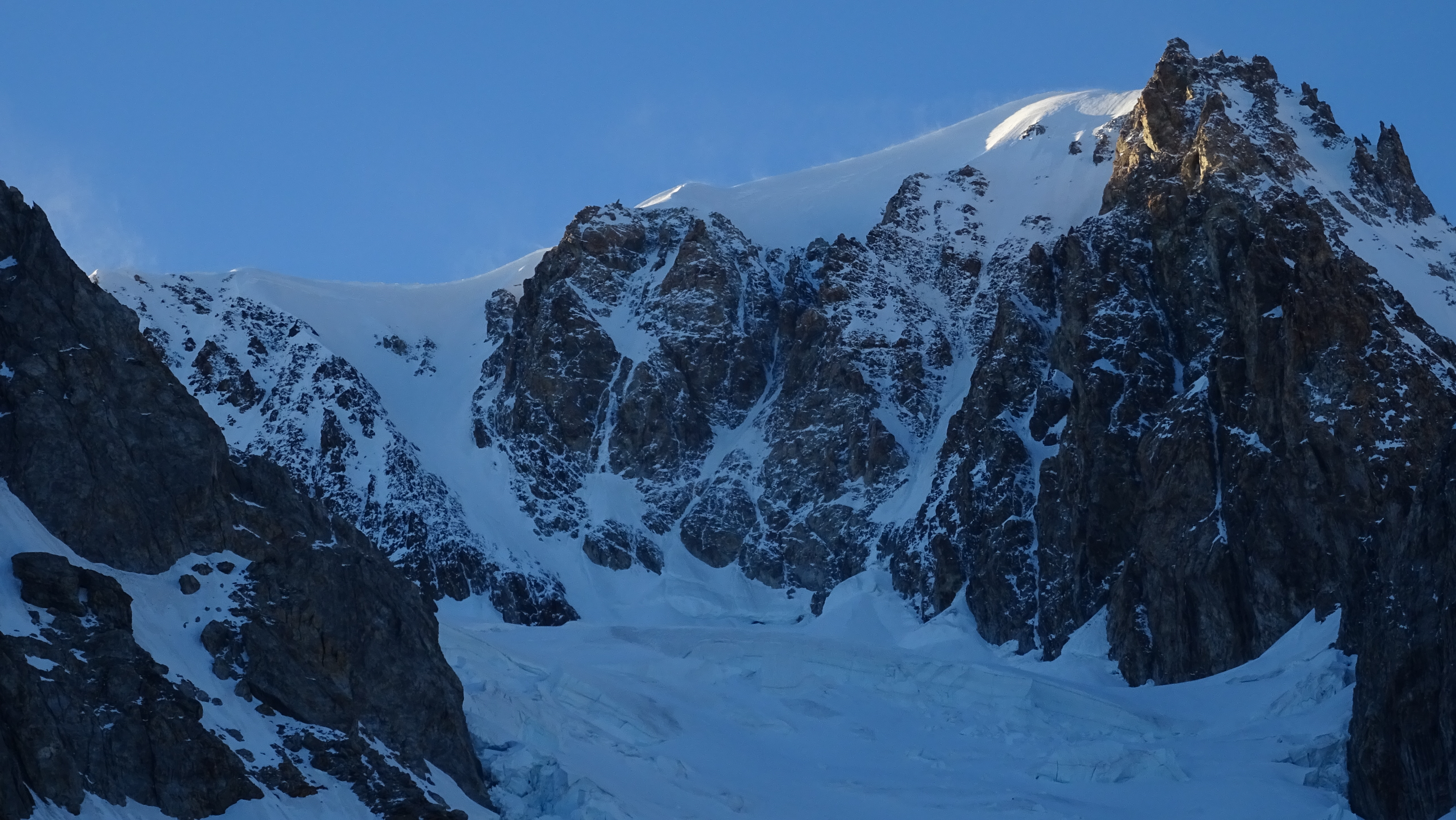 The S/SW face of Mont Blanc seen from Gonella hut. Dome glacier (left) and its almost vertical tributary.