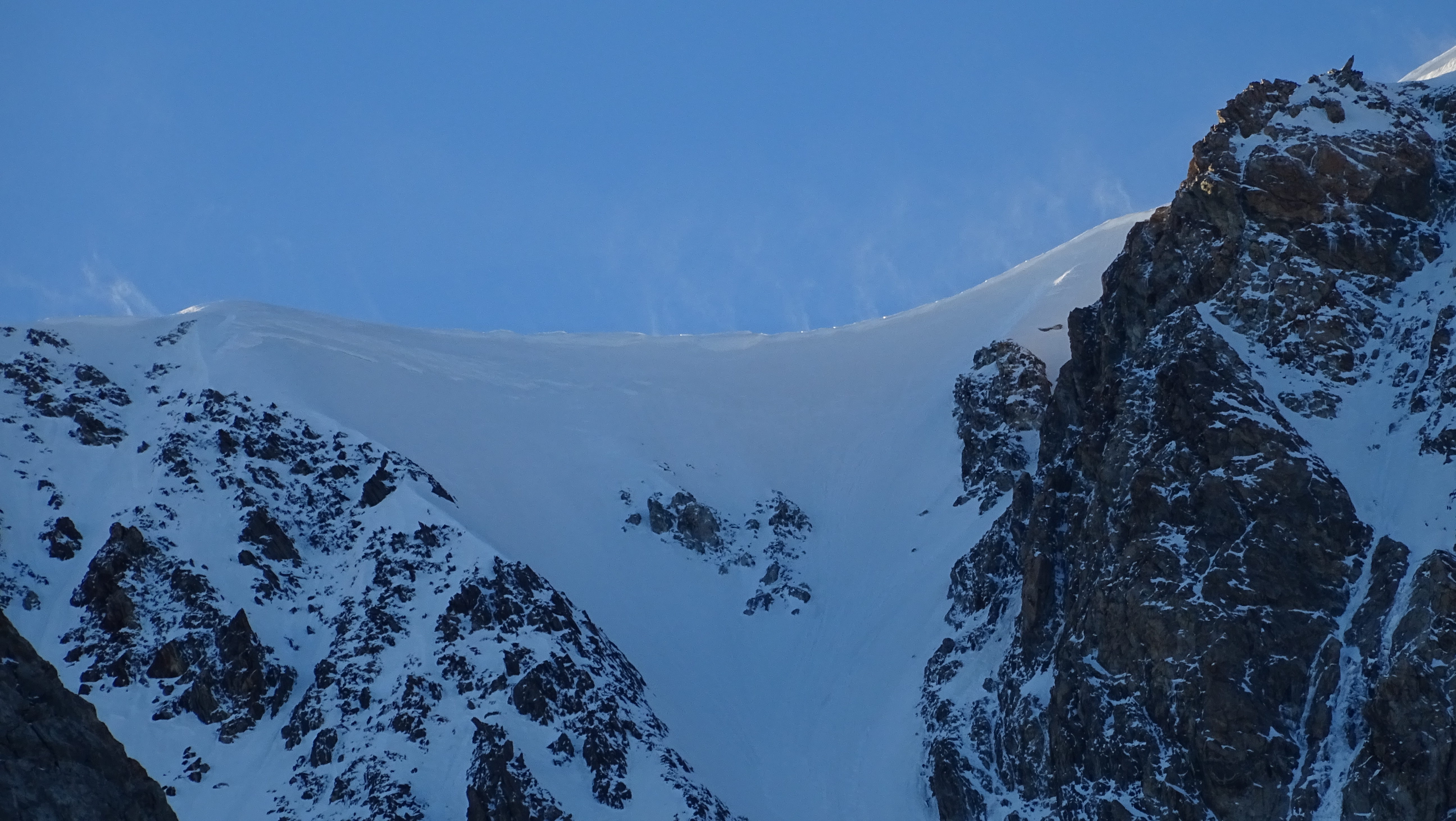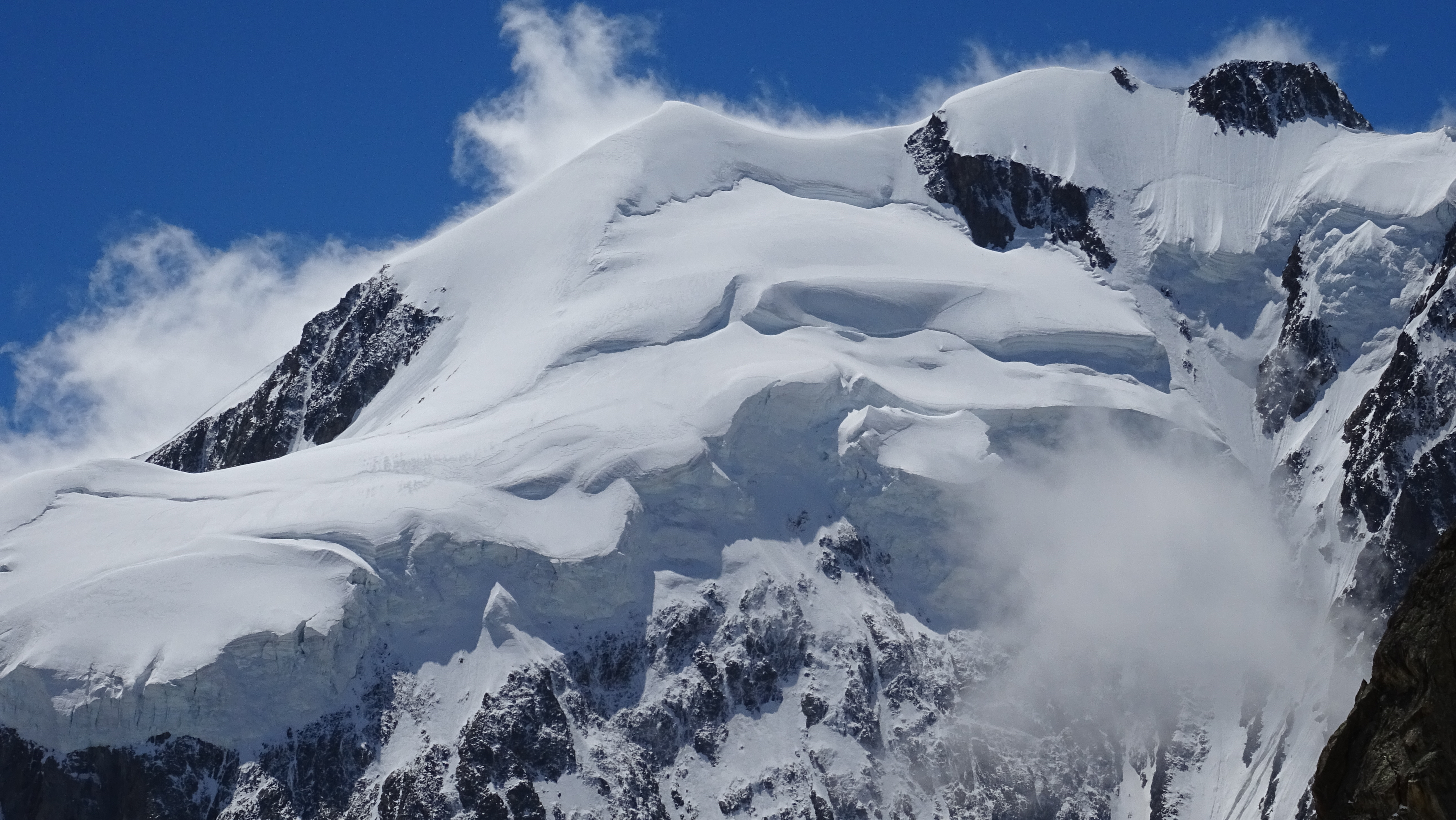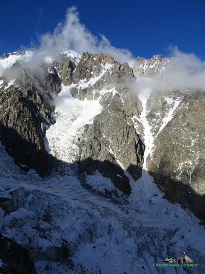 The S/SW face of Mont Blanc seen from Gonella hut. Dome glacier (left) and its almost vertical tributary.