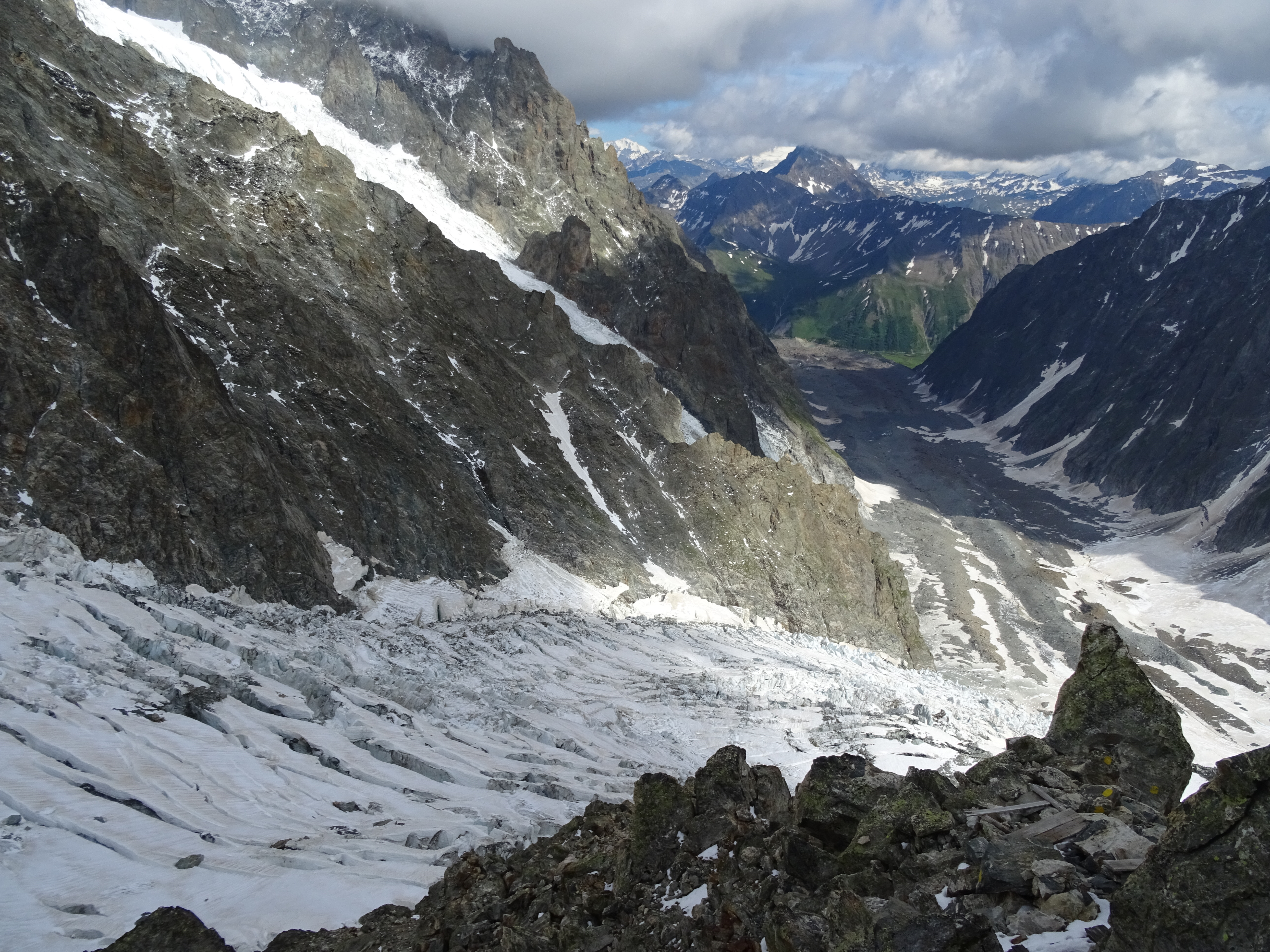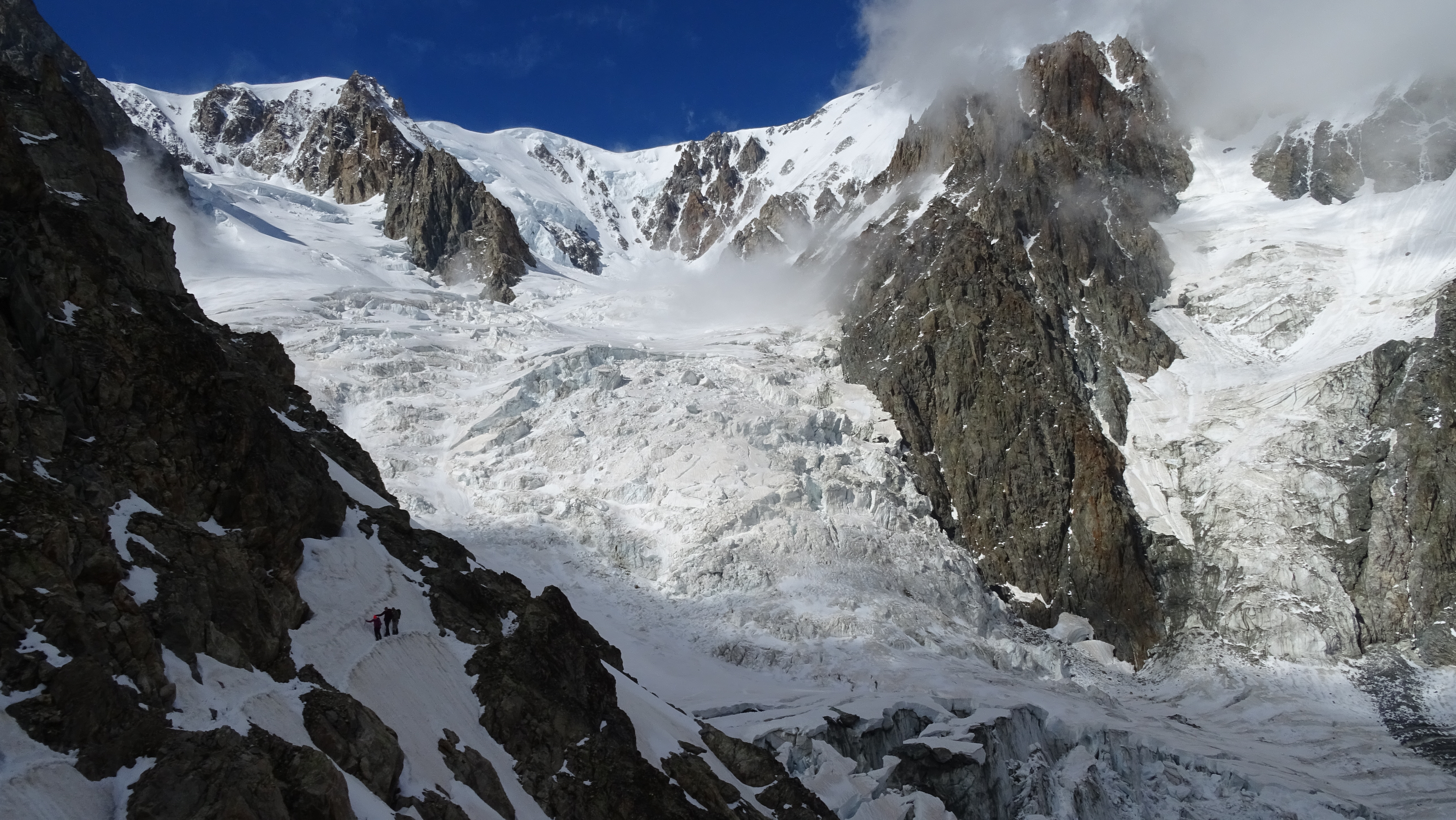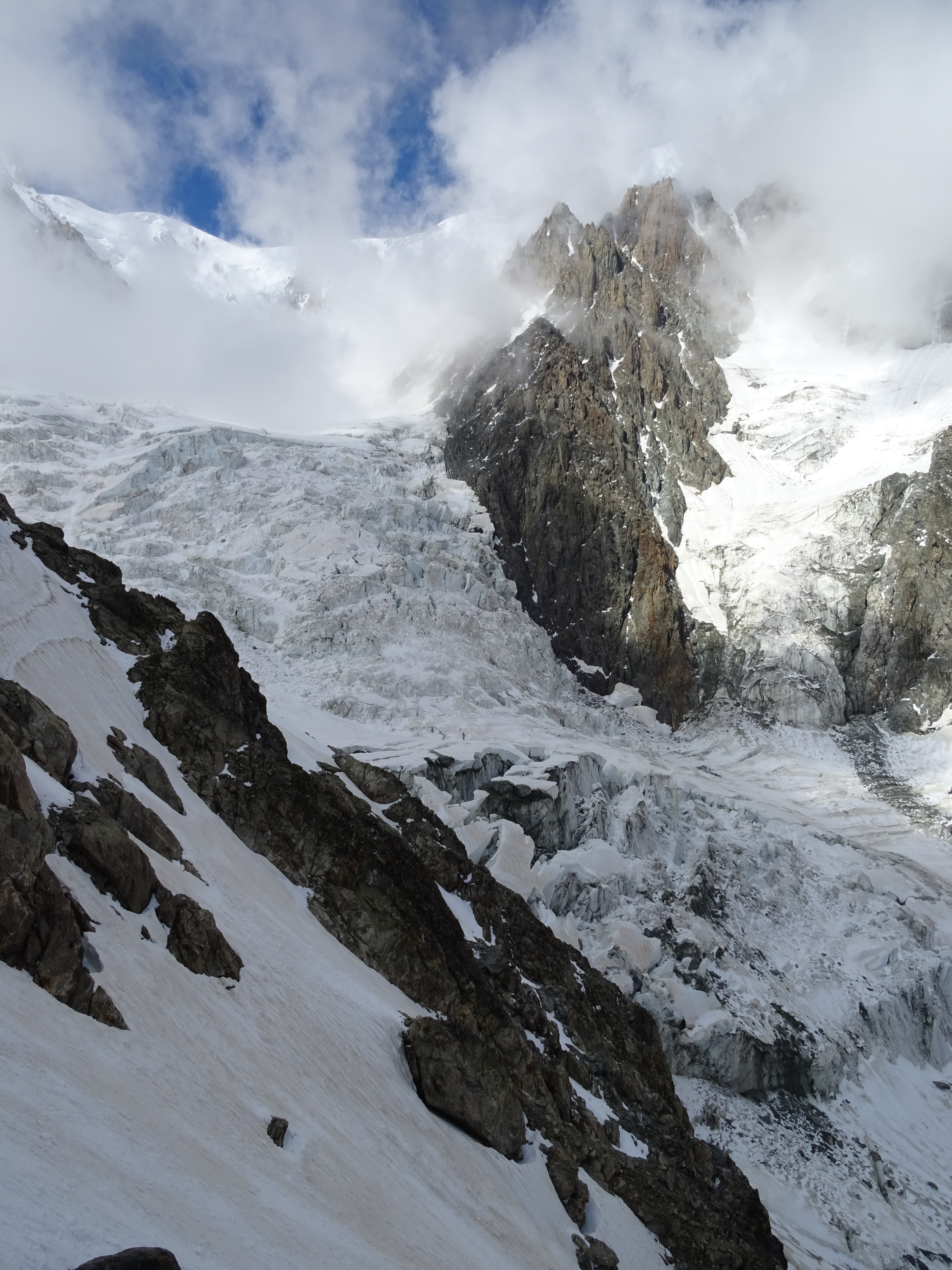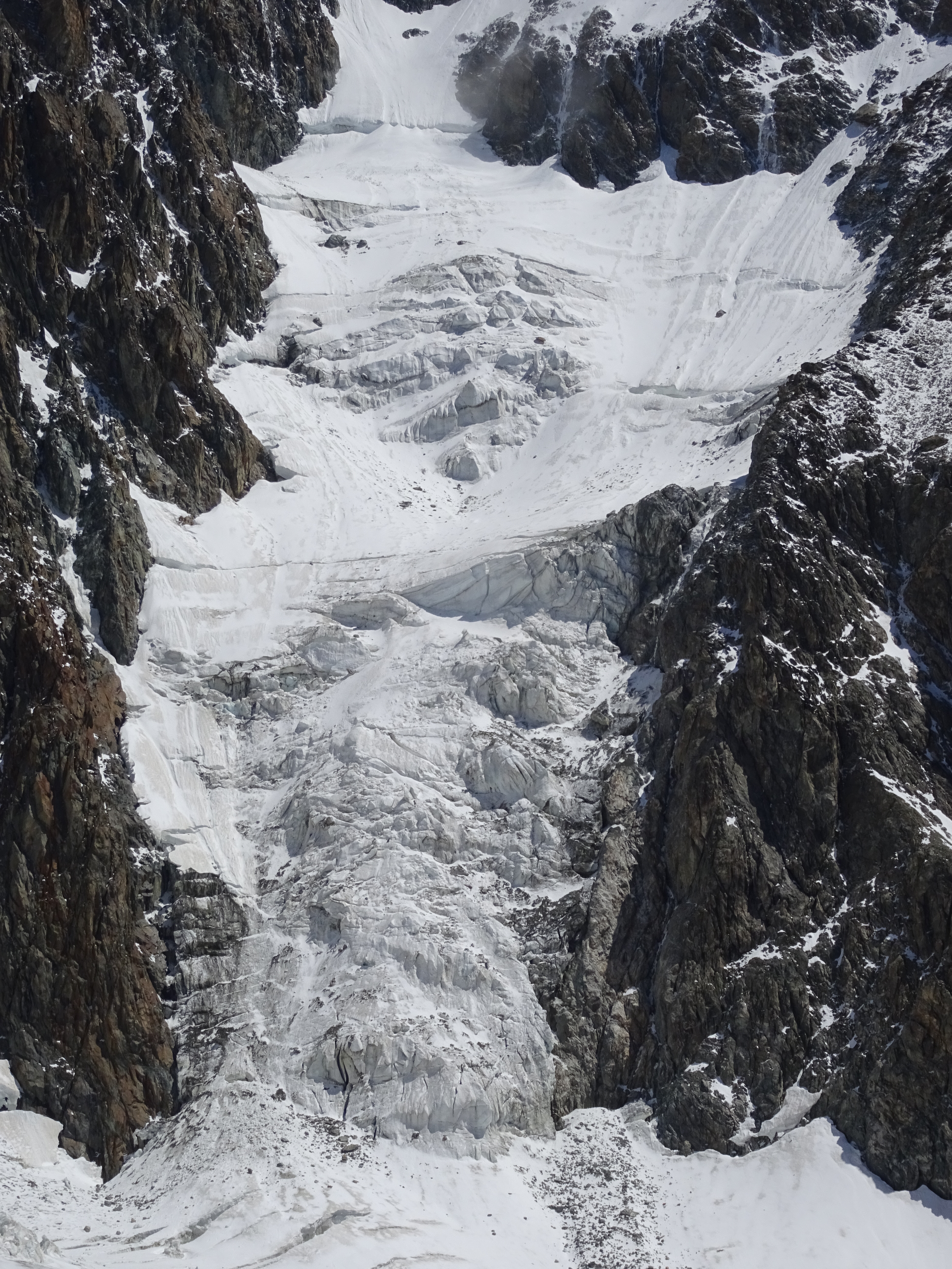 Dome glacier moving deep down the slopes to its confluence with Miage glacier