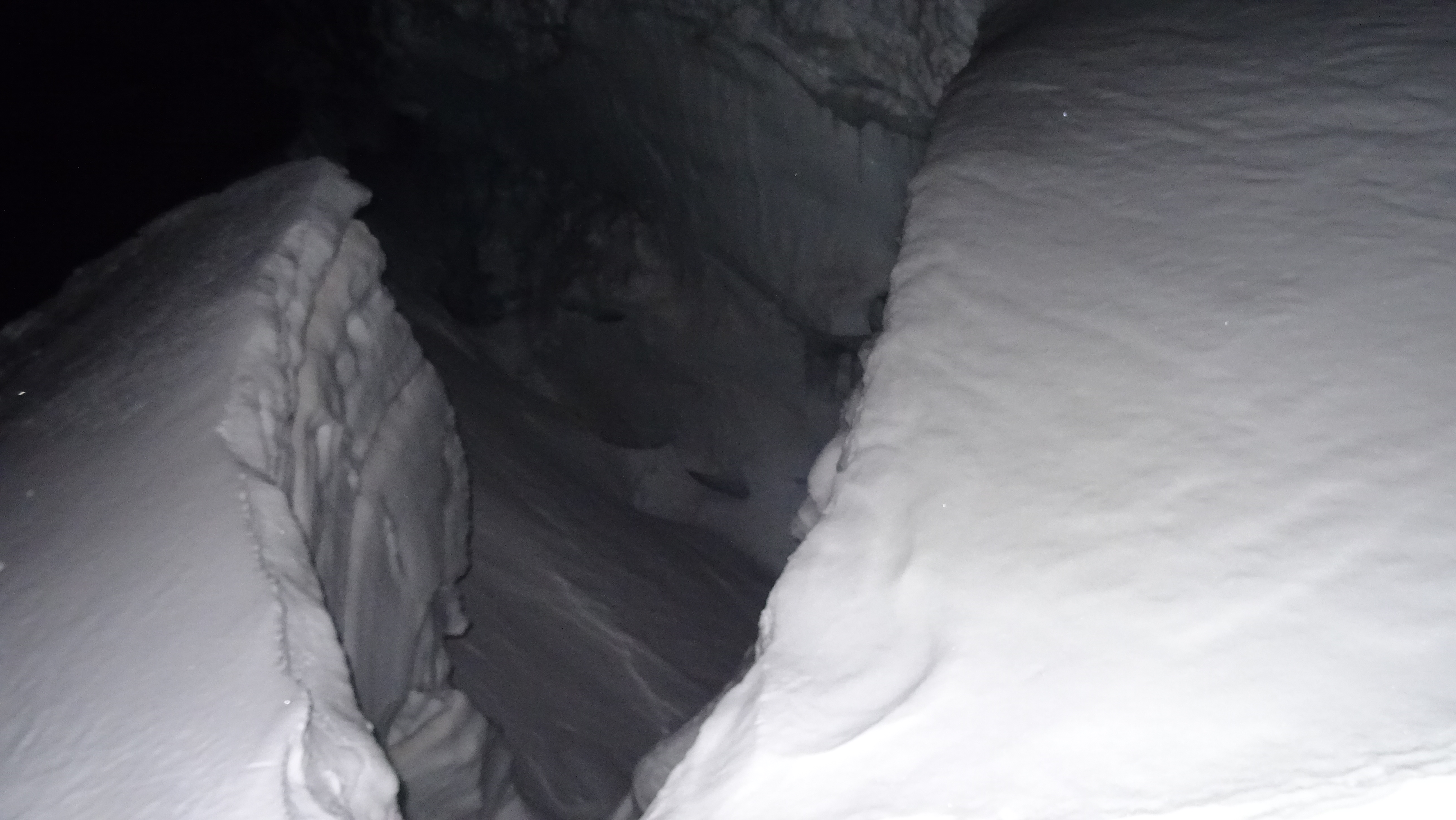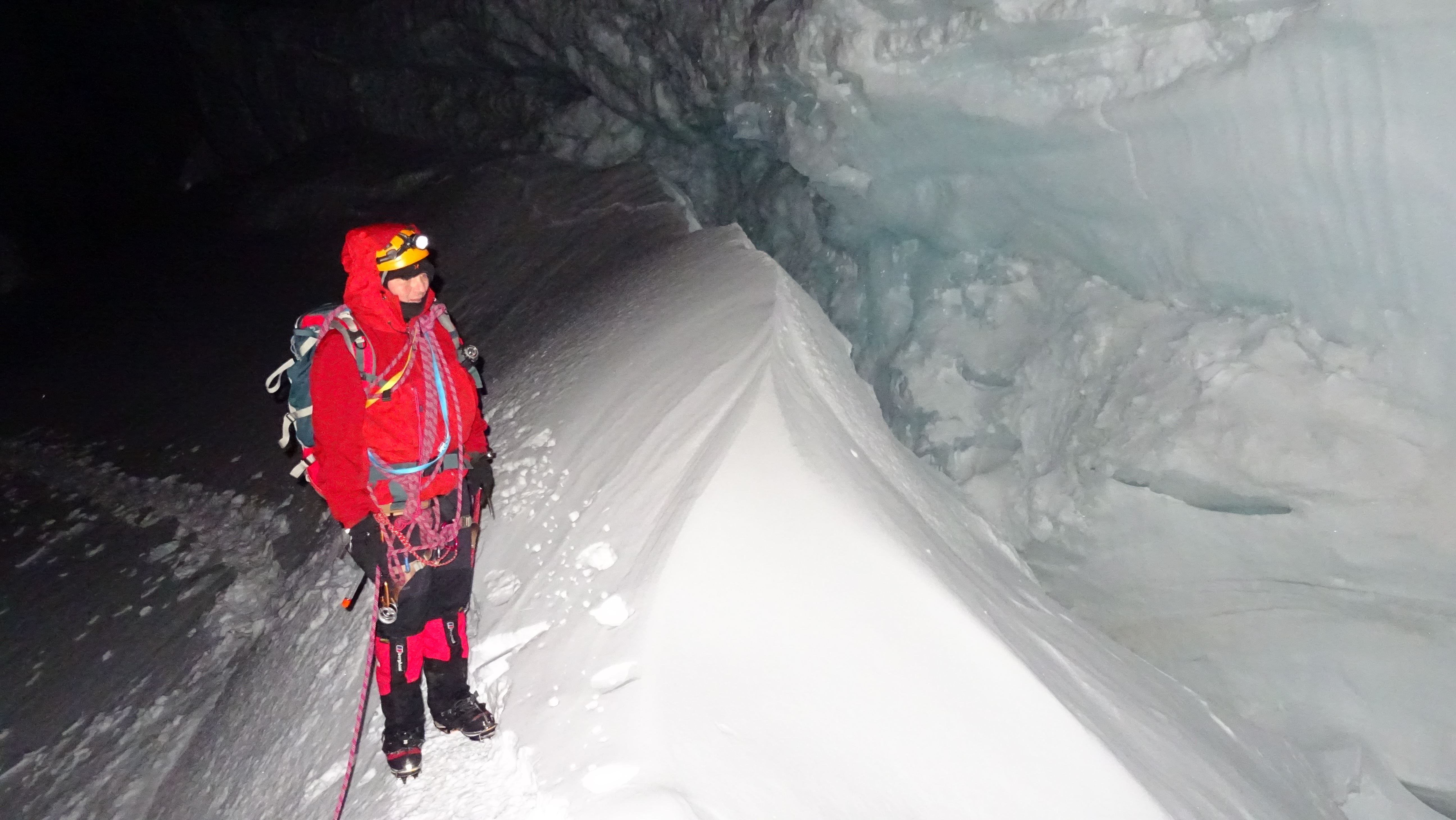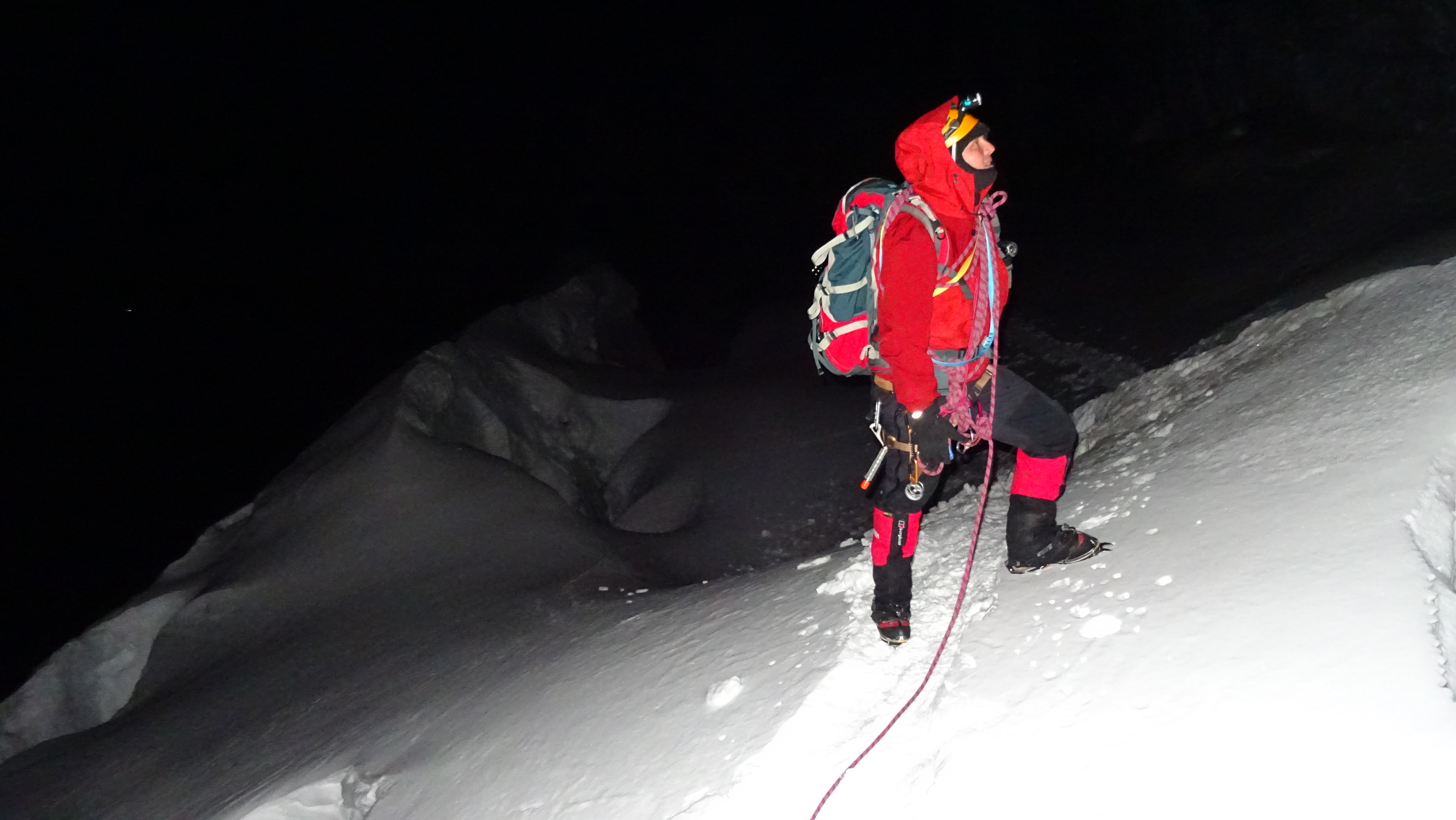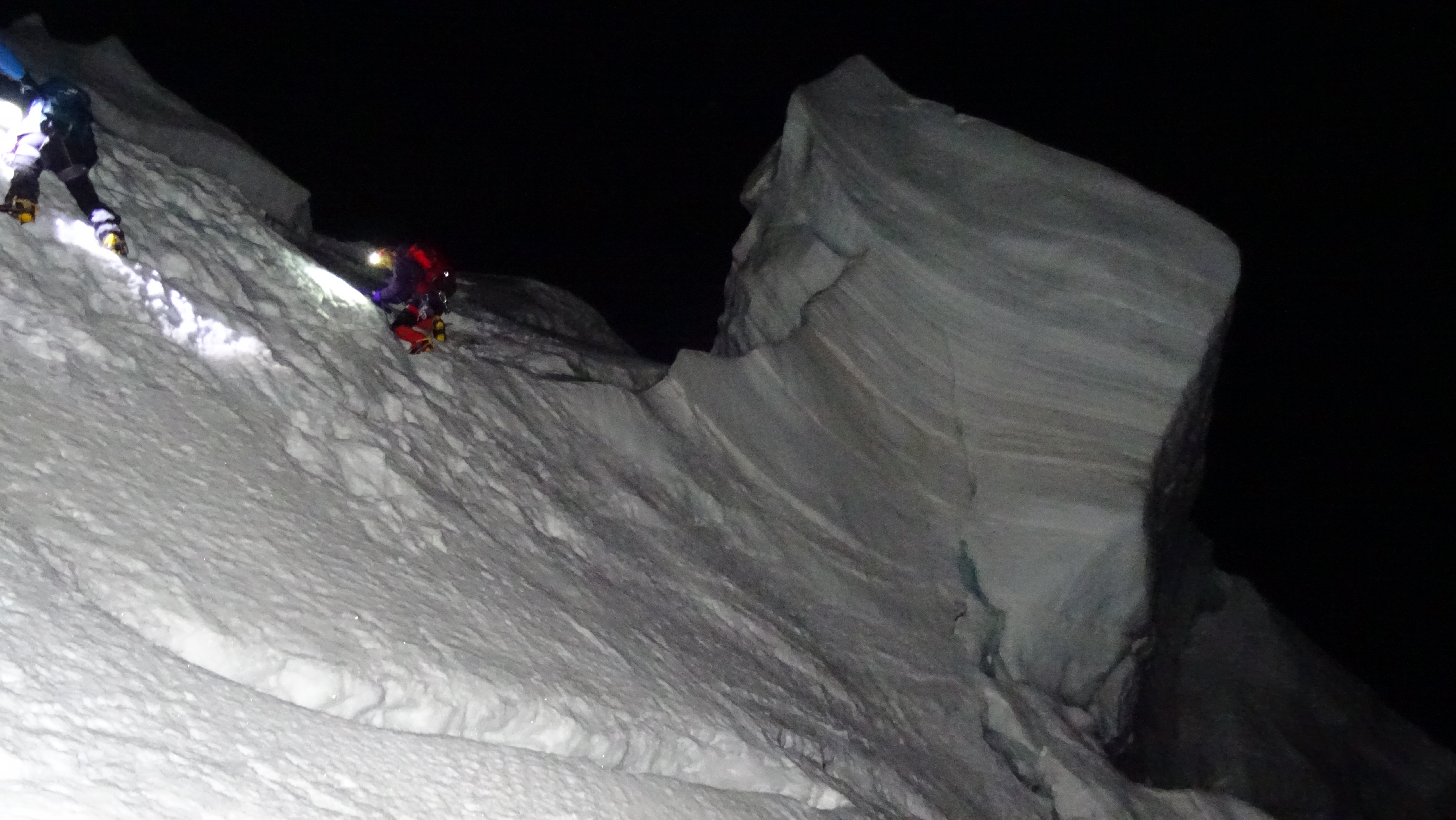 On the Gonella route up Mont Blanc, one must cross the narrow snow ridge between Piton des Italiens (4003 m, left) and Dome de Gouter (4304 m, to the right, but not cought in the picture).