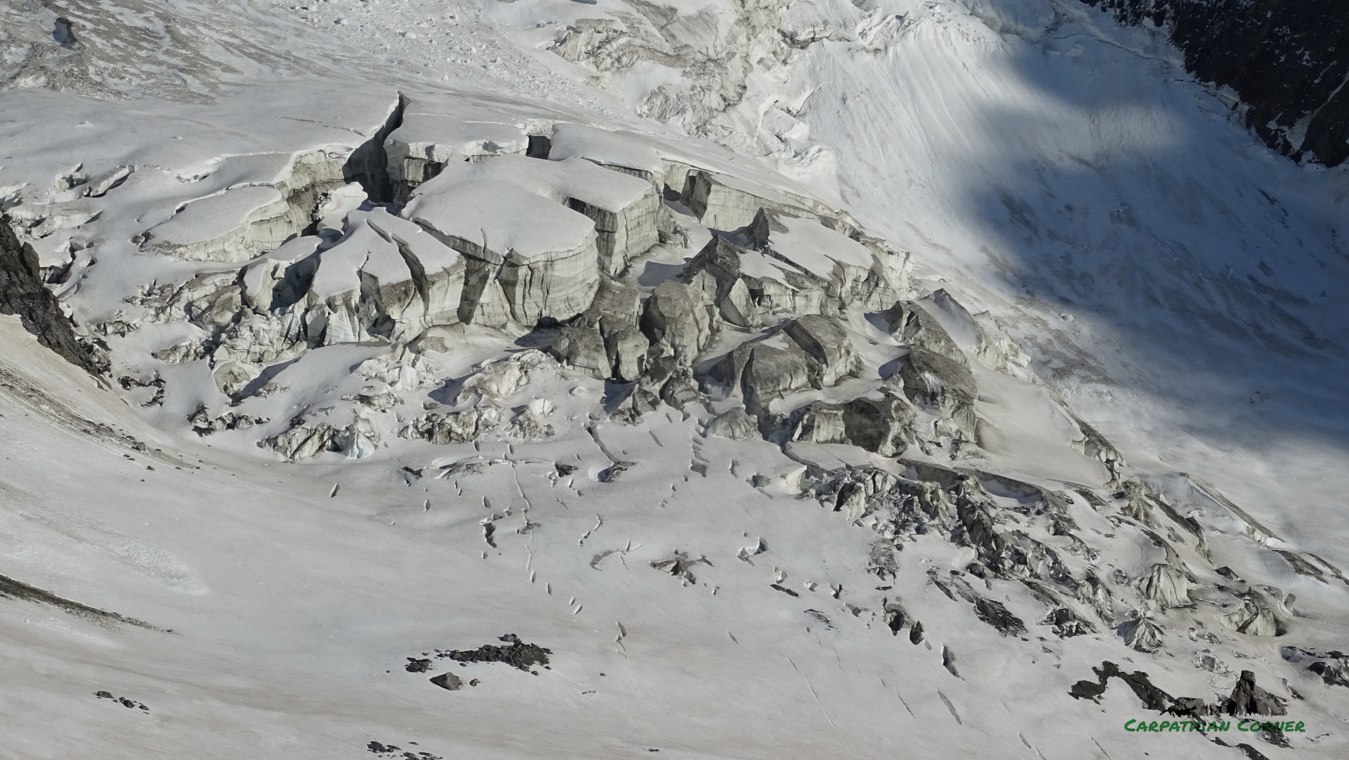 În timp ce urcăm, tot tragem cu ochiul la creasta ce face legătura între Piton des Italiens și vîrful Dome (aceasta se parcurge pe ruta italiană de ascensiune a Mont Blancului). Pe aici ar fi trebuit să mergem și noi în urmă cu 3 zile, dacă nu ne-ar fi întors din drum vîntul năprasnic ce mătura crestele înalte. Nu-i nimic, rămîne pe data viitoare cînd, cine știe, poate o vom parcurge venind chiar de pe Bionnassay.