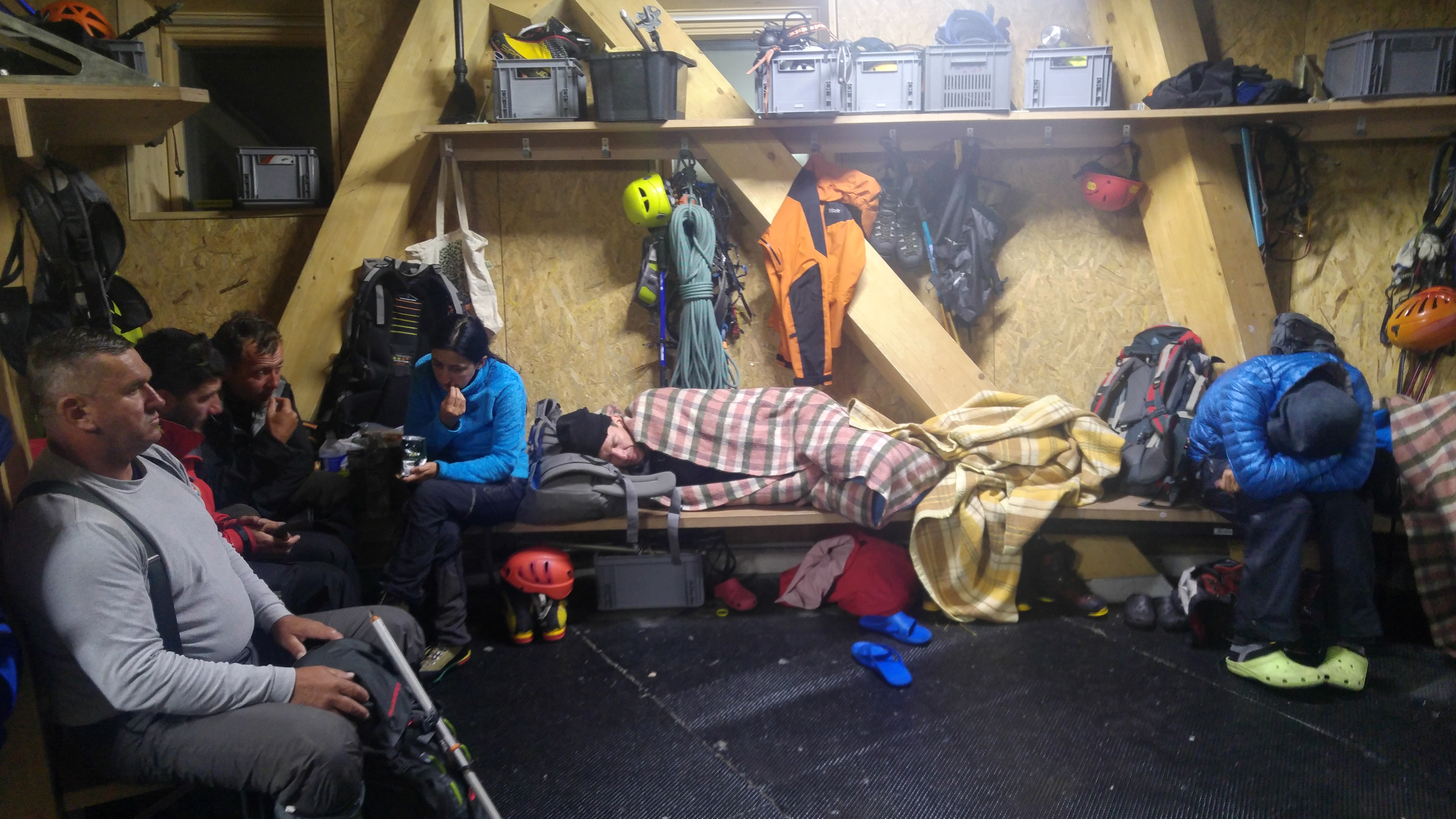 Politica refugiului Gouter față de turiștii care le calcă pragul și vor/au nevoie să doarmă peste noapte acolo fără sa aibă rezervare, este de un mercantilism atroce. Rareori mi- a fost dat să experimentez așa ceva în cabanele montane! Nu am avut în intenție să dorm la refugiul Gouter, însă oboseala și suprasolicitarea organismului în ultimele cîteva zile, ne-au făcut să reconsiderăm planul de a coborî în aceeași zi la Tete Rousse, unde lăsasem o parte din lucrurile noastre. Cabana era în întregime ocupată, sala de mese se închide noaptea, așa că singurul loc unde puteam rămîne peste noapte era camera pentru depozitarea bocancilor și a echipamentului tehnic. Este vorba despre o cameră complet neîncălzită, în care poți dormi stînd în fund sau întins pe niște bănci de lemn înguste.