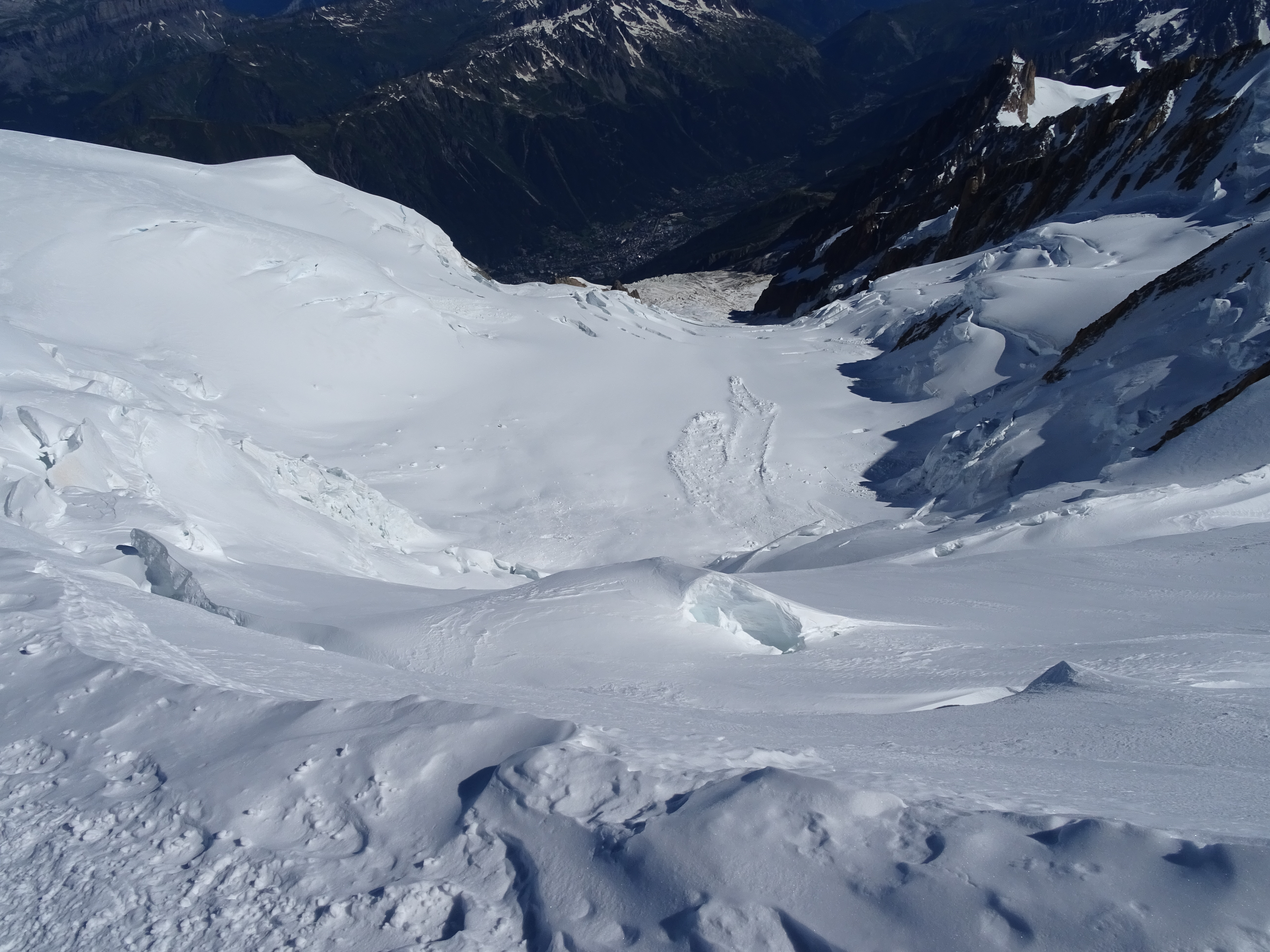 Pe măsură ce coboram, se făcea tot mai cald. Slaba adiere a vîntului de pe vîrf dispăruse complet. De la refugiul Vallot și pînă la refugiul Gouter am mers pe o caniculă teribilă ce ne moleșea puterile. Parcă eram în Bărăgan, nu în Mont Blanc, la 4000 m altitudine. Am ajuns pe la orele 16:30 – 17:00.