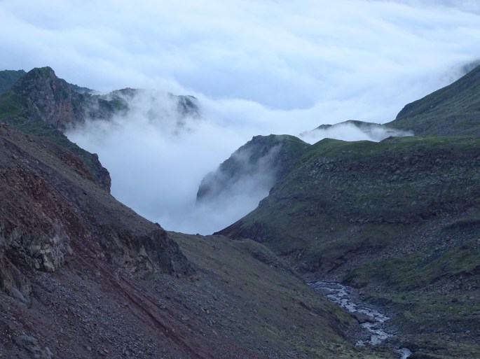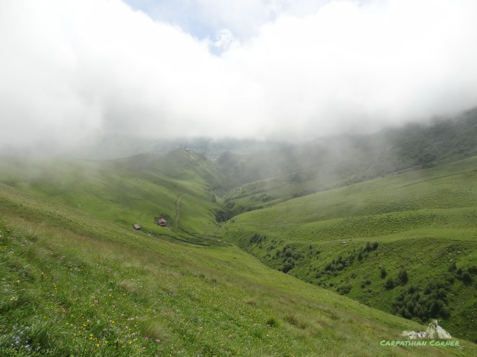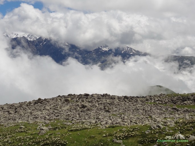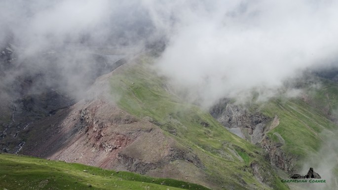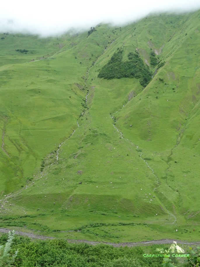 Mergem agale pe pantele înierbate, sub bătaia razelor de soare din ce în ce mai arzătoare. Din cînd în cînd, o ceață fină învăluie versanții verzi. Pînă în șaua Arsha, la 3000 m altitudine ne intersectăm cu cîteva grupuri de turiști din Georgia, Israel și Norvegia, cu care mai sporovăim pe drum, mai ales cu georgienii.