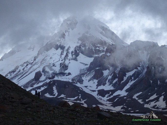 Nu departe de locul de campare se află canionul care mă impresionase așa mult observîndu-l din șaua Arsha. Acolo am petrecut restul zilei, pe marginea acelui mic canion, urmărind jocurile de nori, lumini și umbre în ceasul asfințitului și tot așteptînd să zărim Kazbekul. Un vînt rece bătea dinspre nord – vest, făcînd norii să se deplaseze cu repeziciune, exact ca într-un clip time lapse. Într-un tîrziu, cortina noroasă se dă la o parte, lăsîndu-ne să vedem pentru prima dată silueta maiestuoasă și impunătoare a Kazbekului. Ce apariție!