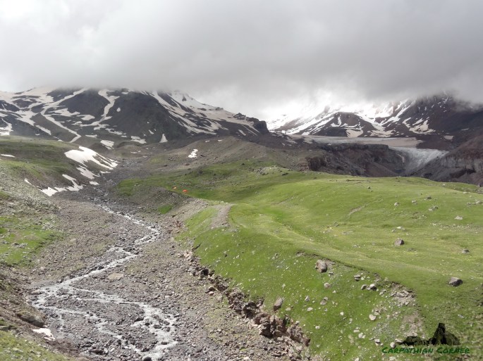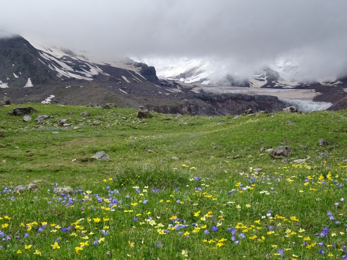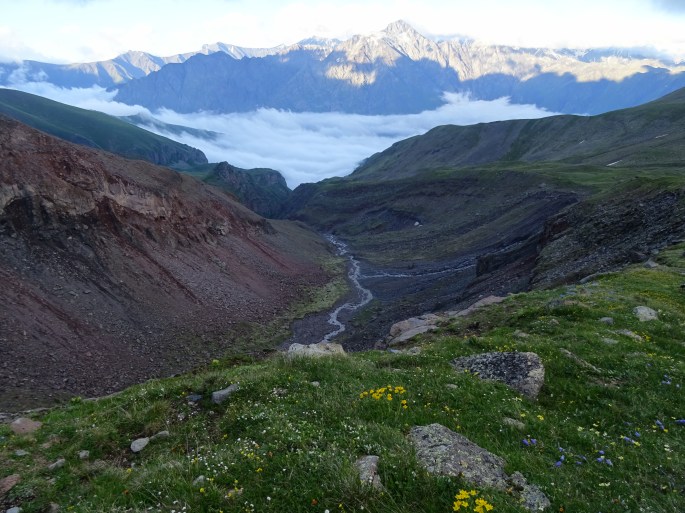 Ajungem în șaua Arsha pe la 12. De aici avem o amplă perspectivă asupra lanțului muntos Kuro. Kazbekul deocamdată nu se arată , este acoperit de nori groși. Doar ghețarul Gergeti îl pot vedea și, în prelungirea limbii acestuia, o văiugă imensă, spectaculoasă, un fel de canion, ca o rană deschisă în trupul muntelui. Ne continuăm traseul printr-o coborîre ușoară și apoi pe o lungă curbă de nivel, prin pajiști montane împănate cu o puzderie de flori multicolore. Încet încet ne apropiem de locul nostru de campare, Sabertse.