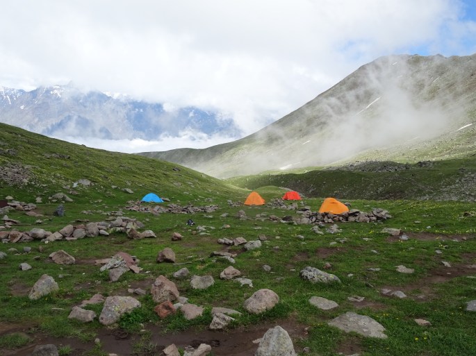 Reperăm rucsacii noștri așezați la baza unei stînci mari, întocmai cum ne asigurase cărăușul. Un loc relativ plan, cu numeroase platforme de cort. Dăm și peste un izvoraș mic, chiar lîngă potecă.