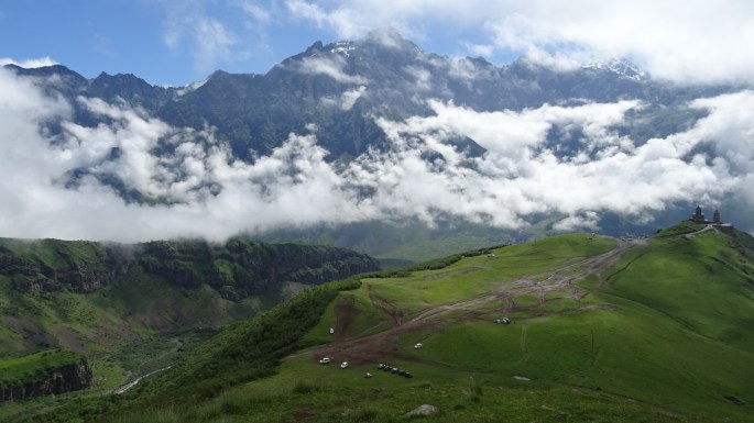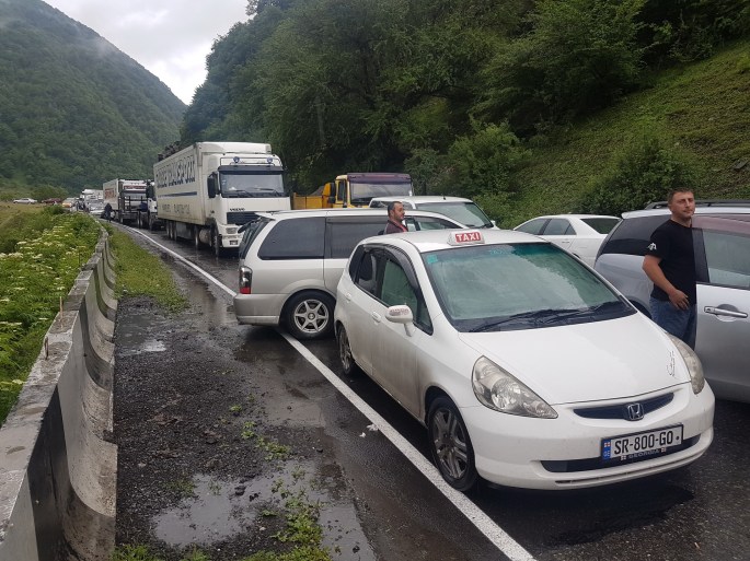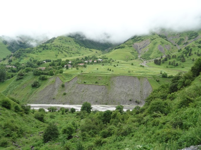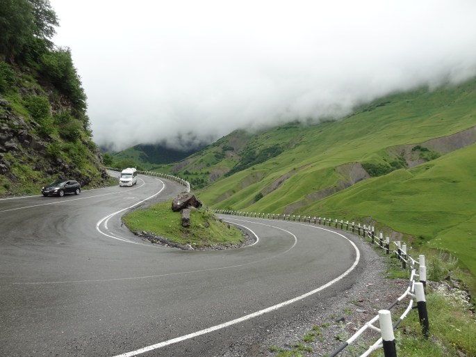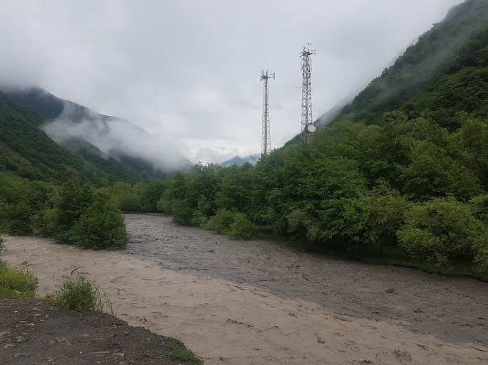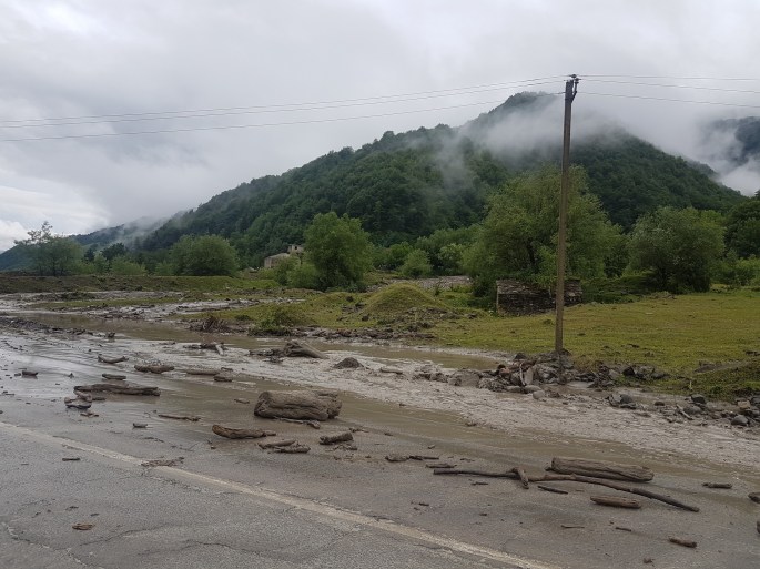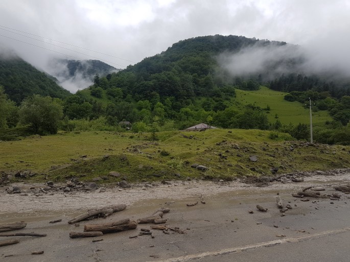 Luăm contact și cu natura brutală și imprevizibilă a Caucazului: în urma ploilor abundente, porțiuni din celebrul drum militar georgian au devenit impracticabile circulației auto, torenții capricioși inundînd drumul cu materiale transportate de pe versanții abrupți.
