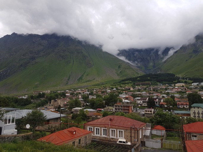 Koba ne-a lăsat chiar la poarta pensiunii Maya’s Guest House, unde făcusem rezervare pe Booking, pentru o cameră dublă cu baie comună, la prețul de 35 lari. Ne aflam la poalele Kazbekului, însă privirile noastre nu pătrundeau la înălțimi mai mari de 2200 -2500 m, datorită păturii groase de nori ce acoperea crestele Caucazului.