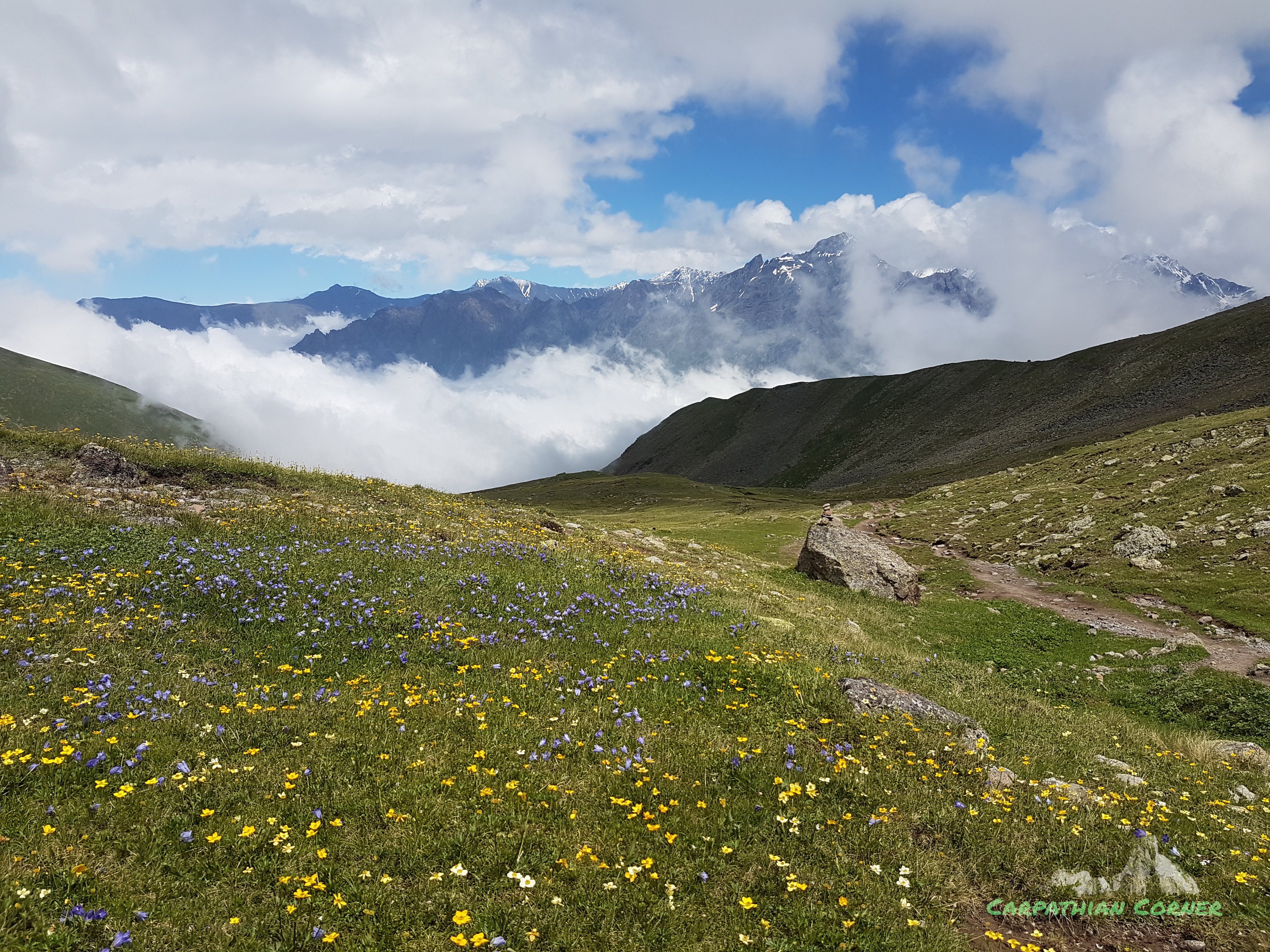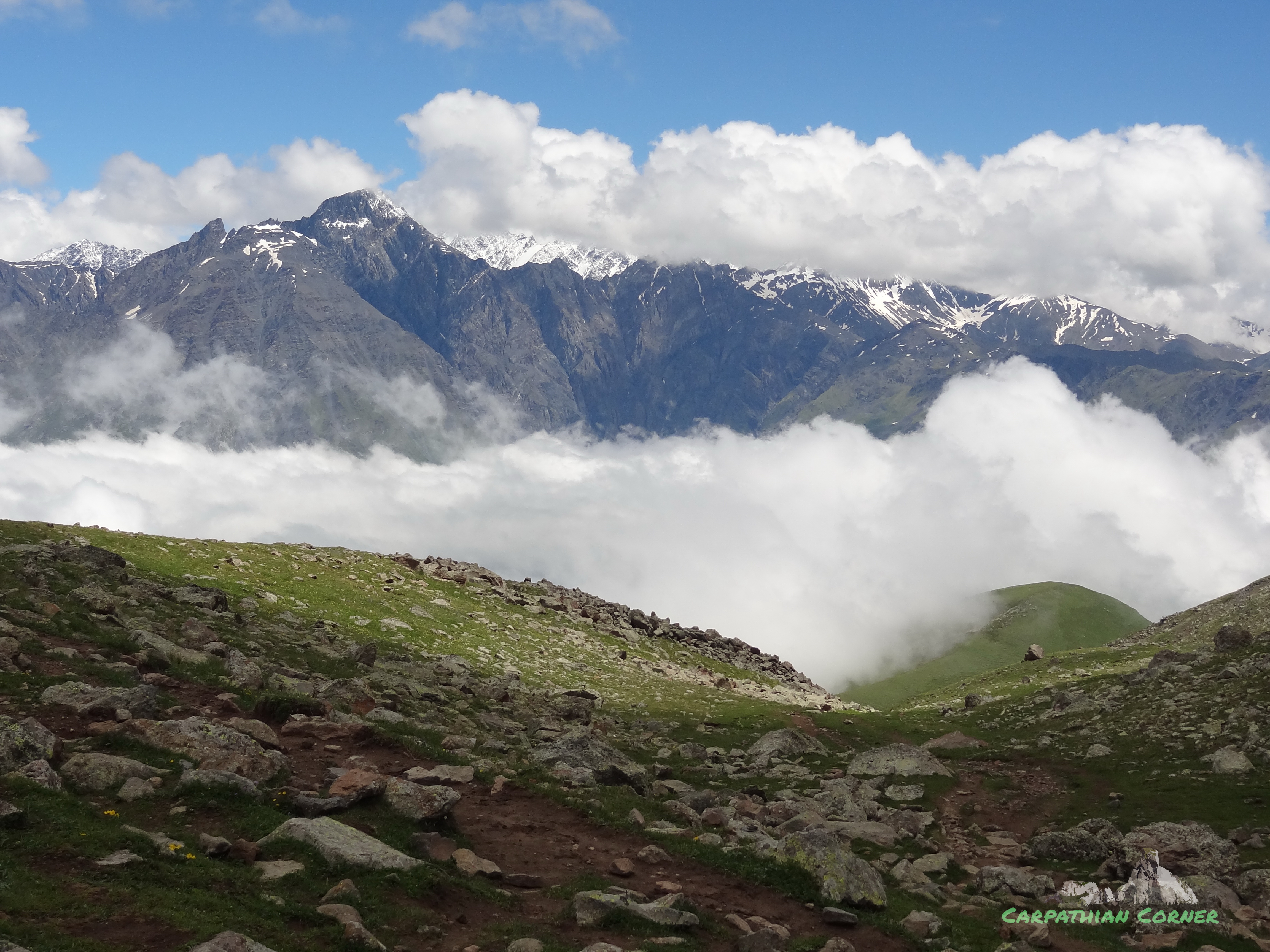 Mergem agale pe pantele înierbate, sub bătaia razelor de soare din ce în ce mai arzătoare. Din cînd în cînd, o ceață fină învăluie versanții verzi. Pînă în șaua Arsha, la 3000 m altitudine ne intersectăm cu cîteva grupuri de turiști din Georgia, Israel și Norvegia, cu care mai sporovăim pe drum, mai ales cu georgienii.