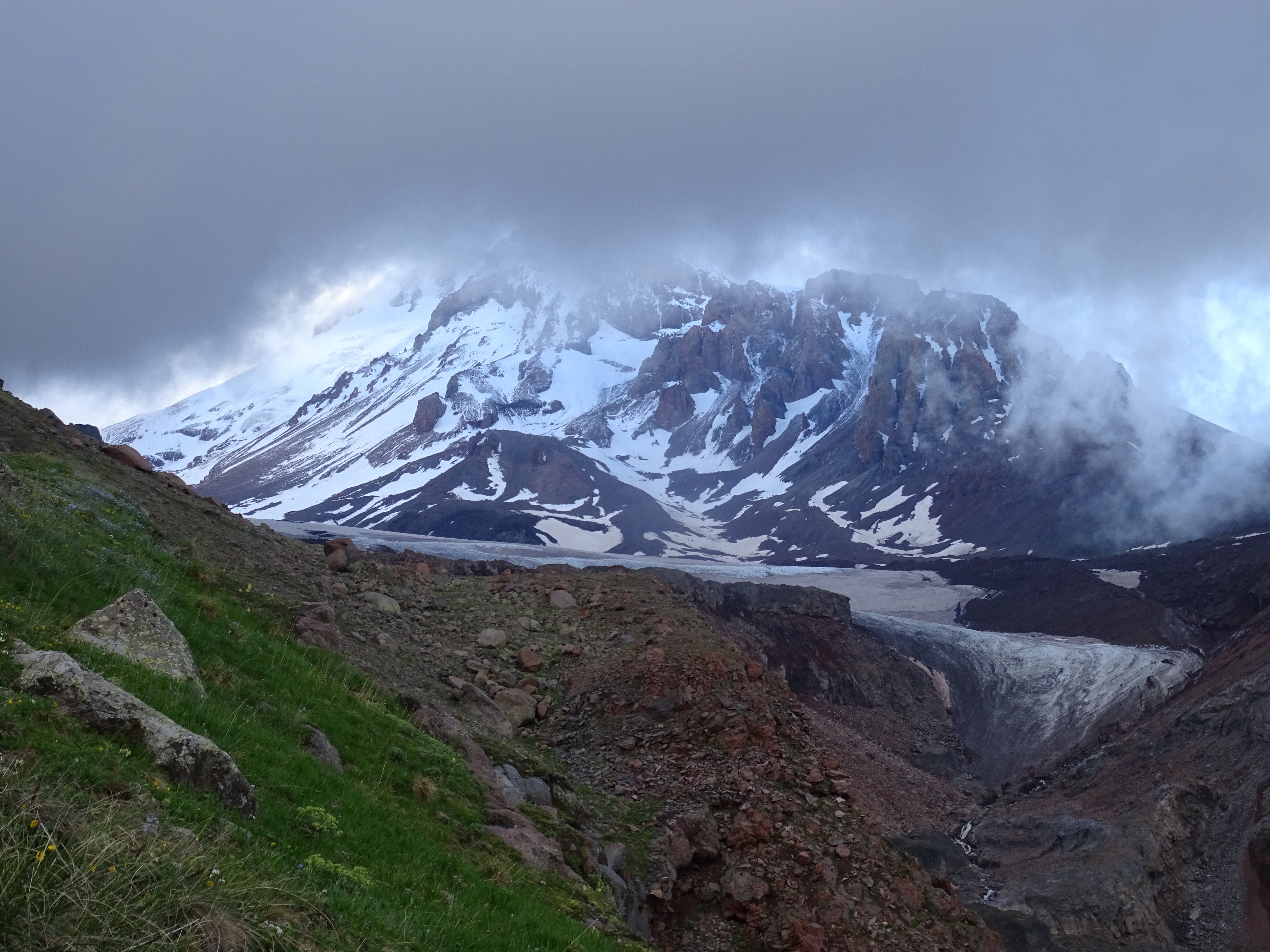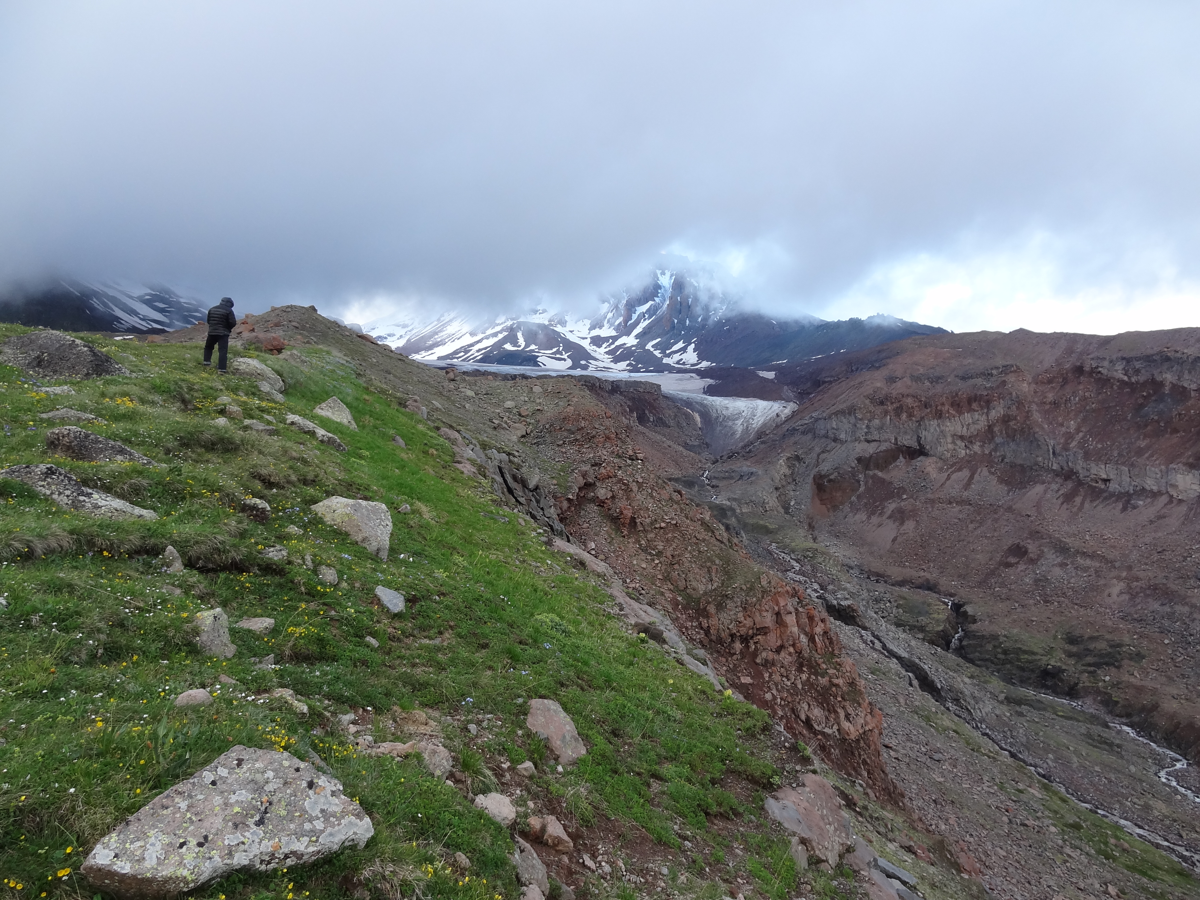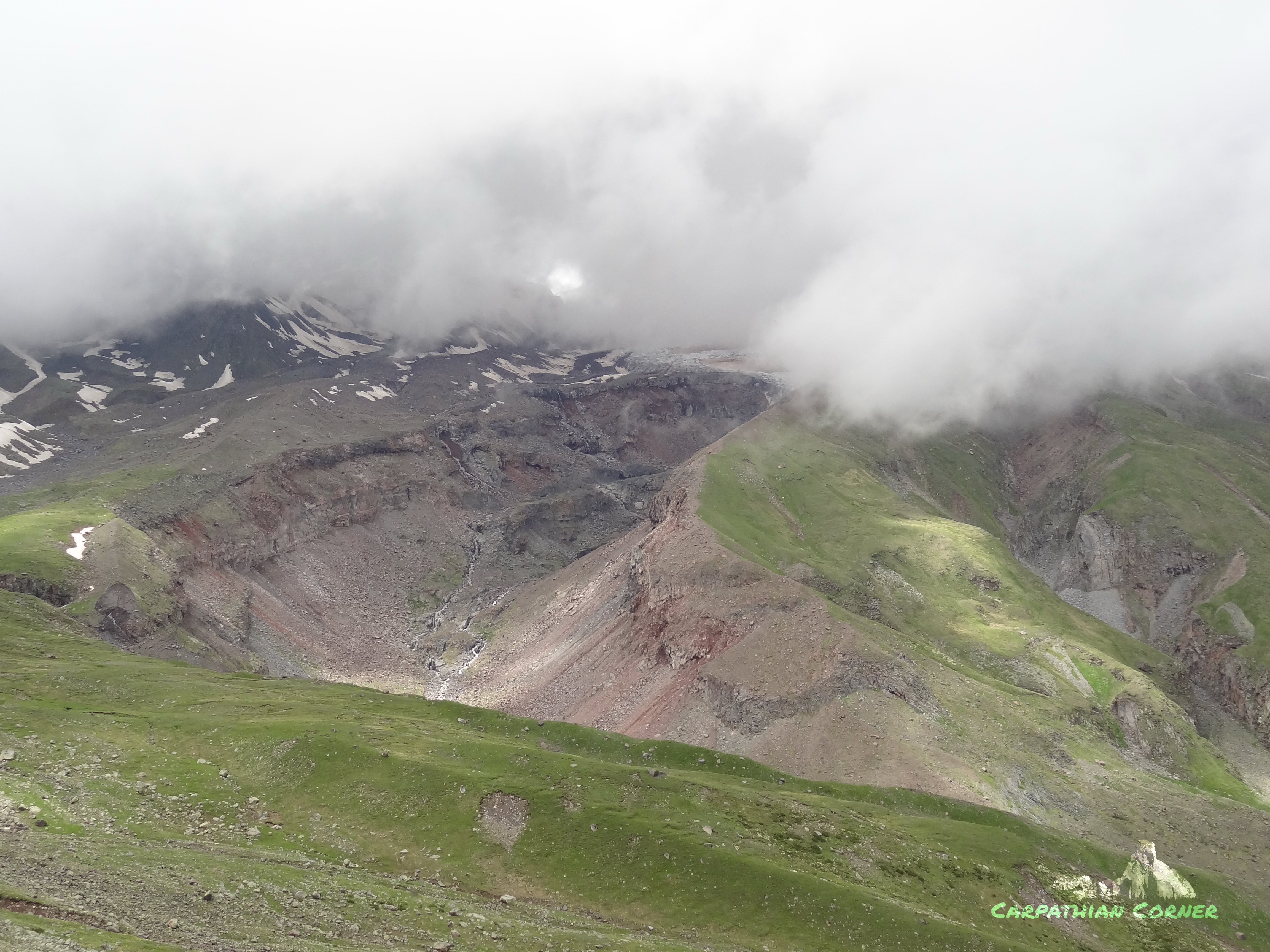 Nu departe de locul de campare se află canionul care mă impresionase așa mult observîndu-l din șaua Arsha. Acolo am petrecut restul zilei, pe marginea acelui mic canion, urmărind jocurile de nori, lumini și umbre în ceasul asfințitului și tot așteptînd să zărim Kazbekul. Un vînt rece bătea dinspre nord – vest, făcînd norii să se deplaseze cu repeziciune, exact ca într-un clip time lapse. Într-un tîrziu, cortina noroasă se dă la o parte, lăsîndu-ne să vedem pentru prima dată silueta maiestuoasă și impunătoare a Kazbekului. Ce apariție!
