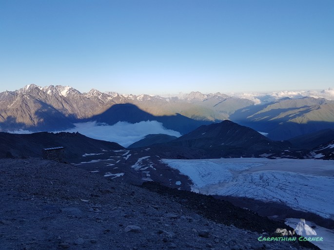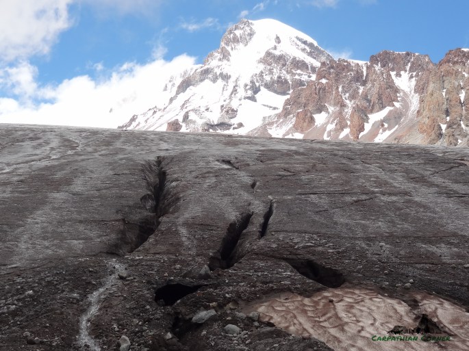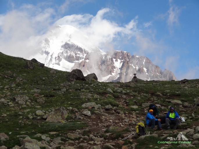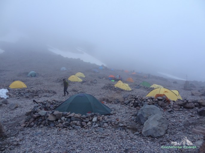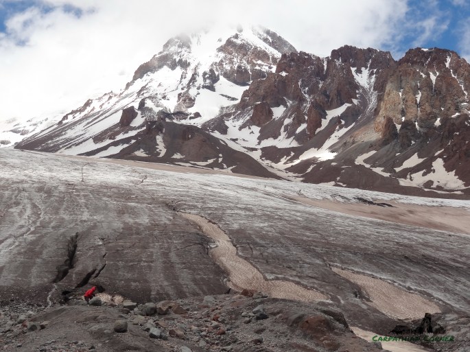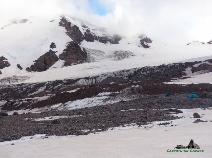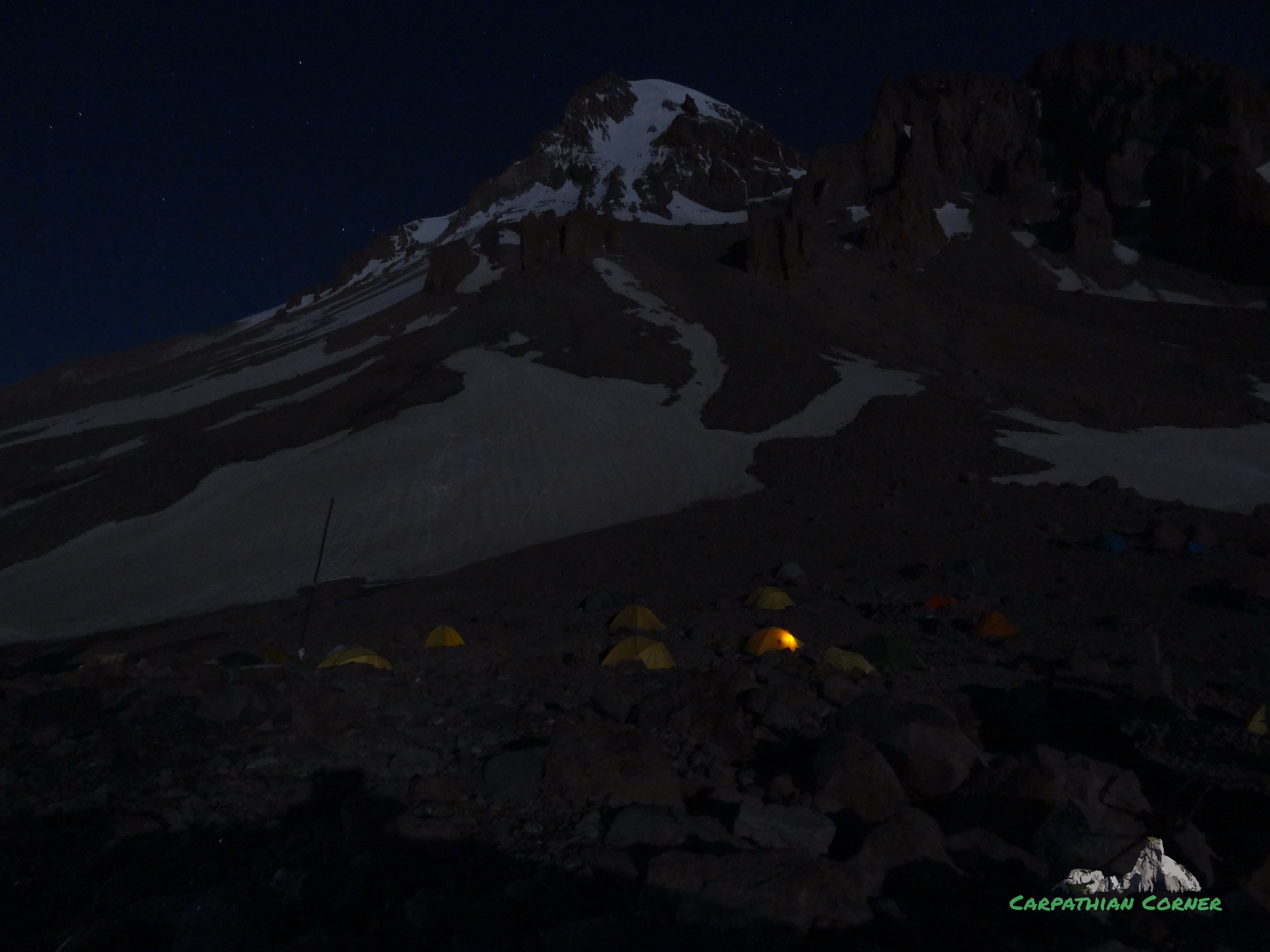 Undeva în depărtare, am identificat o zonă mai plată pe suprafața morenei stîngi a ghețarului, puțin lateral față de traseul de ascensiune; acolo vom pune cortul. Cînd am ajuns, am constatat că mai valorificaseră și alții locul respectiv: am găsit cîteva platforme de cort cu ziduri de pietre pentru apărare împotriva vîntului. Din păcate nu le-am putut folosi, întrucît bălteau apa și gheața pe fundul lor. În cele din urmă, ne-am instalat cortul pe un loc mai proeminent, însă cu zidul de apărare parțial distrus. Lîngă noi mai era un cort al unei echipe din Belarus, care urma să înceapă ascensiunea pe vîrf în acea noapte. Stînd de vorba cu ei, ne-au împărtășit faptul că vîrful Kazbek era prima parte a expediției lor în Caucaz, a doua urmînd să se desfașoare pe Elbrus. Ce fain! Exact cum am vrut și noi să facem inițial, dar apoi ne-am văzut siliți să abandonăm în fața nenumăratelor formalități.