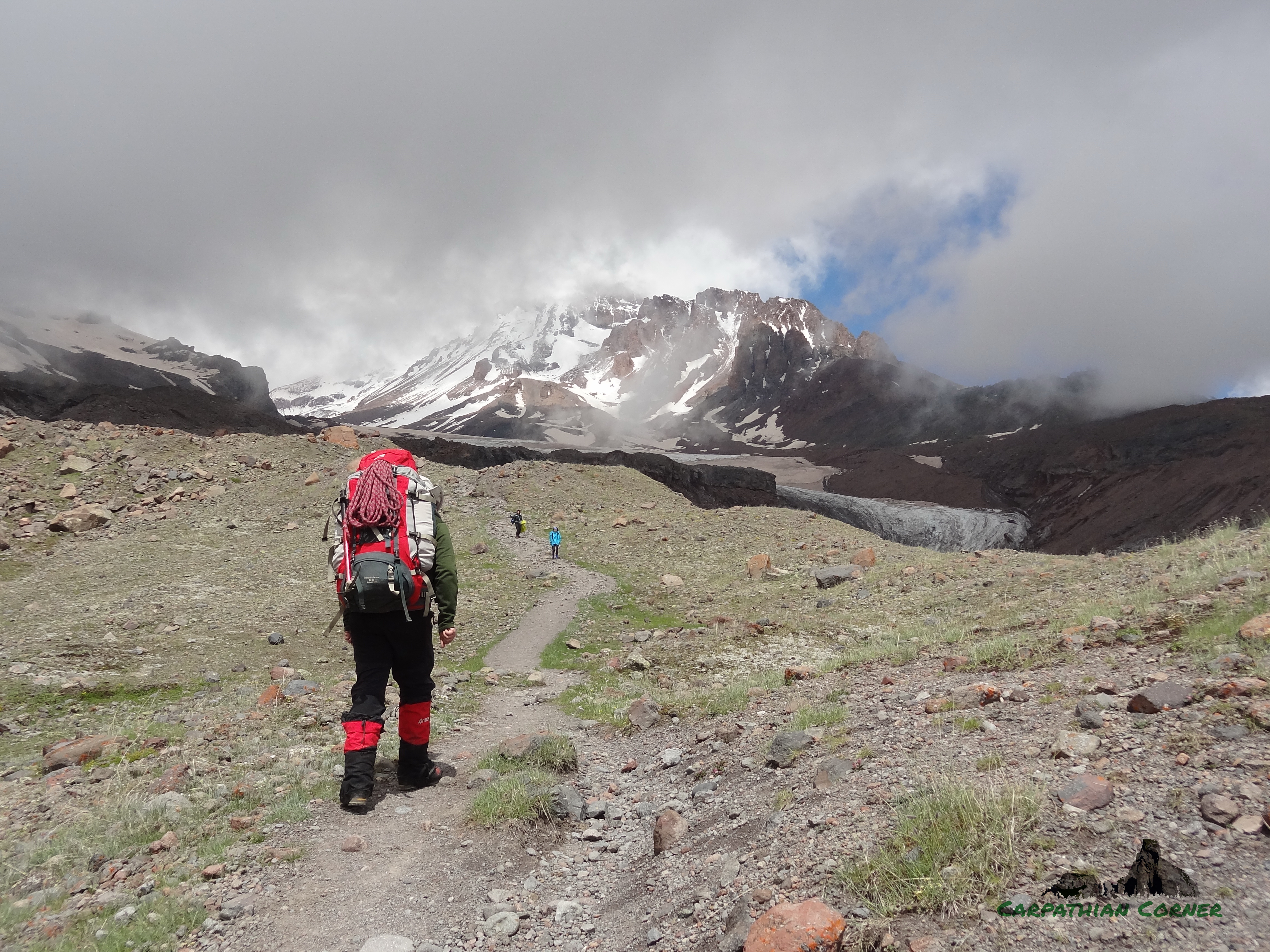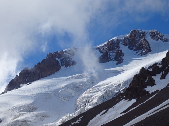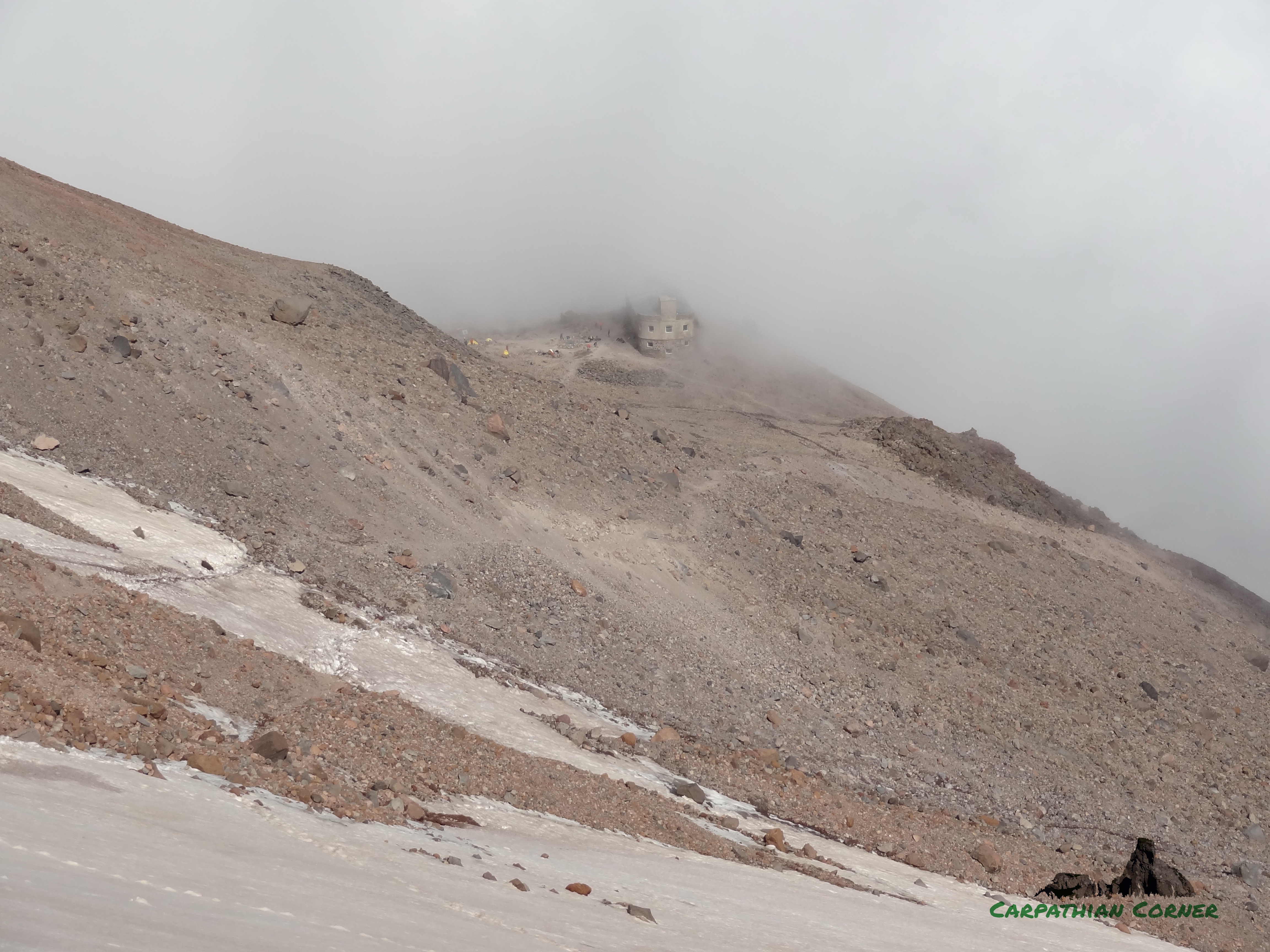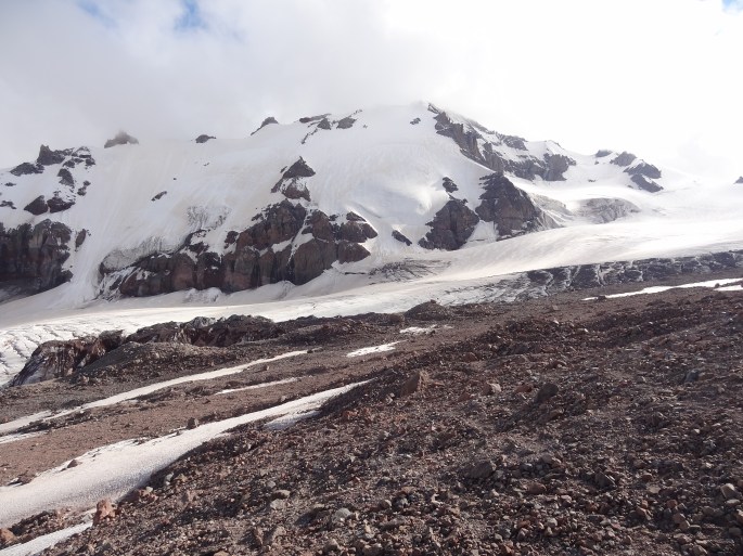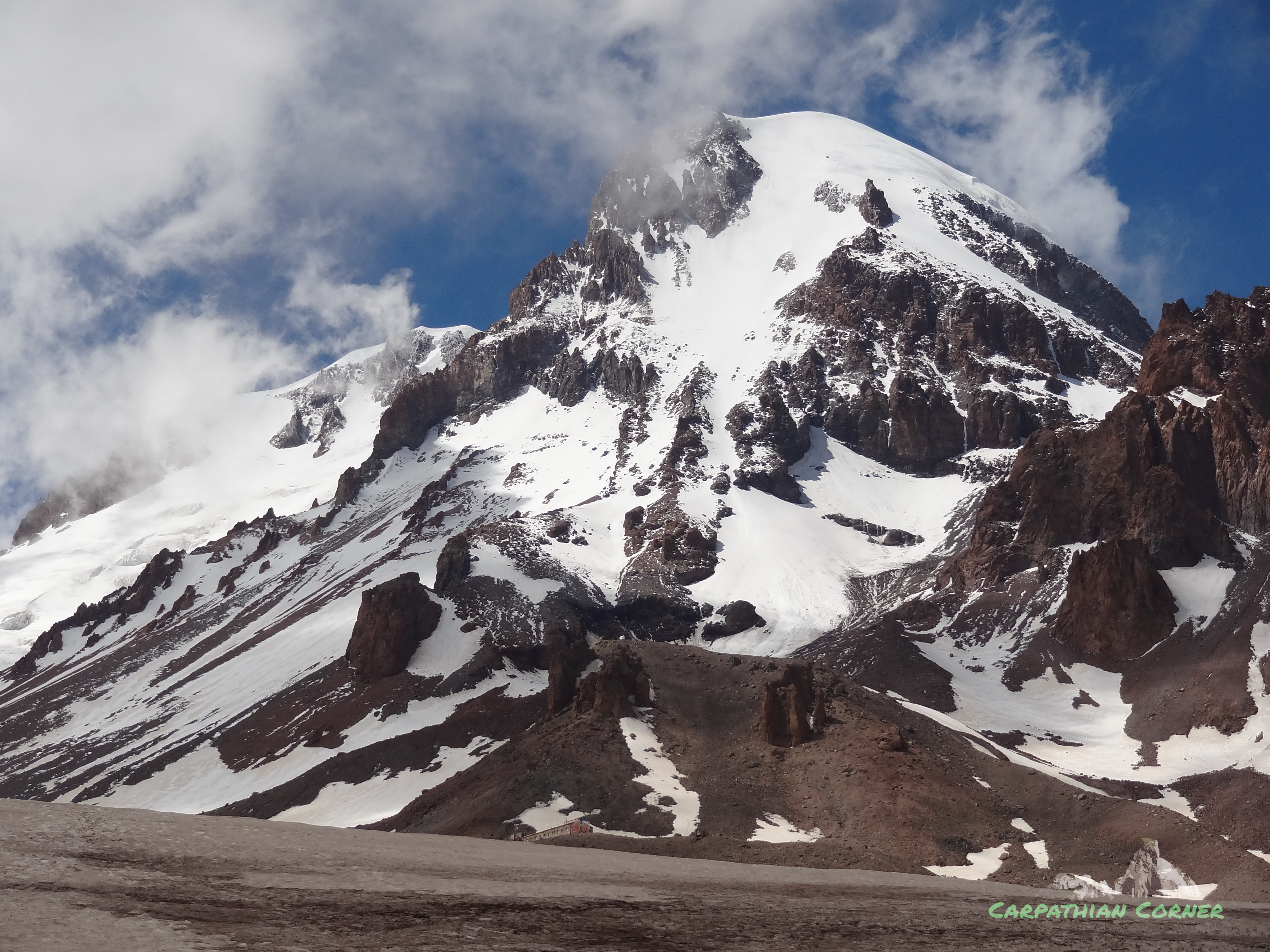 Undeva în depărtare, am identificat o zonă mai plată pe suprafața morenei stîngi a ghețarului, puțin lateral față de traseul de ascensiune; acolo vom pune cortul. Cînd am ajuns, am constatat că mai valorificaseră și alții locul respectiv: am găsit cîteva platforme de cort cu ziduri de pietre pentru apărare împotriva vîntului. Din păcate nu le-am putut folosi, întrucît bălteau apa și gheața pe fundul lor. În cele din urmă, ne-am instalat cortul pe un loc mai proeminent, însă cu zidul de apărare parțial distrus. Lîngă noi mai era un cort al unei echipe din Belarus, care urma să înceapă ascensiunea pe vîrf în acea noapte. Stînd de vorba cu ei, ne-au împărtășit faptul că vîrful Kazbek era prima parte a expediției lor în Caucaz, a doua urmînd să se desfașoare pe Elbrus. Ce fain! Exact cum am vrut și noi să facem inițial, dar apoi ne-am văzut siliți să abandonăm în fața nenumăratelor formalități.