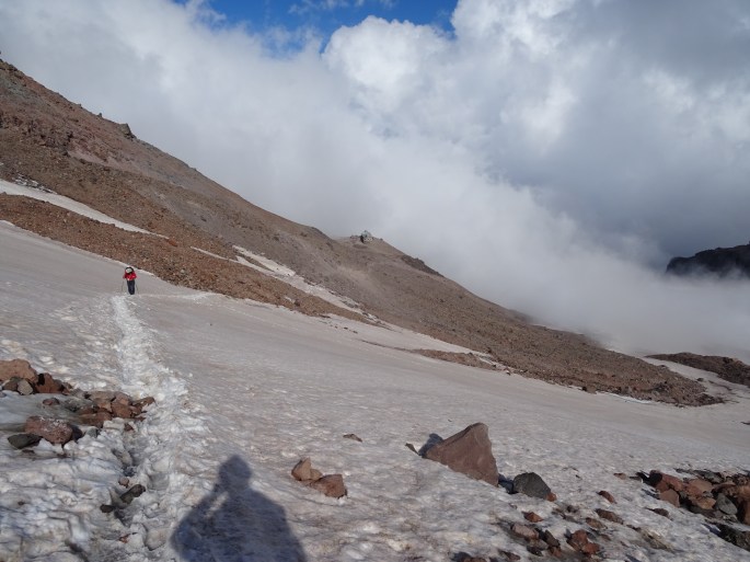 Mergem inițial în lungul ghețarului Gergeti avînd mereu în față vîrful Kazbek și, după ce panta se mai domolește, începem o lungă traversare către partea sa stîngă, printr-un strat consistent de zăpadă relativ proaspătă, pînă ajugem în dreptul morenei frămîntate. Soarele arzător și greutatea din spate ne înmoaie pașii, făcînd să ni se pară interminabil acest drum. Ne strecurăm printre movilele și șanțurile morenei glaciare și, urmărind o potecă în serpantine pe panta abruptă, ieșim pe platoul stîncos, unde se află fosta stație meteorologică, transformată între timp în cabana Bethlemi.