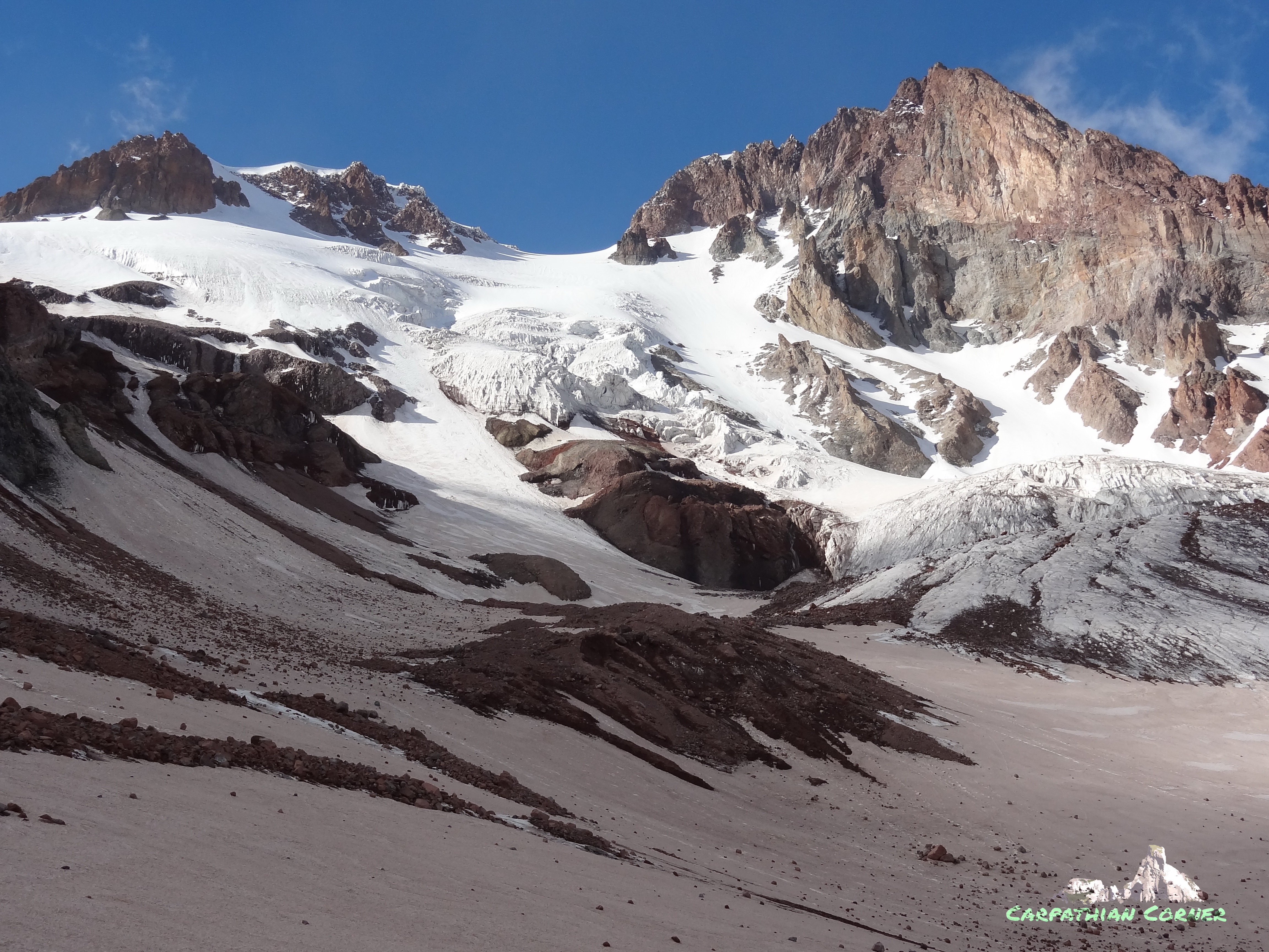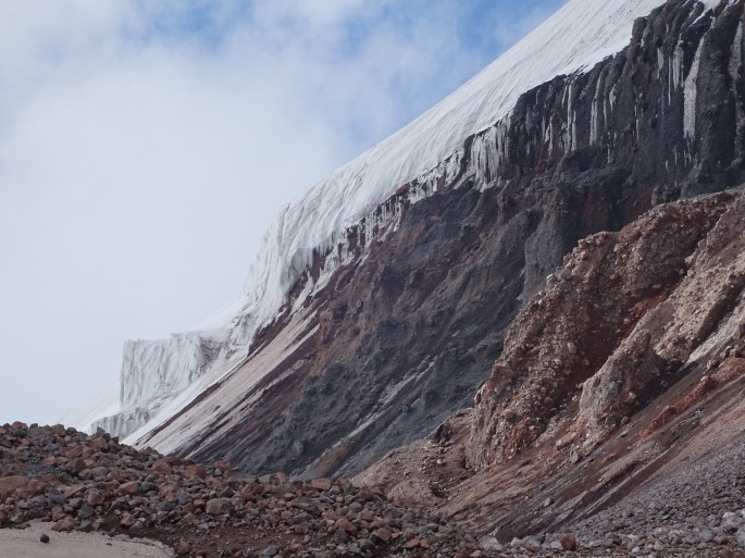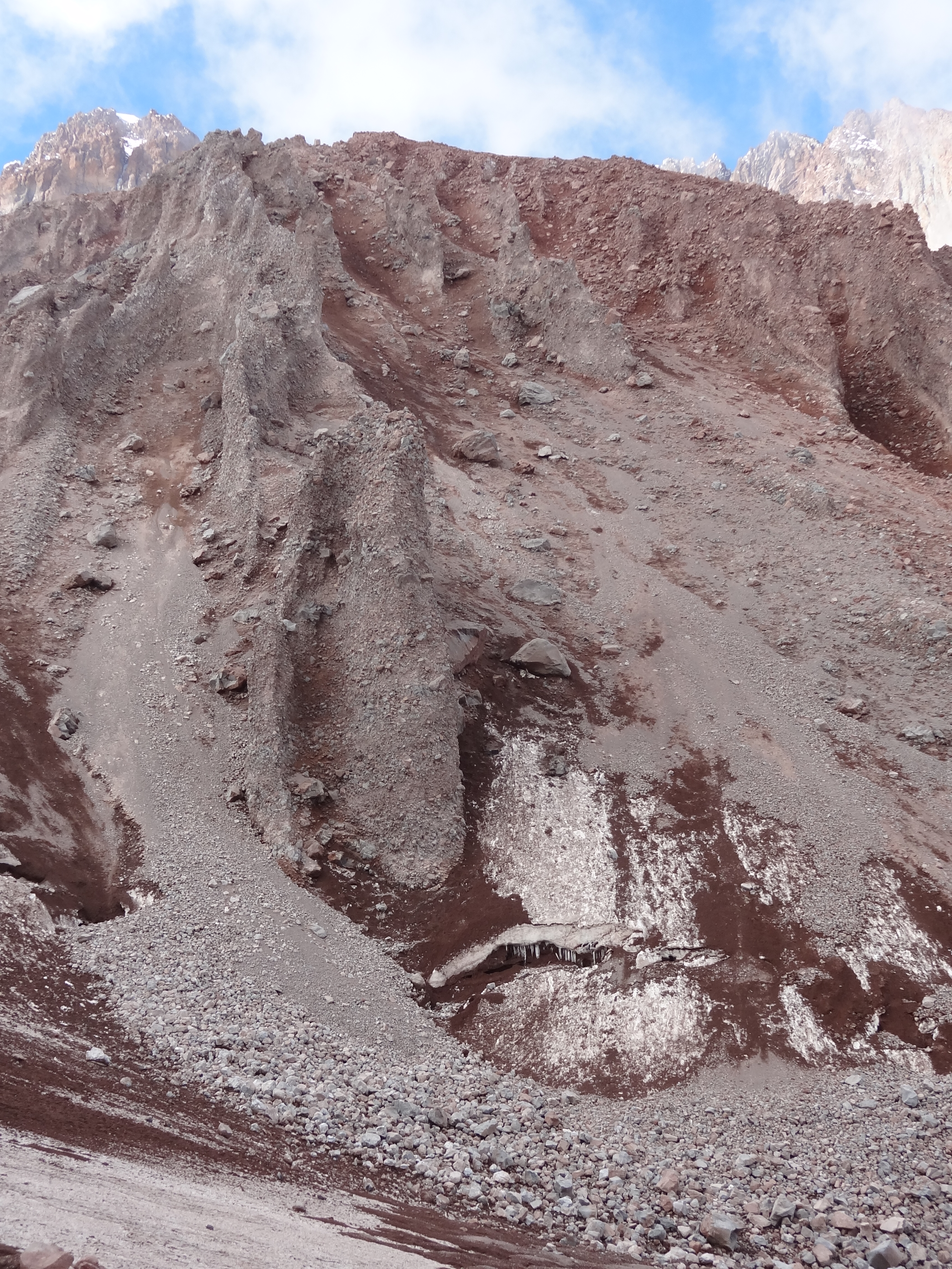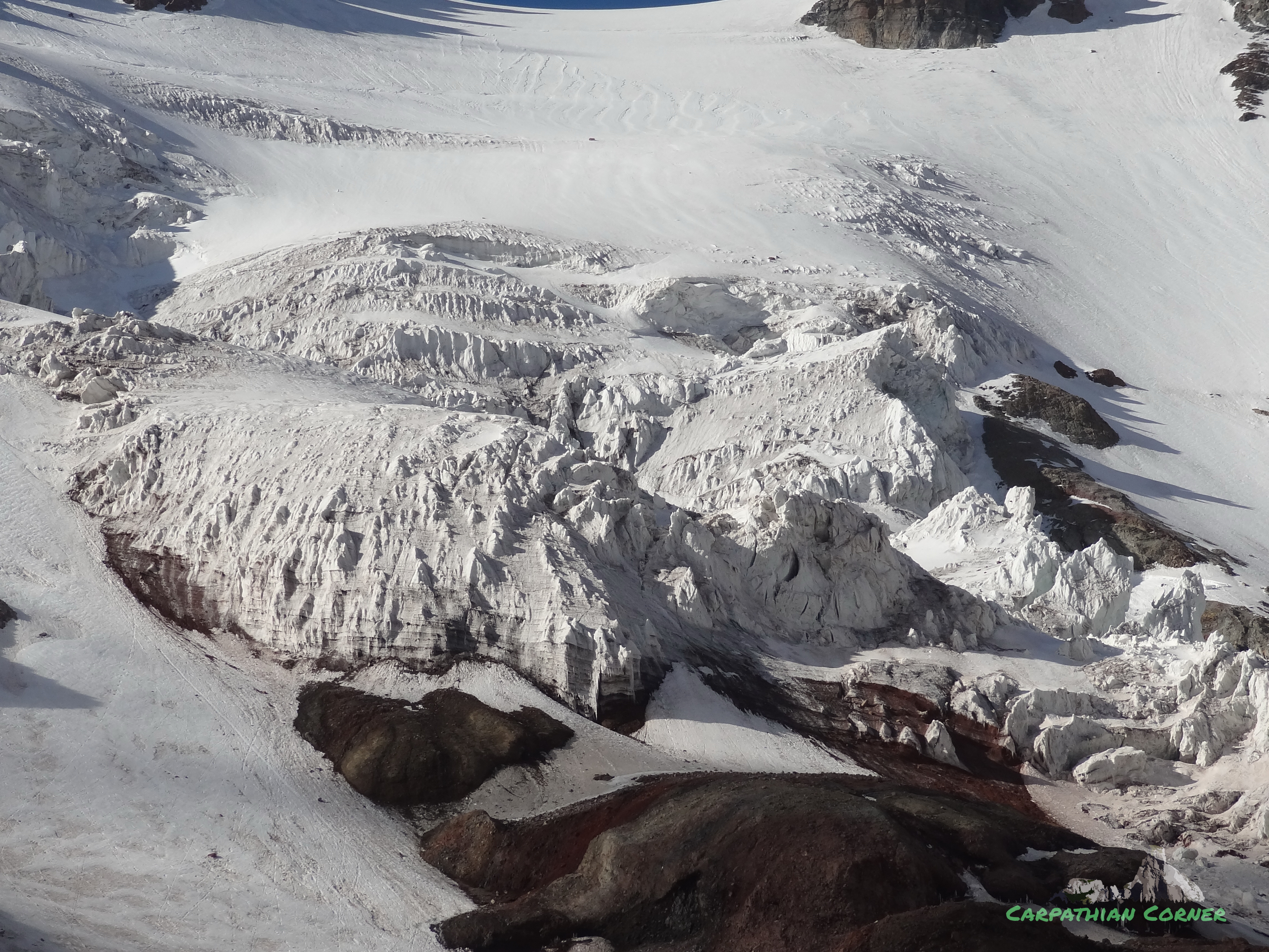 În cele din urmă ajungem și la Khmaura Wall. Întreaga zonă este răvășită de procesele gravitaționale ce se desfășoară aici cu o frecvență și intensitate ieșite din comun și care, combinate cu dinamica gheții în acest sector, dau naștere la o topografie foarte complicată, făcînd orientarea și navigarea mai problematice. Totul este într-o continua transformare: blocuri uriașe și bolovani răspîndite haotic, acumulări de pietre și bolovani de-a valma, uneori chiar sub formă de valuri succesive, paralele, pînze de grohotișuri. Pînă și crevasele pe care le întîlnim sînt împănate cu bolovani și pietre, captușite atît pe margini, cît și pe pereții interiori, cu o pastă mocirloasă maronie. O adevărată încleștare între pămînt și gheață. Chiar dacă mă aflu în plină zonă glaciară, ceva de aici mă trimite cu gîndul la întinderile deșertice. Nisipul maro-roșiatic și praful fin de aceeași culoare sugrumă albul gheții și zăpezii.