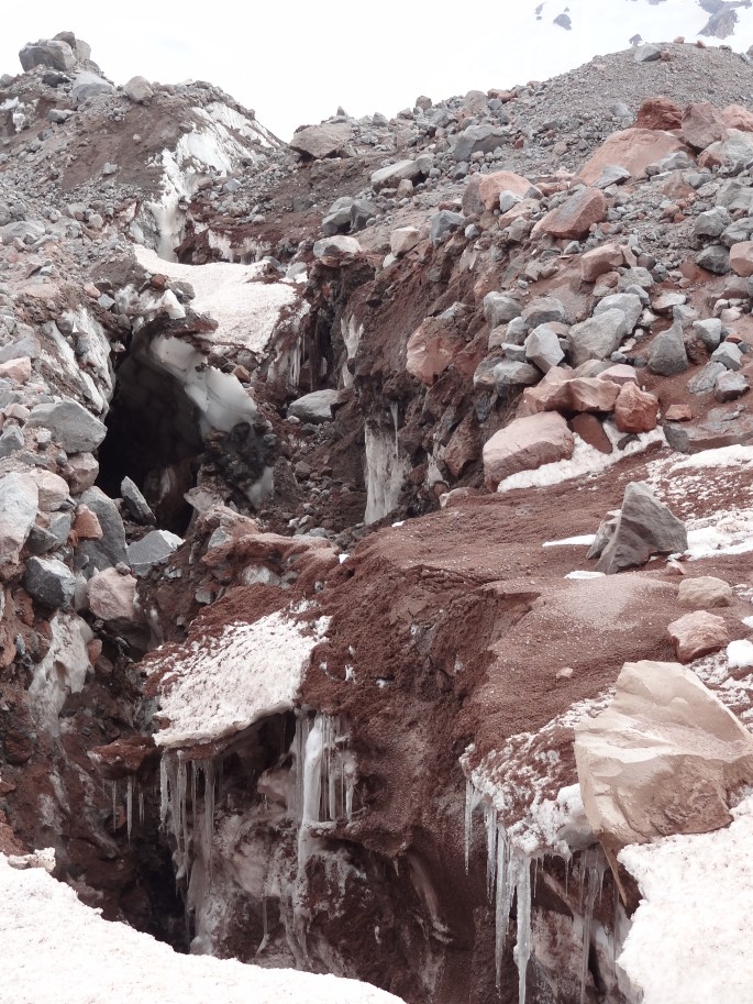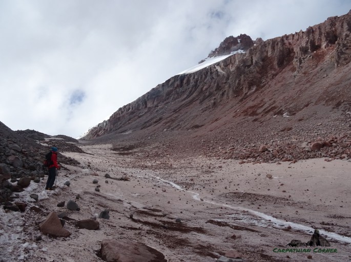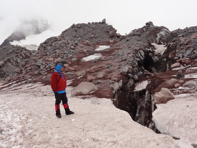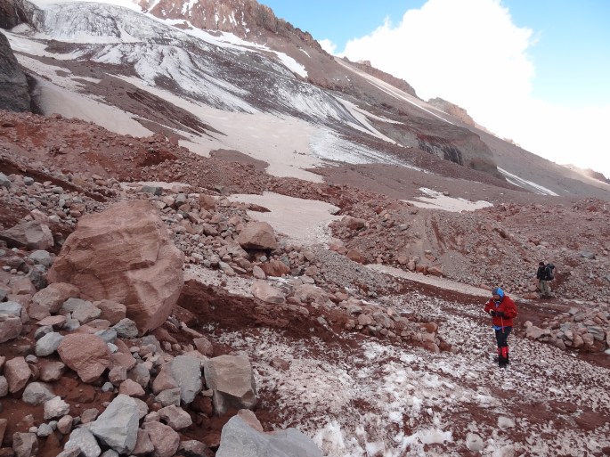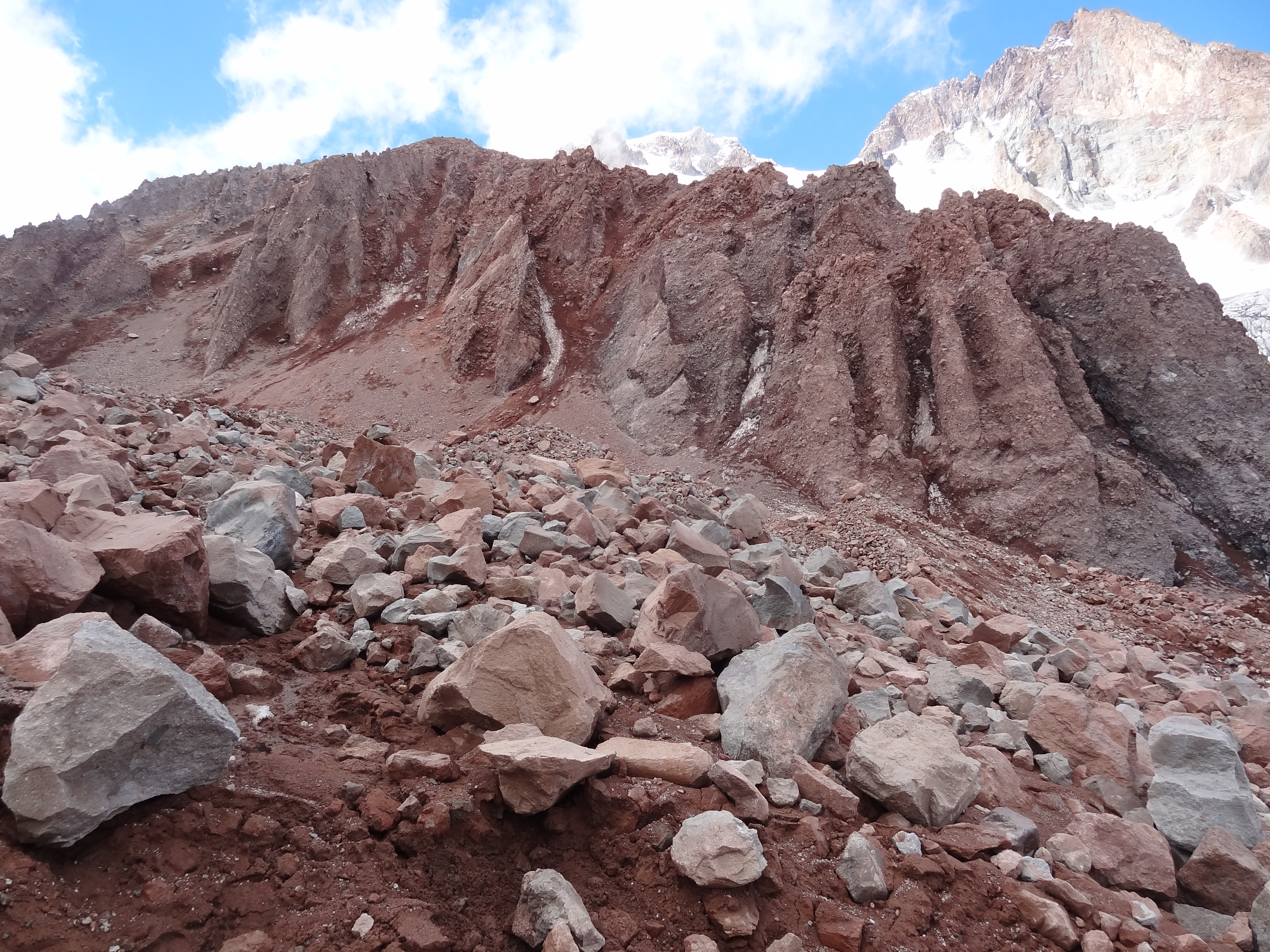 În cele din urmă ajungem și la Khmaura Wall. Întreaga zonă este răvășită de procesele gravitaționale ce se desfășoară aici cu o frecvență și intensitate ieșite din comun și care, combinate cu dinamica gheții în acest sector, dau naștere la o topografie foarte complicată, făcînd orientarea și navigarea mai problematice. Totul este într-o continua transformare: blocuri uriașe și bolovani răspîndite haotic, acumulări de pietre și bolovani de-a valma, uneori chiar sub formă de valuri succesive, paralele, pînze de grohotișuri. Pînă și crevasele pe care le întîlnim sînt împănate cu bolovani și pietre, captușite atît pe margini, cît și pe pereții interiori, cu o pastă mocirloasă maronie. O adevărată încleștare între pămînt și gheață. Chiar dacă mă aflu în plină zonă glaciară, ceva de aici mă trimite cu gîndul la întinderile deșertice. Nisipul maro-roșiatic și praful fin de aceeași culoare sugrumă albul gheții și zăpezii.