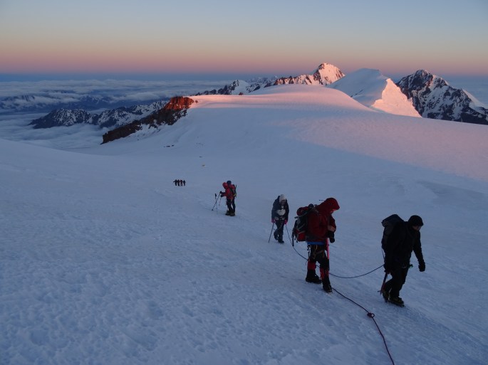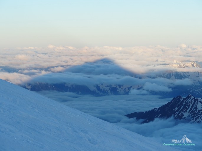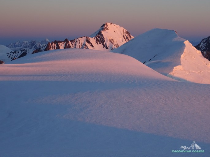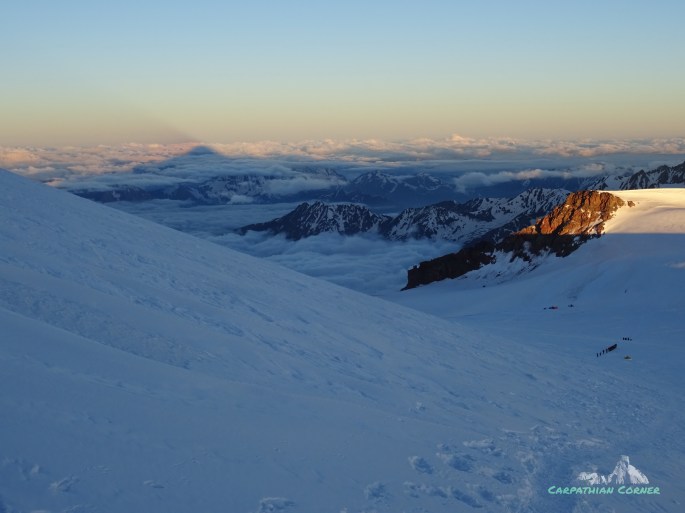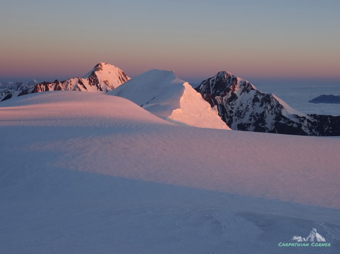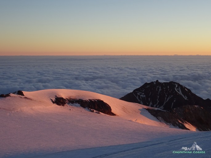 Pe măsură ce se luminează, începe jocul fantastic de culori și reflexii ale răsăritului. Întregul platou al Kazbekului este pictat acum în nuanțe de roz.