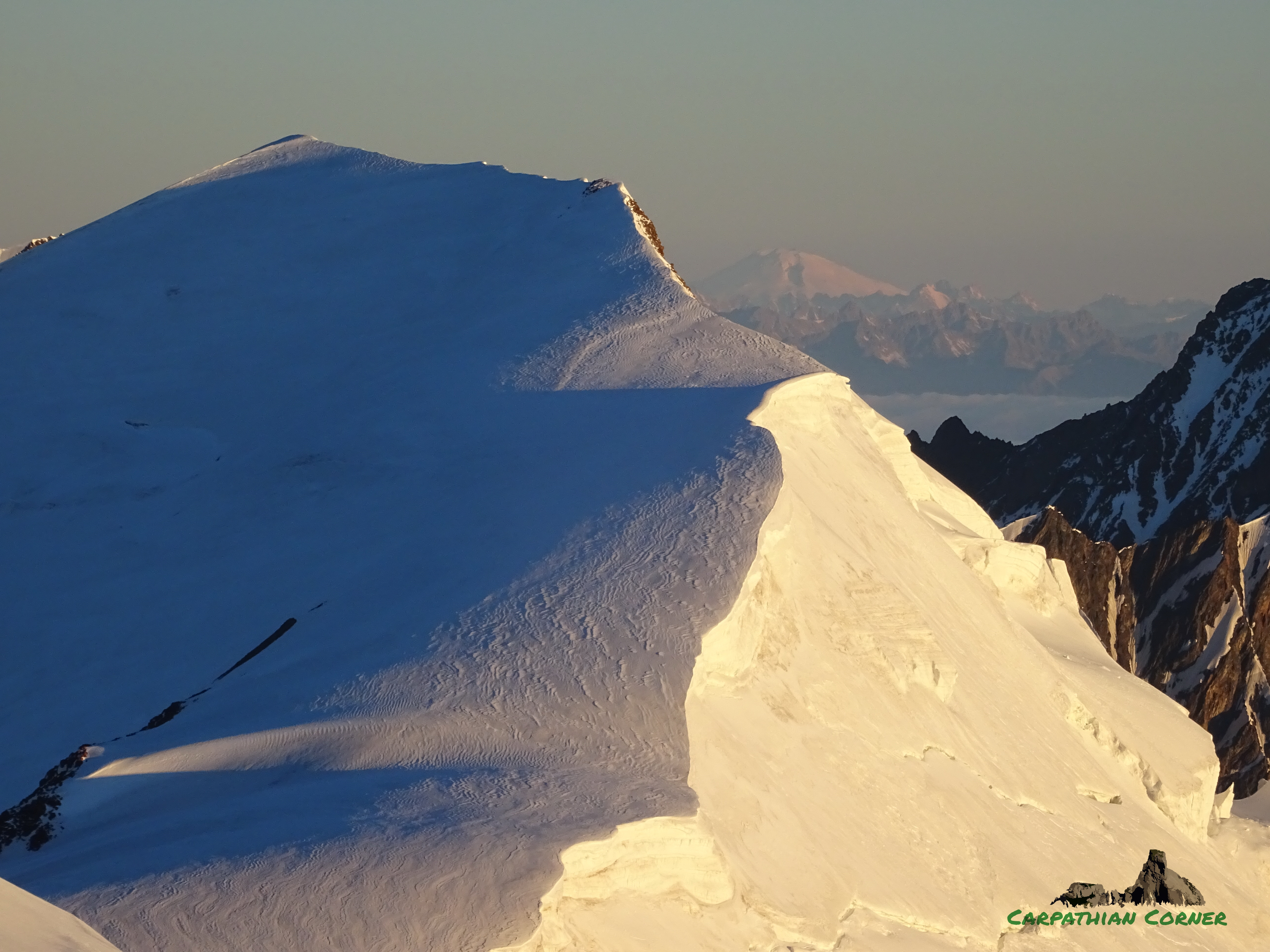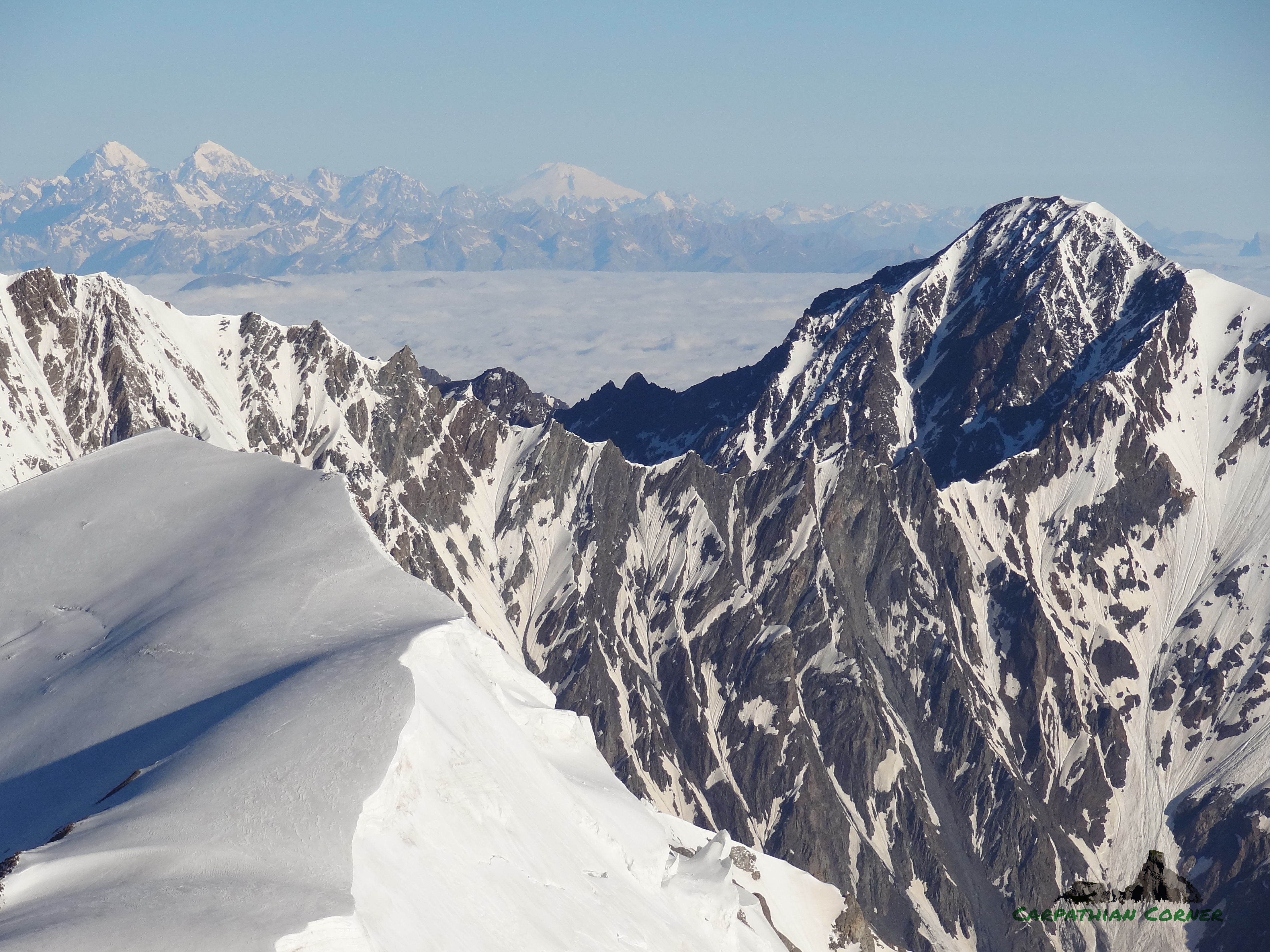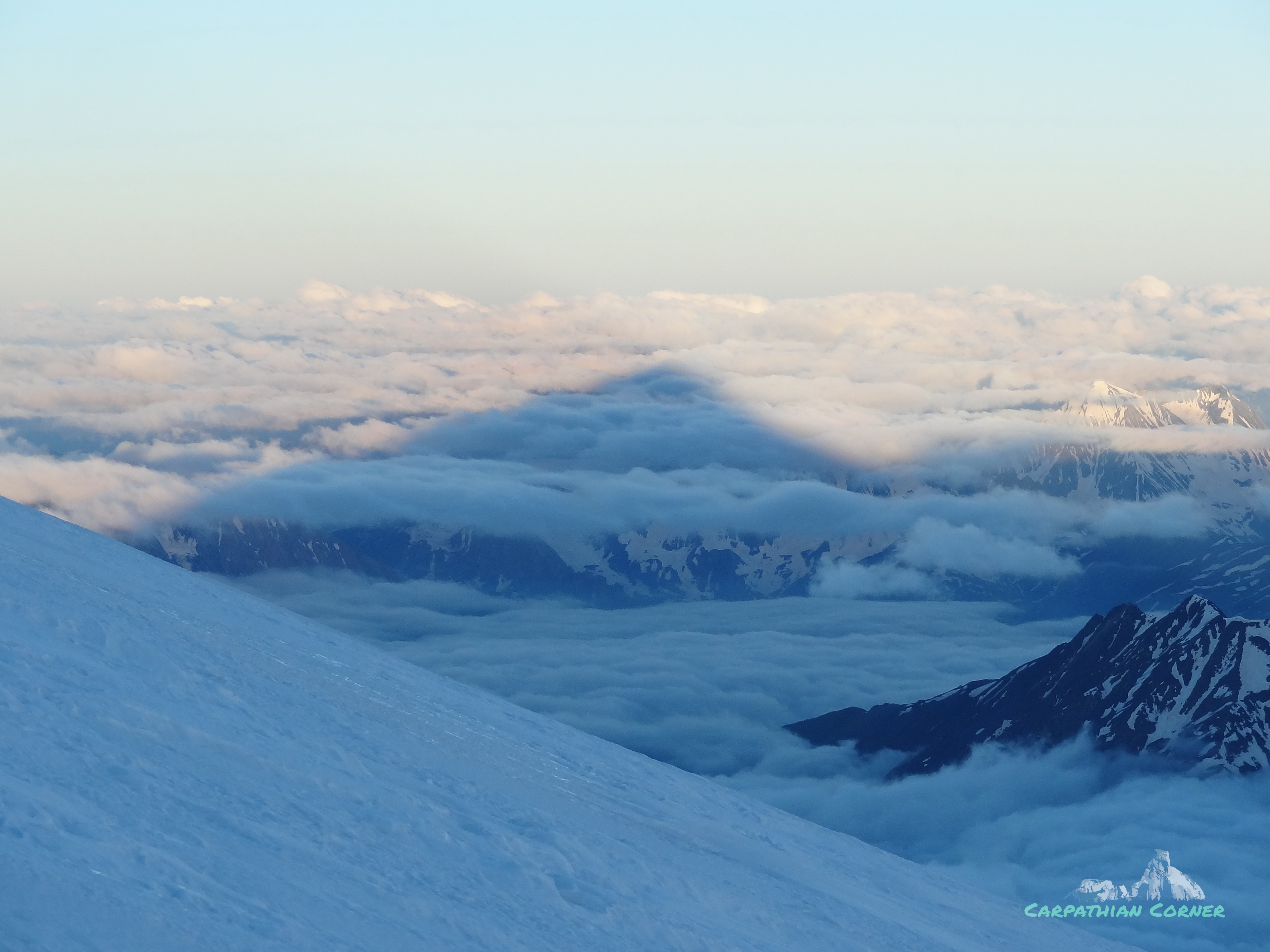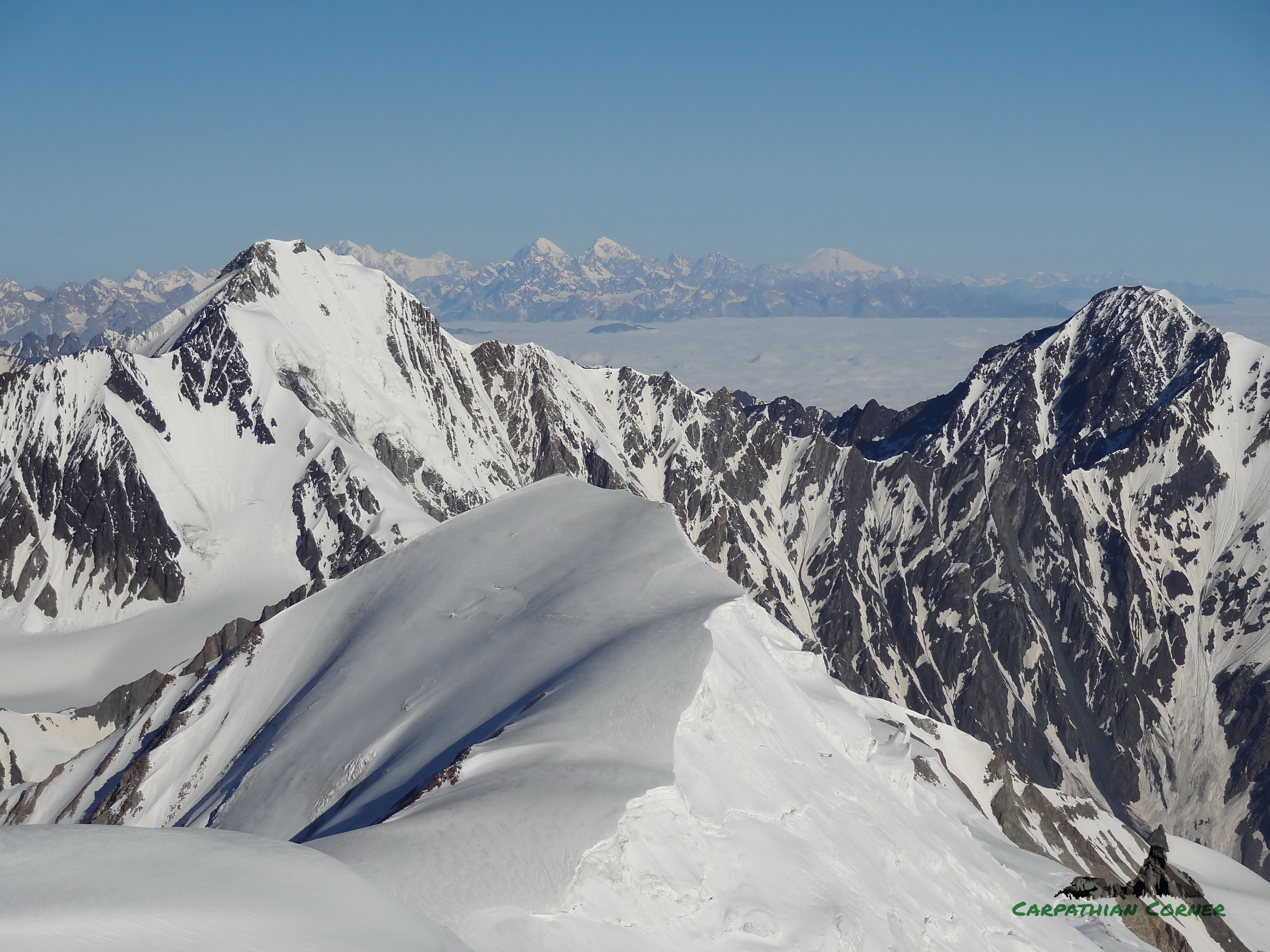 Sînt cuprins de emoție la gîndul că aș putea zări muntele Elbrus. Mă tot uit în spate în timp ce urc, doar doar l-oi vedea. În sfîrșit, dau ochii cu Elbrusul în depărtare, la 200 km distanță de locul în care mă aflam. Visul meu cel mai vechi din viața mea de montaniard capătă acum o consistență deosebită. Mă uit la el și nu-mi vine să cred. Nu-mi vine să cred ce frumos ne primește Kazbekul, permitîndu-ne să vedem pînă în cele mai îndepărtate unghere ale întregului lanț caucazian, în timp ce urcăm spre creștetul său! Las imaginile să vorbească: