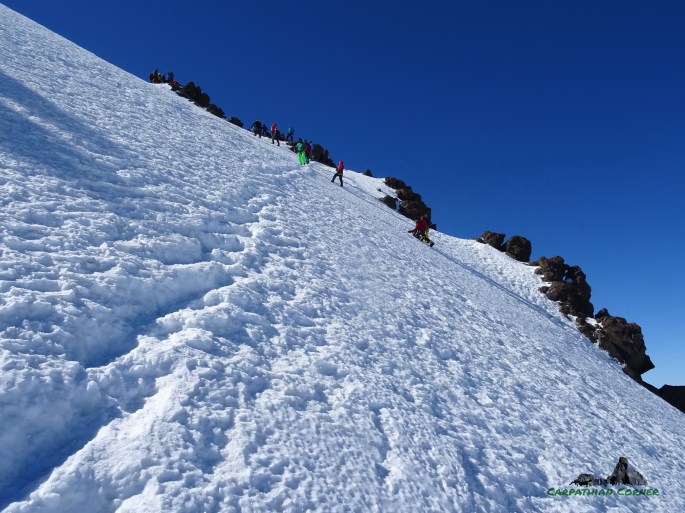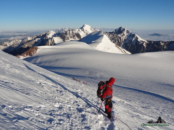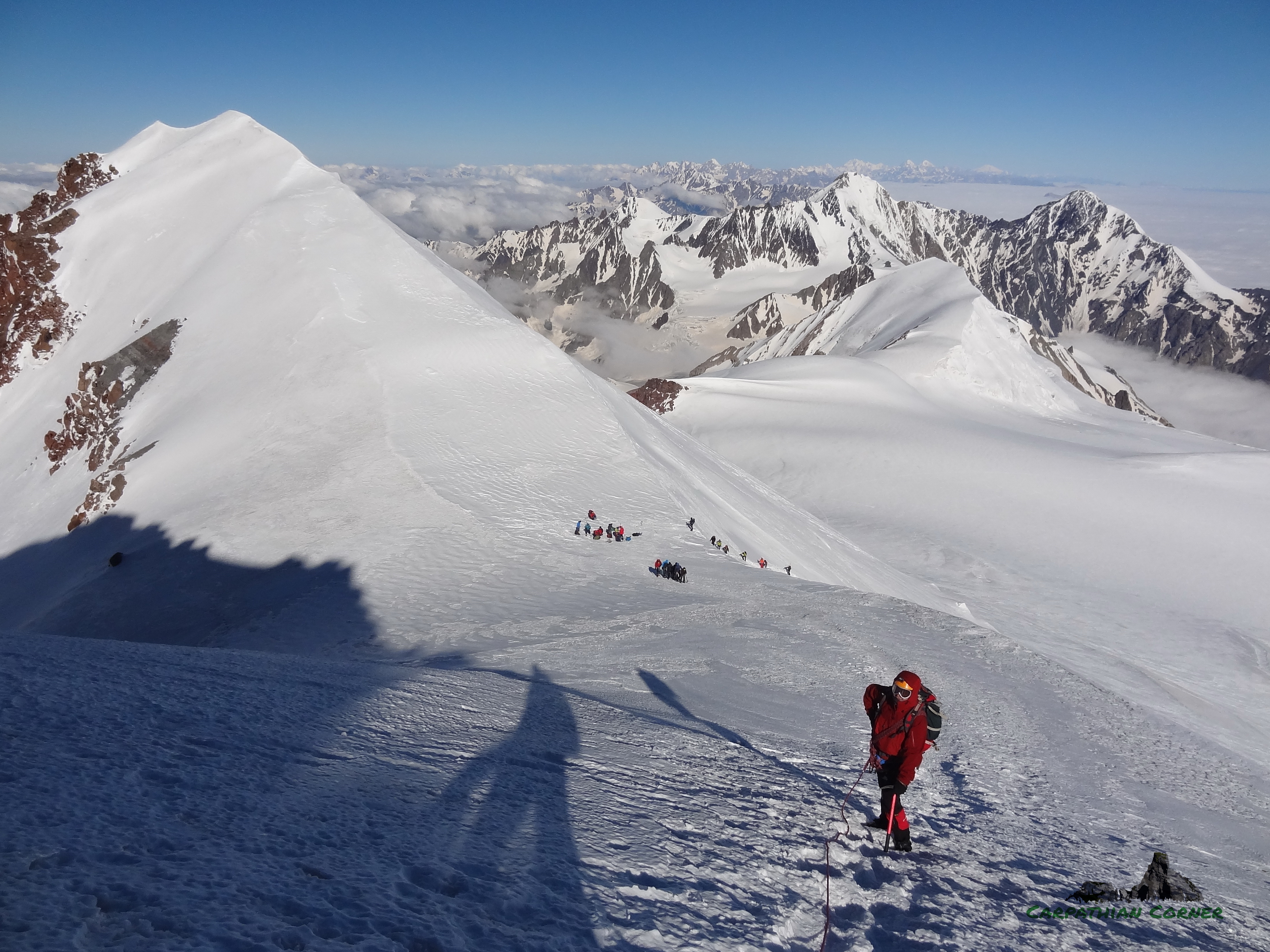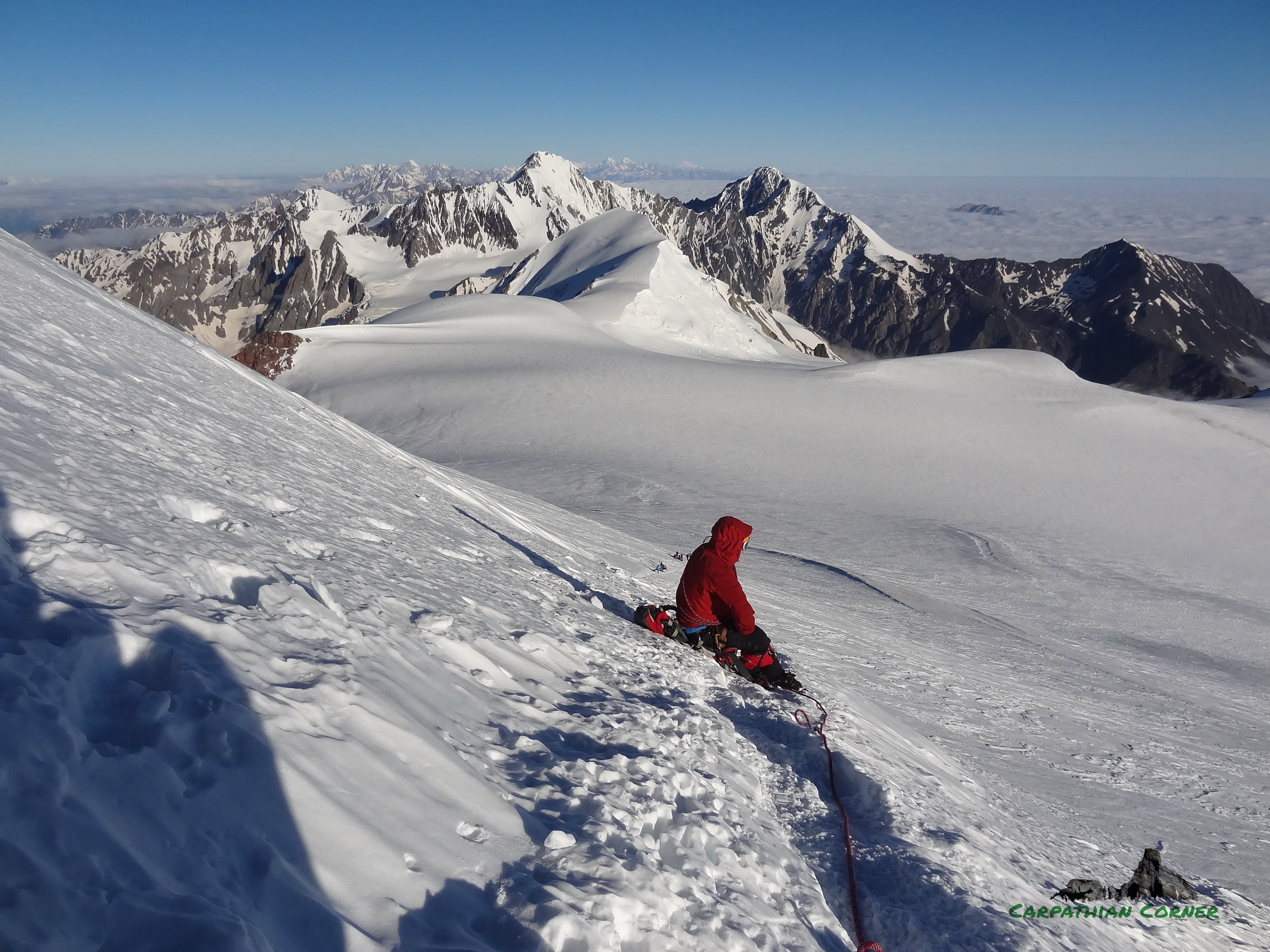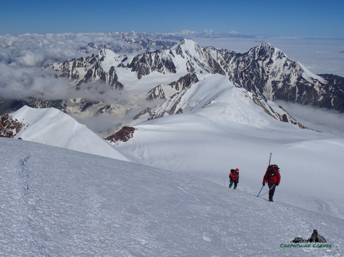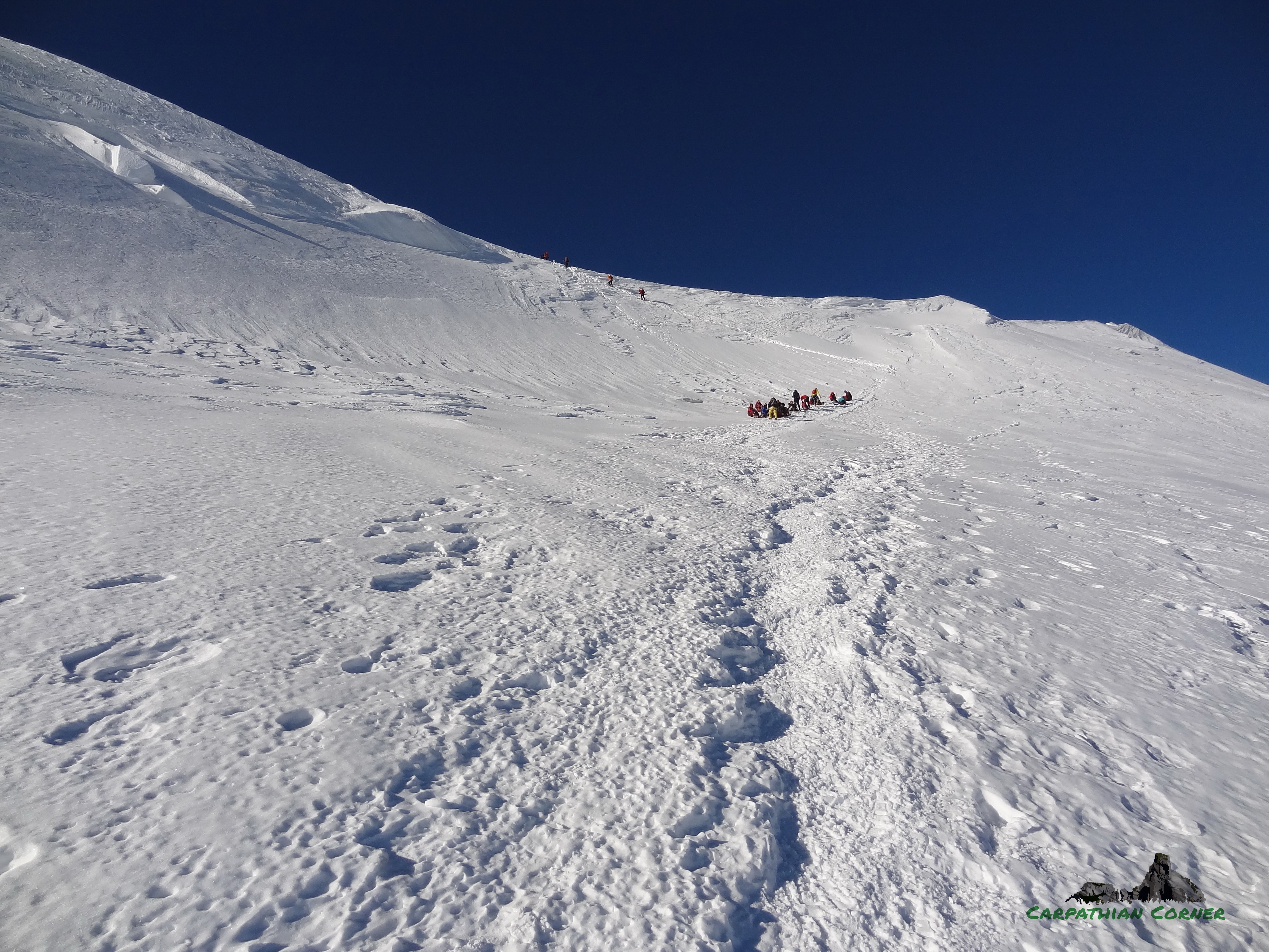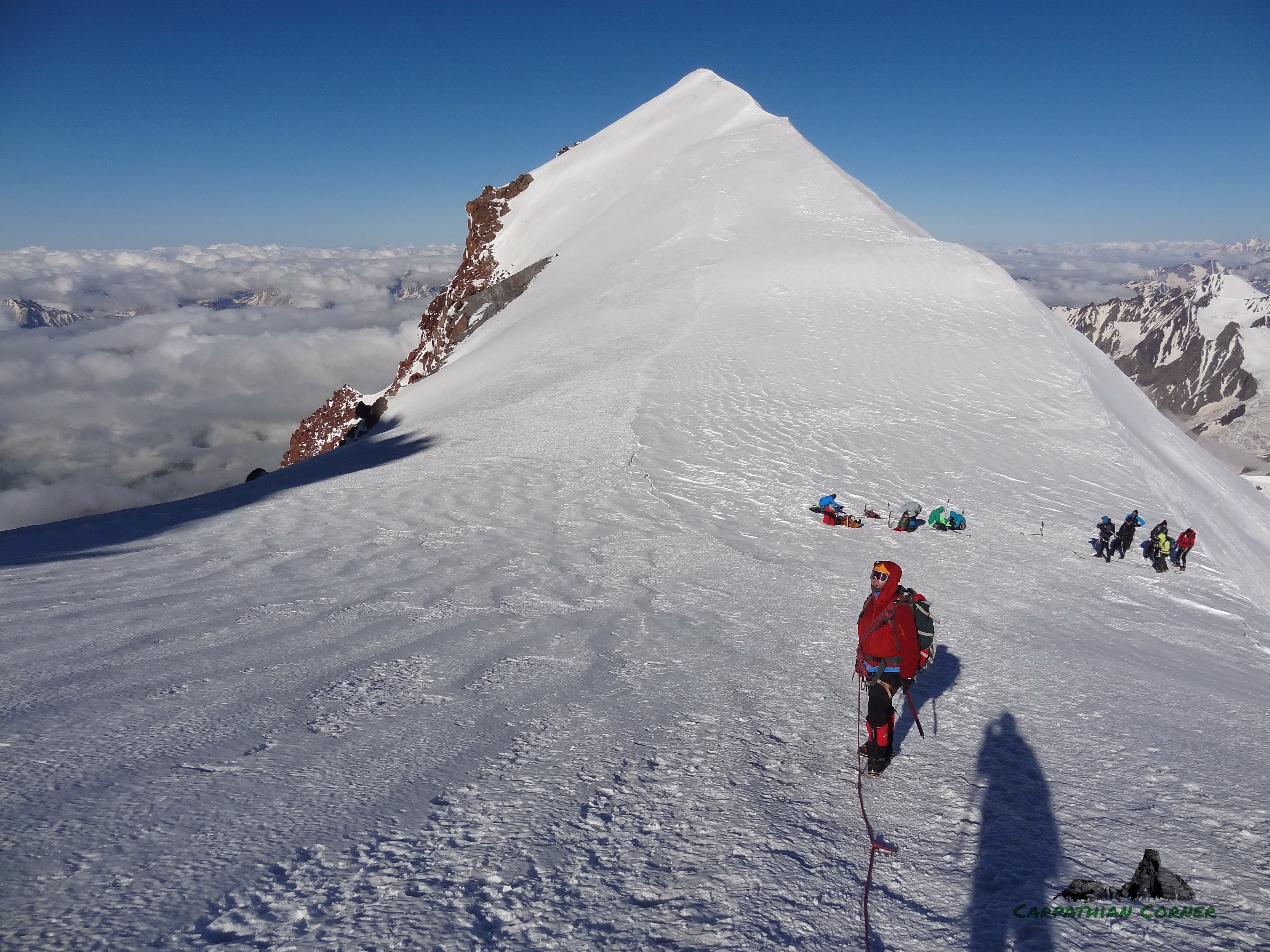 După o pauză de vreo 10 -15 minute începem să urcăm ultimii 200 m care ne mai despart de vîrf. Aceasta este și porțiunea cea mai grea din punct de vedere tehnic: o pantă de aproximativ 40° -45°, acoperită frecvent cu gheață/crustă de gheață. Din șa am observat cum oamenii urcau pe o potecă în cîteva zig zaguri foarte strînse. La început am folosit și noi poteca asta, însă după un timp, am considerat ca e mai bine să atacăm frontal panta, urcînd pieptiș. Și în timp ce făceam treaba asta, vîntul ne bătea fără contenire. Mai avem cîțiva pași și gata, sîntem pe Kazbek la 5033 m altitudine, prima dată cînd ajung la o asemenea altitudine. O bucurie imensă mă cuprinde. În fața mea se desfășoară întregul lanț caucazian, cu toate vîrfurile sale mari pe care le vad ca-n palmă. Mă simt privilegiat de soartă. Mulțumesc lui Dumnezeu și muntelui pentru acest privilegiu. Pentru că , de regulă , vremea aici este foarte imprevizibilă, predominant neprielnică. Chiar si azi, în pofida cerului senin, vîntul bate apring, rece și tăios. Nu putem sta mult timp aici în atari condiții de vînt, așa cum îmi făcusem iluzia ca vom zăbovi pe vîrf o oră, după cum ne e obiceiul. Plecăm dupa un sfert de oră, cam în același timp cu ceilalți.
