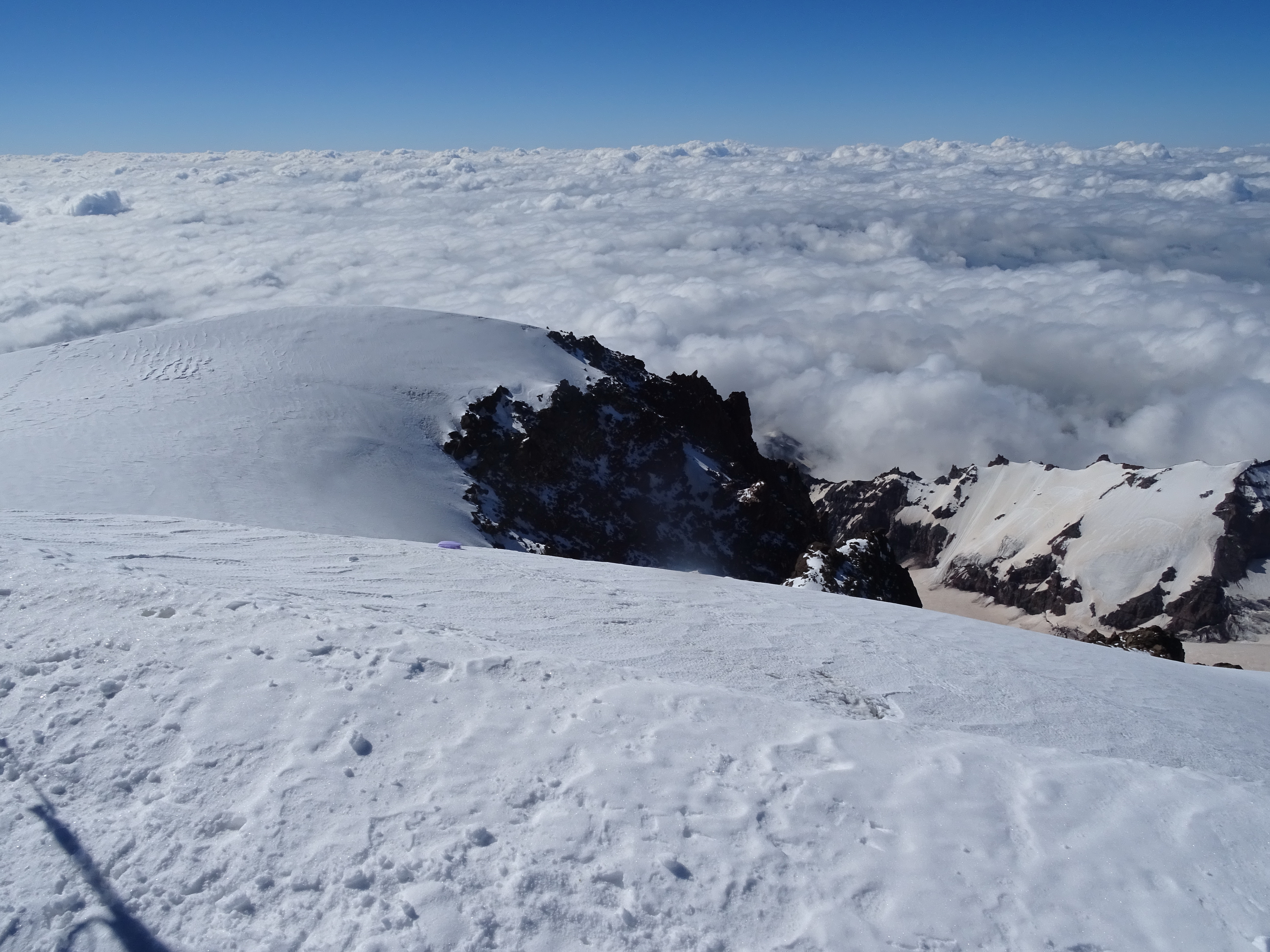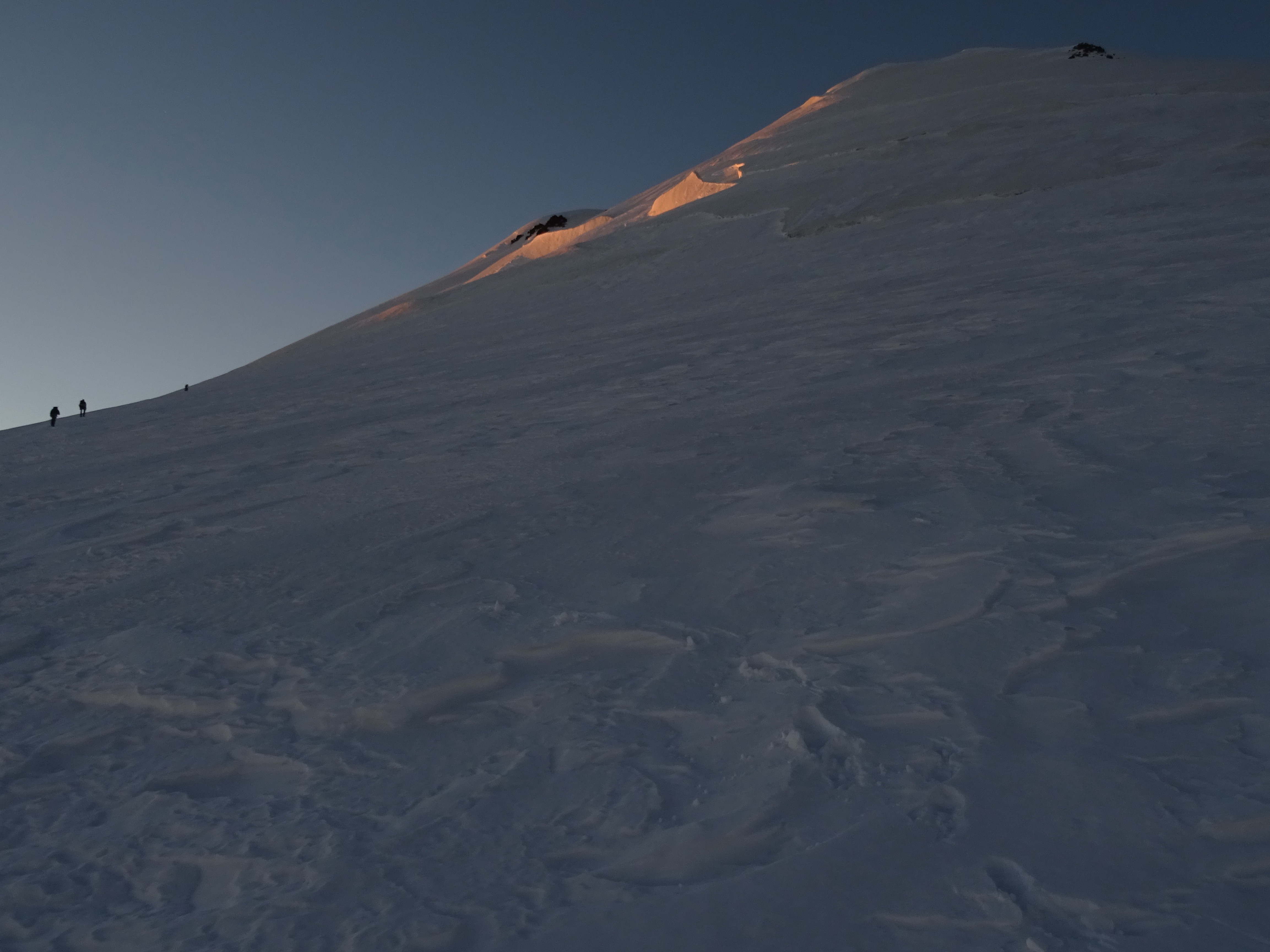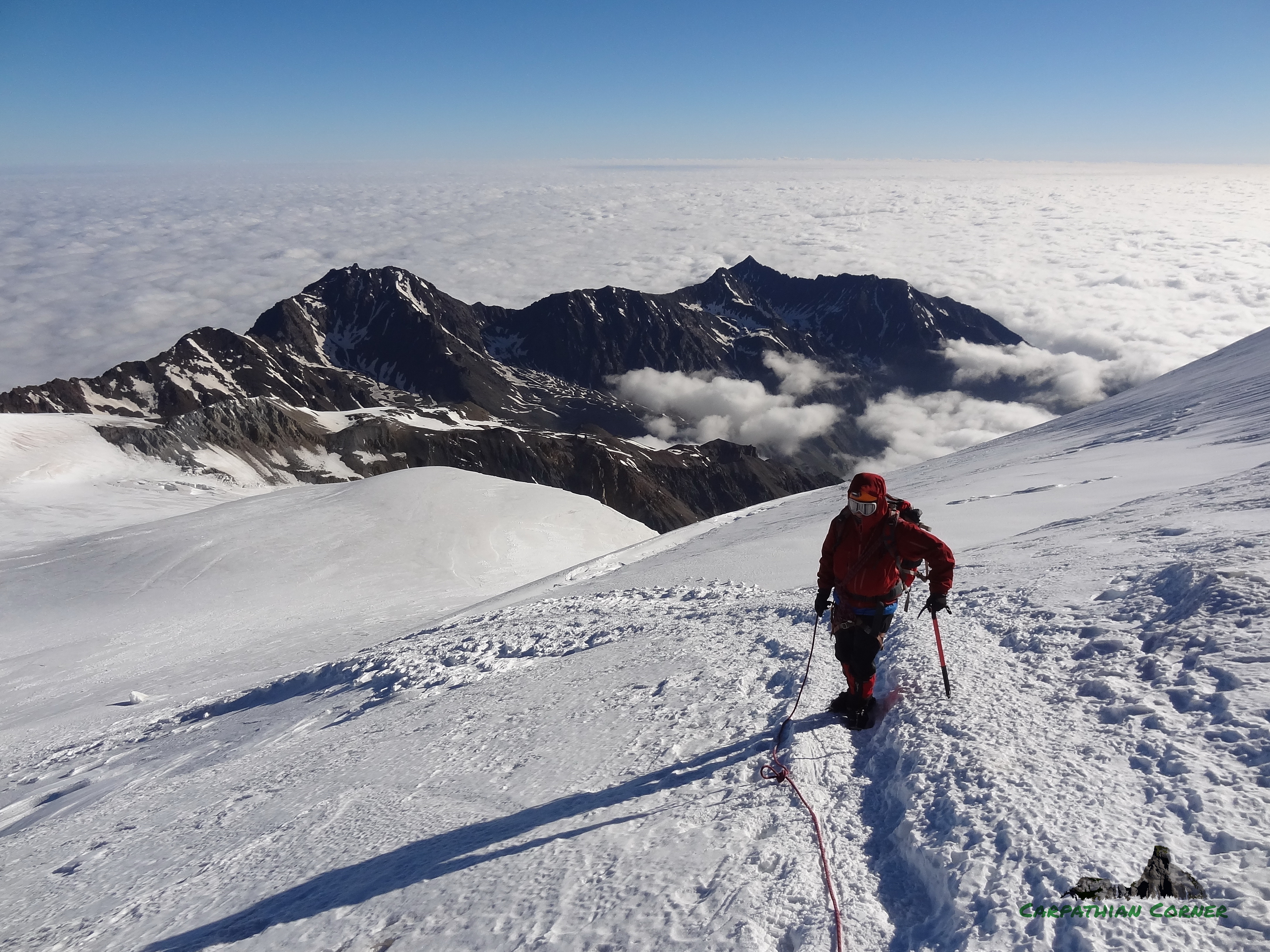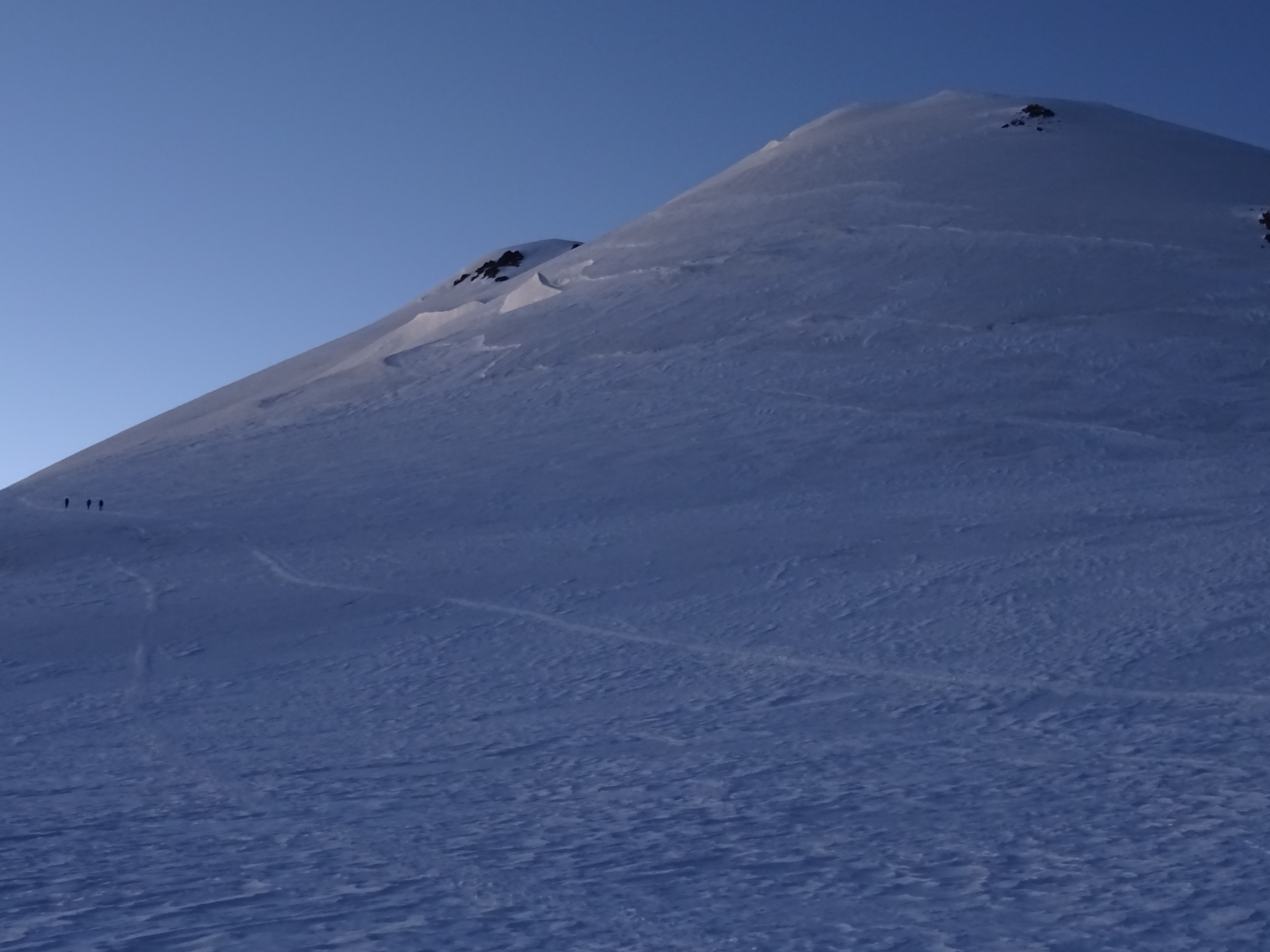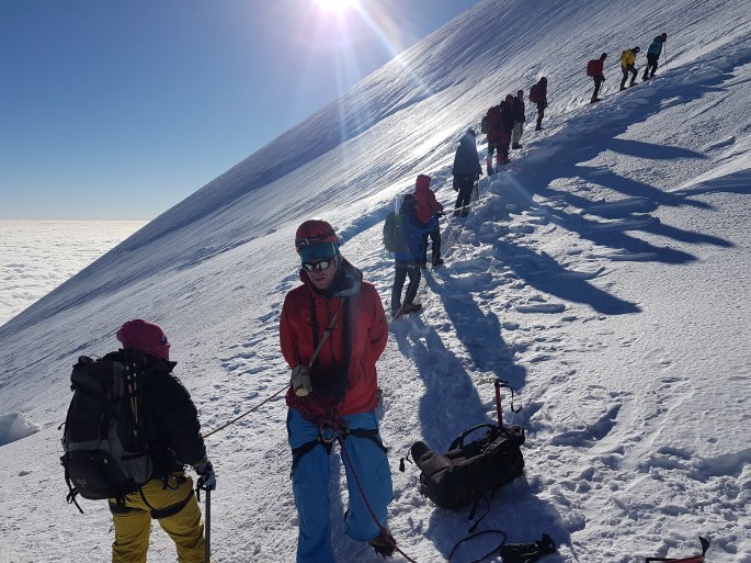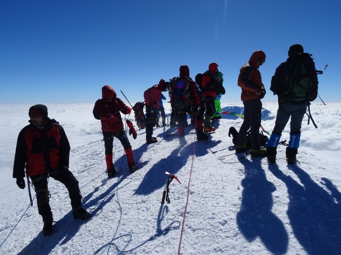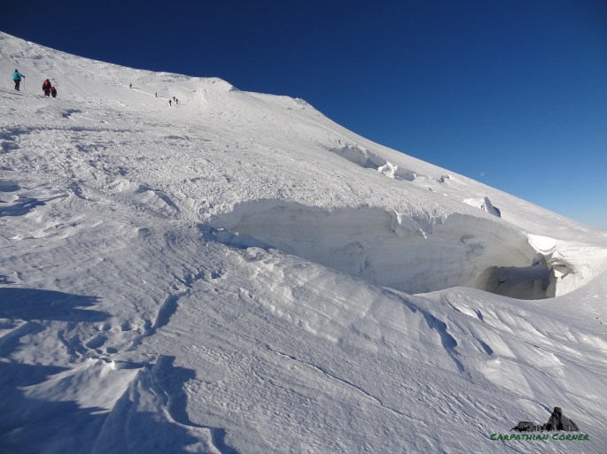 După o pauză de vreo 10 -15 minute începem să urcăm ultimii 200 m care ne mai despart de vîrf. Aceasta este și porțiunea cea mai grea din punct de vedere tehnic: o pantă de aproximativ 40° -45°, acoperită frecvent cu gheață/crustă de gheață. Din șa am observat cum oamenii urcau pe o potecă în cîteva zig zaguri foarte strînse. La început am folosit și noi poteca asta, însă după un timp, am considerat ca e mai bine să atacăm frontal panta, urcînd pieptiș. Și în timp ce făceam treaba asta, vîntul ne bătea fără contenire. Mai avem cîțiva pași și gata, sîntem pe Kazbek la 5033 m altitudine, prima dată cînd ajung la o asemenea altitudine. O bucurie imensă mă cuprinde. În fața mea se desfășoară întregul lanț caucazian, cu toate vîrfurile sale mari pe care le vad ca-n palmă. Mă simt privilegiat de soartă. Mulțumesc lui Dumnezeu și muntelui pentru acest privilegiu. Pentru că , de regulă , vremea aici este foarte imprevizibilă, predominant neprielnică. Chiar si azi, în pofida cerului senin, vîntul bate apring, rece și tăios. Nu putem sta mult timp aici în atari condiții de vînt, așa cum îmi făcusem iluzia ca vom zăbovi pe vîrf o oră, după cum ne e obiceiul. Plecăm dupa un sfert de oră, cam în același timp cu ceilalți.