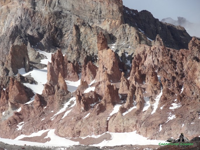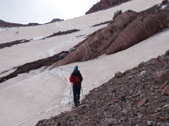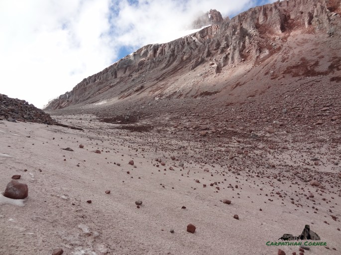 Pe măsură ce urcăm în altitudine, panta devine tot mai accentuată și poteca tot mai expusă, în stînga noastră căscîndu-se un mare hău alb. Facem pauze dese, pentru odihnă, alimentare și poze.