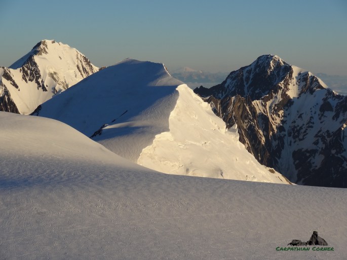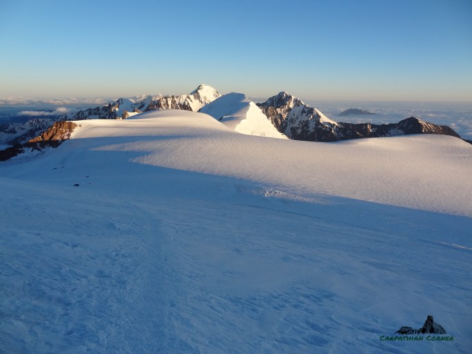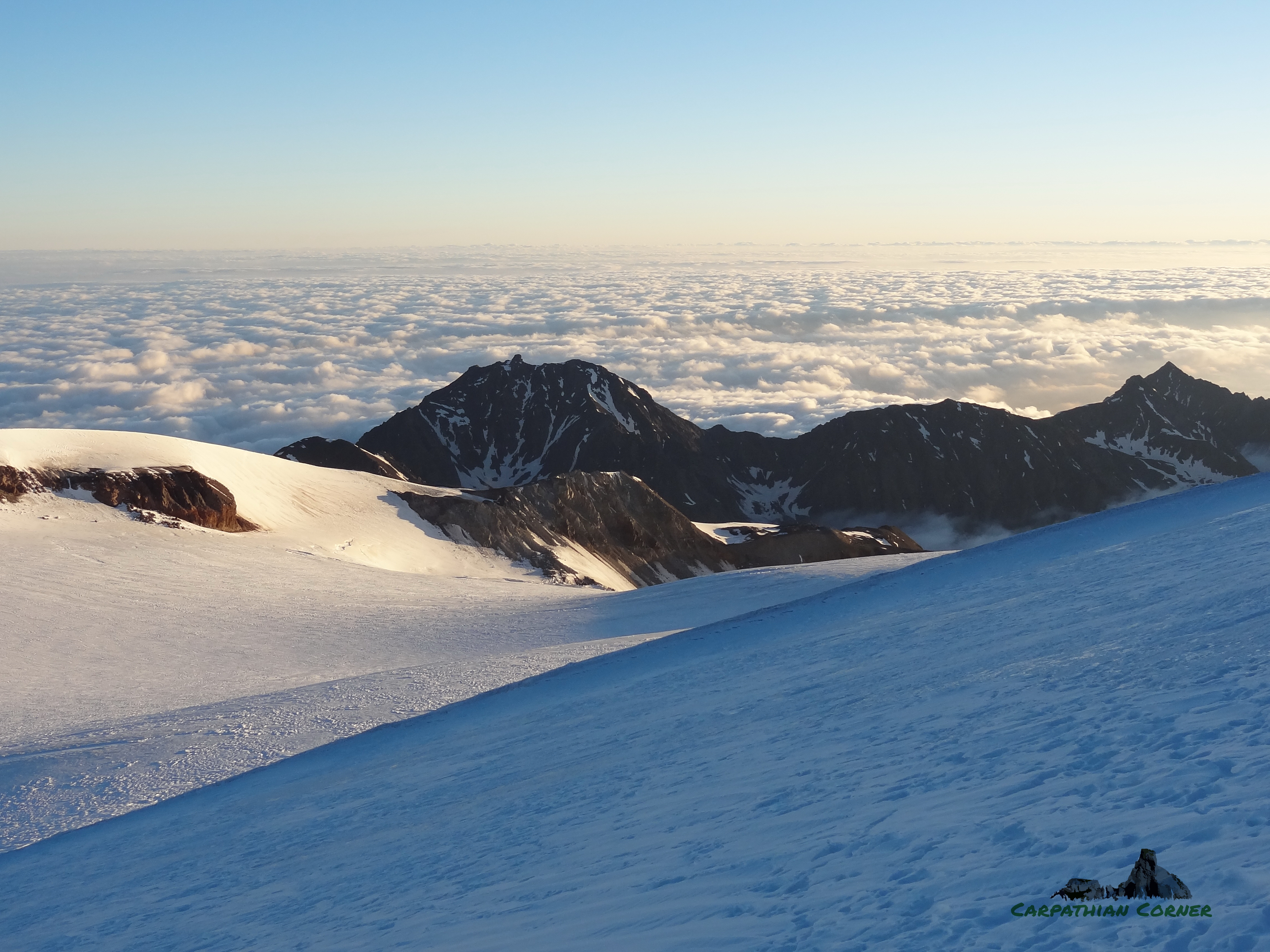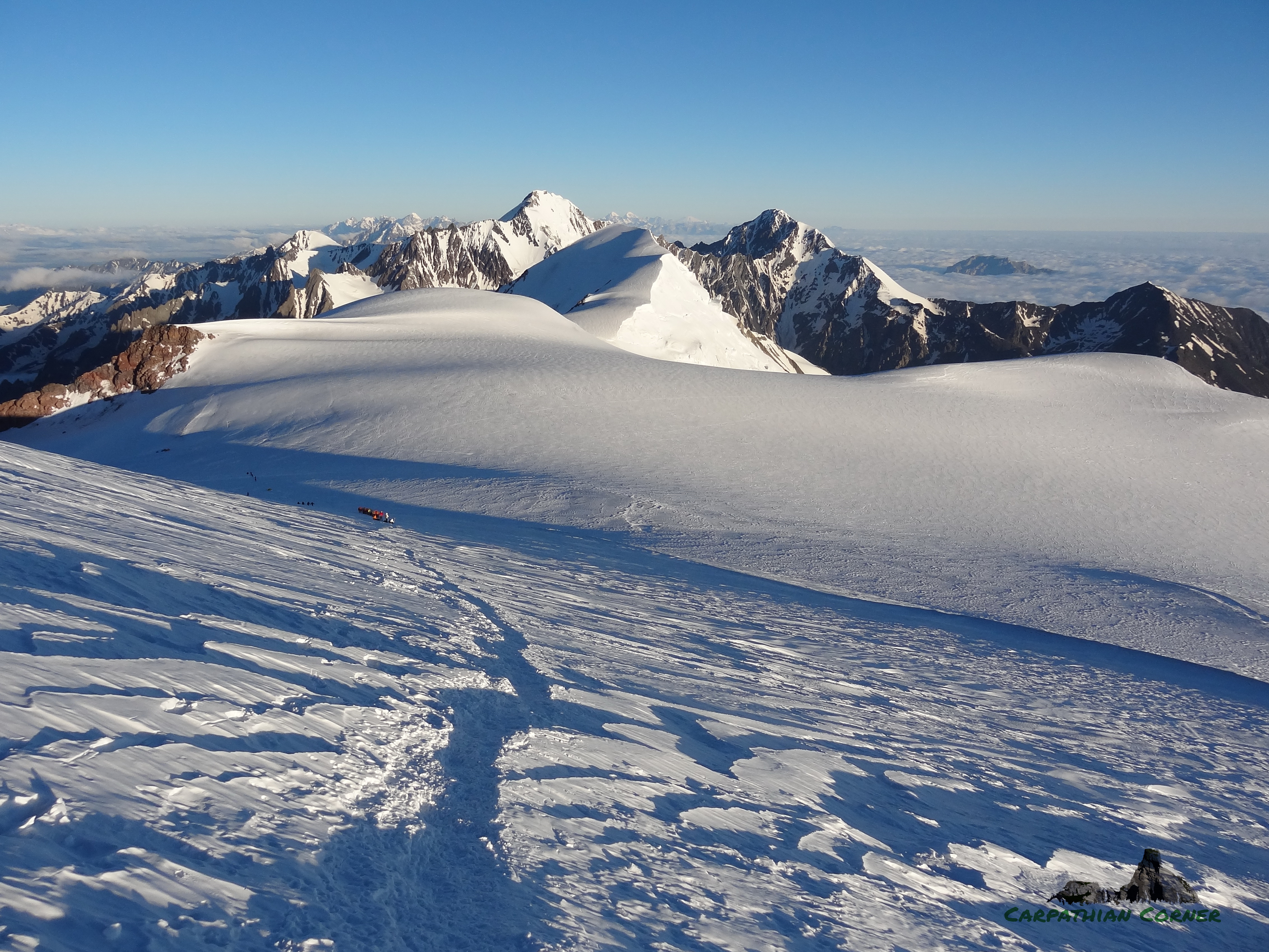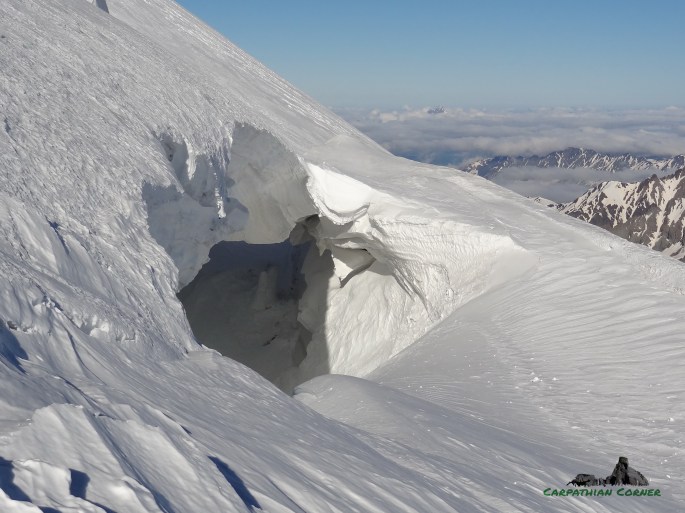 Dacă pînă în șaua dintre cele două vîrfuri ale Kazbekului nu prea s-a făcut simțit vîntul, ei bine, cînd am ajuns acolo, am intrat în bătaia sa directă. Cît timp am făcut popas aici, am stat de vorbă cu un ghid georgian ce însoțea un grup de aproximativ 6 -7 persoane. Ne-a arătat cu bucurie și din proprie inițiativă vîrfurile mari ale Caucazului: Dykh Tau, Koshtan Tau, Shkara, Bezengi, Ushba. Cînd a aflat că venim din Romania, ne- a întrebat dacă nu-l cunoaștem pe ghidul montan Marian Anghel. Ce mică e lumea, mi-am zis. Sigur că-l cunoșteam, doar am participat un curs de alpinism hivernal organizat de el, în urmă cu mulți ani. Ne-a rugat să-i transmitem salutări din partea lui, lucru pe care l-am și făcut de altfel, fără a-i preciza numele însă, întrucît nu mi l-am mai amintit.