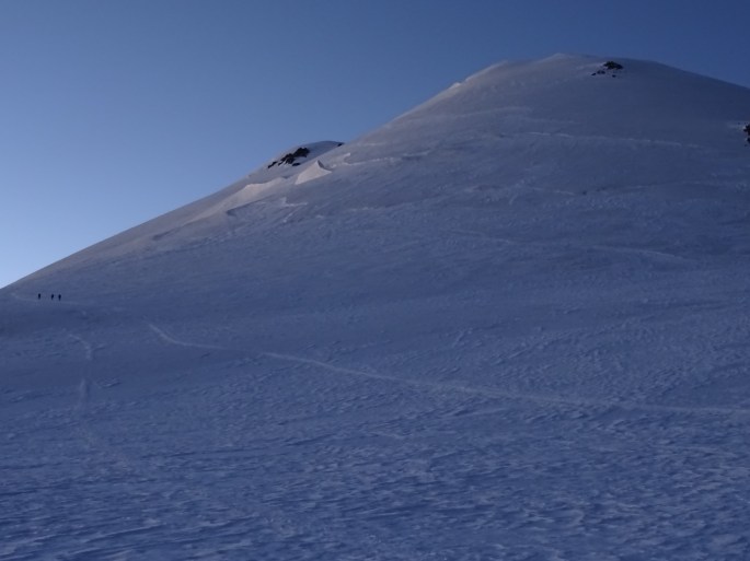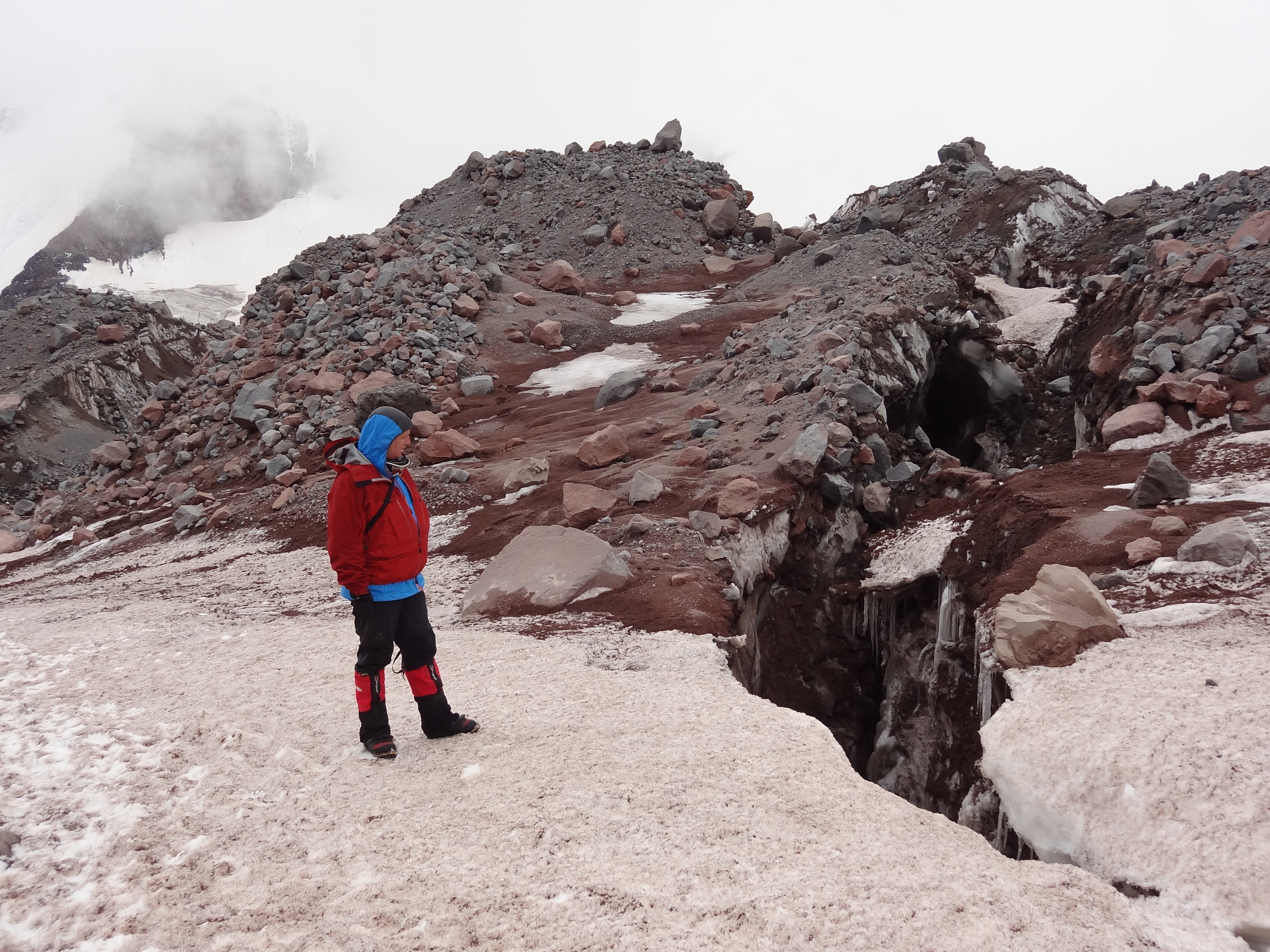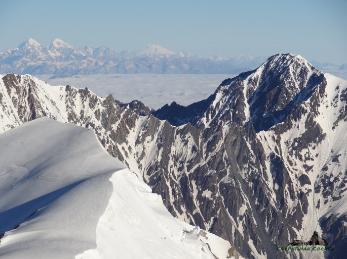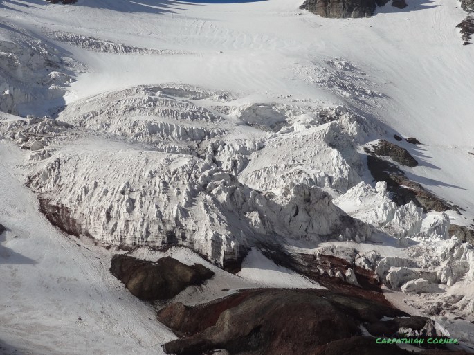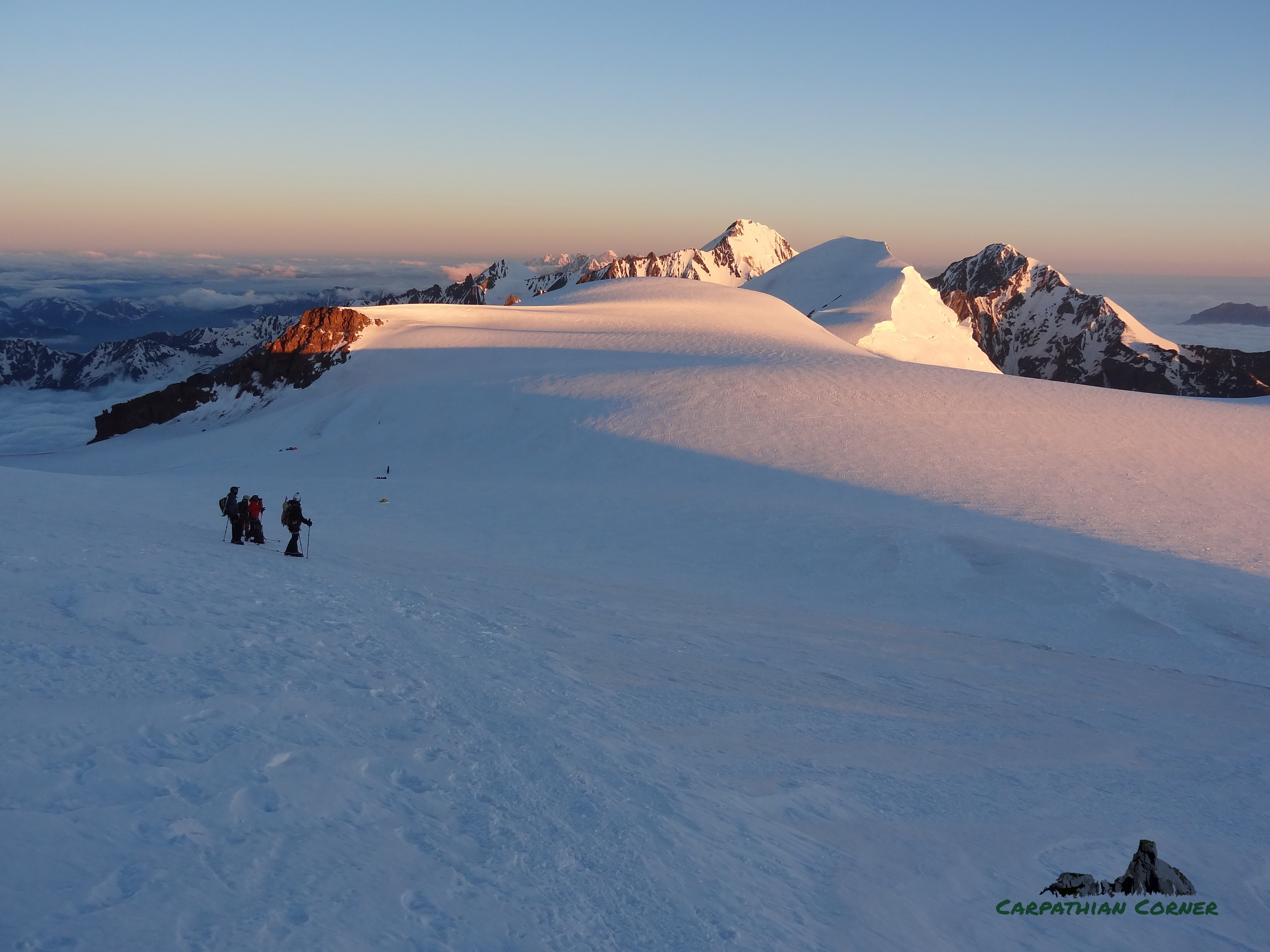 Dacă pînă în șaua dintre cele două vîrfuri ale Kazbekului nu prea s-a făcut simțit vîntul, ei bine, cînd am ajuns acolo, am intrat în bătaia sa directă. Cît timp am făcut popas aici, am stat de vorbă cu un ghid georgian ce însoțea un grup de aproximativ 6 -7 persoane. Ne-a arătat cu bucurie și din proprie inițiativă vîrfurile mari ale Caucazului: Dykh Tau, Koshtan Tau, Shkara, Bezengi, Ushba. Cînd a aflat că venim din Romania, ne- a întrebat dacă nu-l cunoaștem pe ghidul montan Marian Anghel. Ce mică e lumea, mi-am zis. Sigur că-l cunoșteam, doar am participat un curs de alpinism hivernal organizat de el, în urmă cu mulți ani. Ne-a rugat să-i transmitem salutări din partea lui, lucru pe care l-am și făcut de altfel, fără a-i preciza numele însă, întrucît nu mi l-am mai amintit.