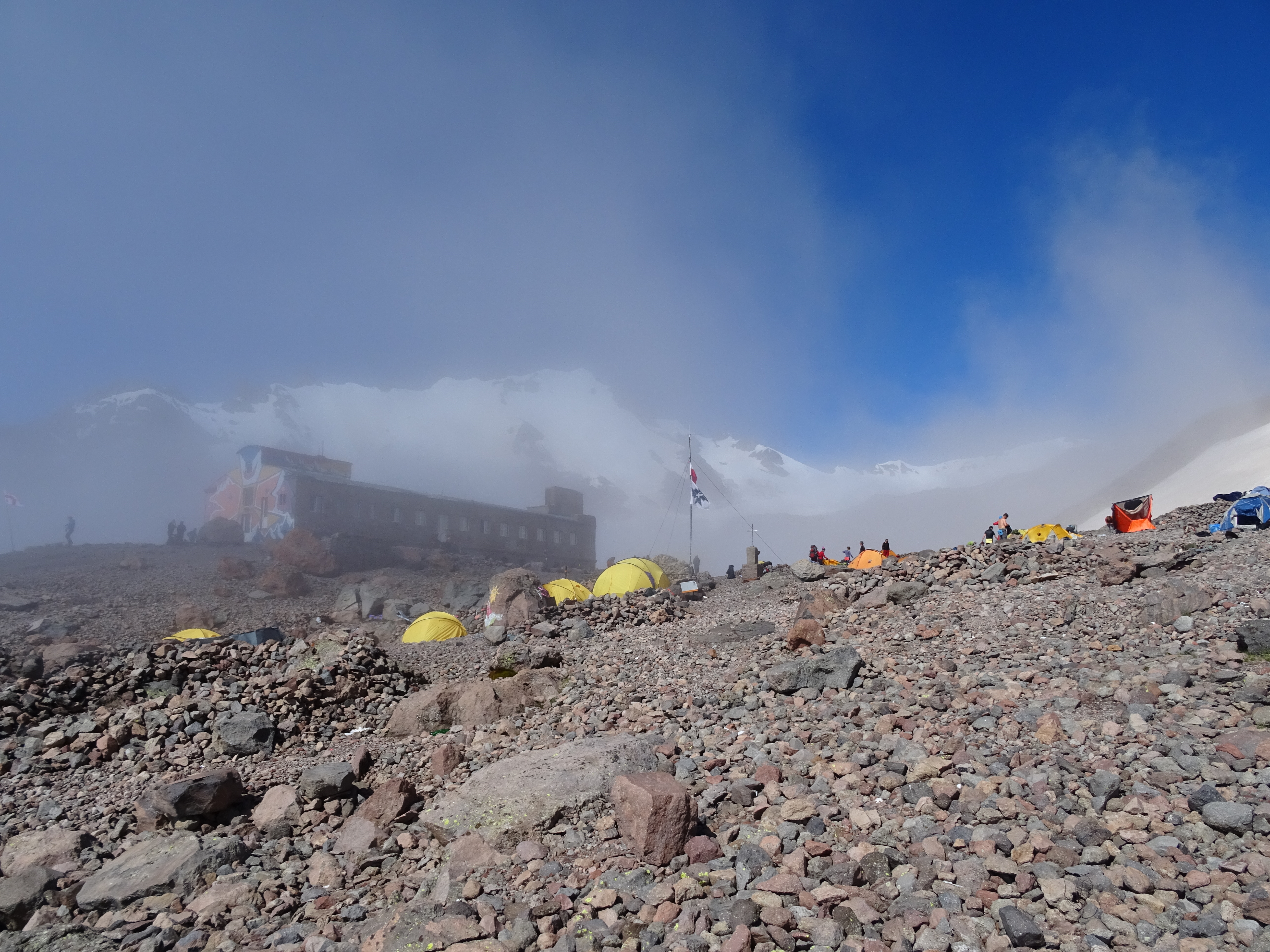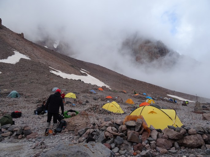 S-a făcut și ceasul cînd trebuie să ne îndreptăm spre cortul nostru din ABC. Bielorușii erau voioși nevoie mare și sărbătoreau la cort reușita lor pe vîrf. Acum e rîndul lor să facă liniște ca să ne putem odihni; oricum, nu peste mult timp vor pleca la vale. Nu reușim decît să ne relaxam stînd lungiți.