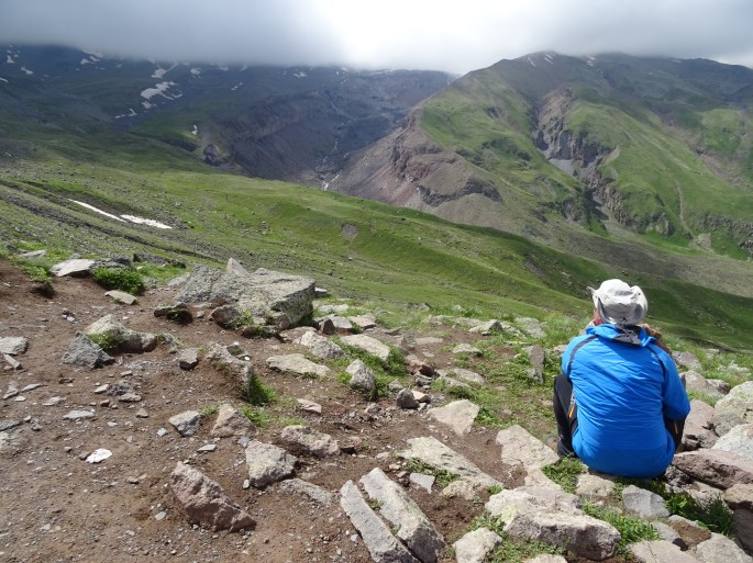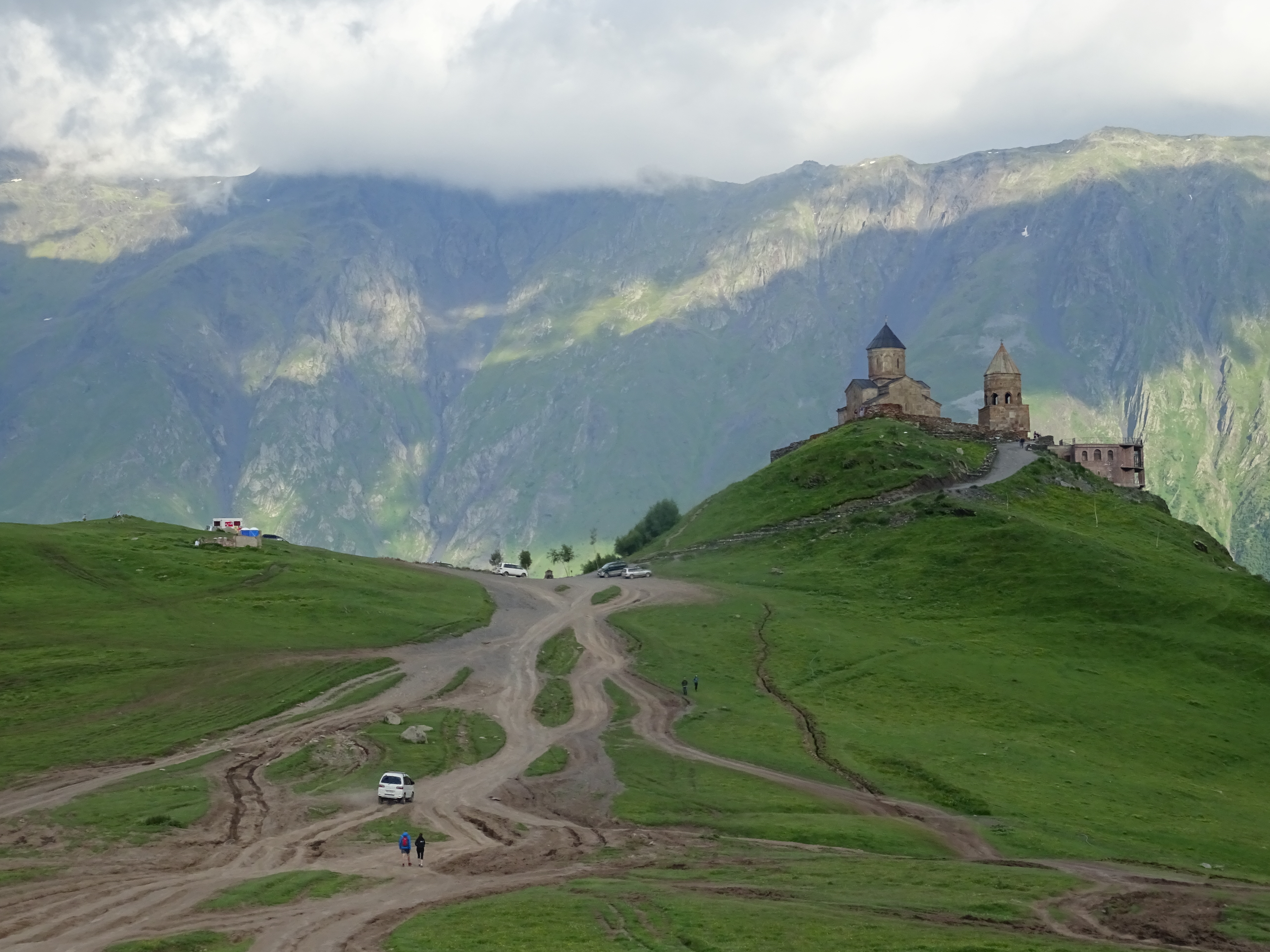 Din șaua Arsha și pînă la mănăstirea Stepansminda nu mai urmăm calea pe care am venit, ci continuăm spre stînga, pe o potecă pe care am vazut că o foloseau cărăușii cu caii lor.